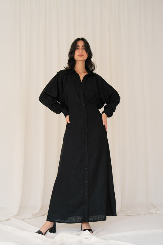 Linen Flow Shirt Dress in Black