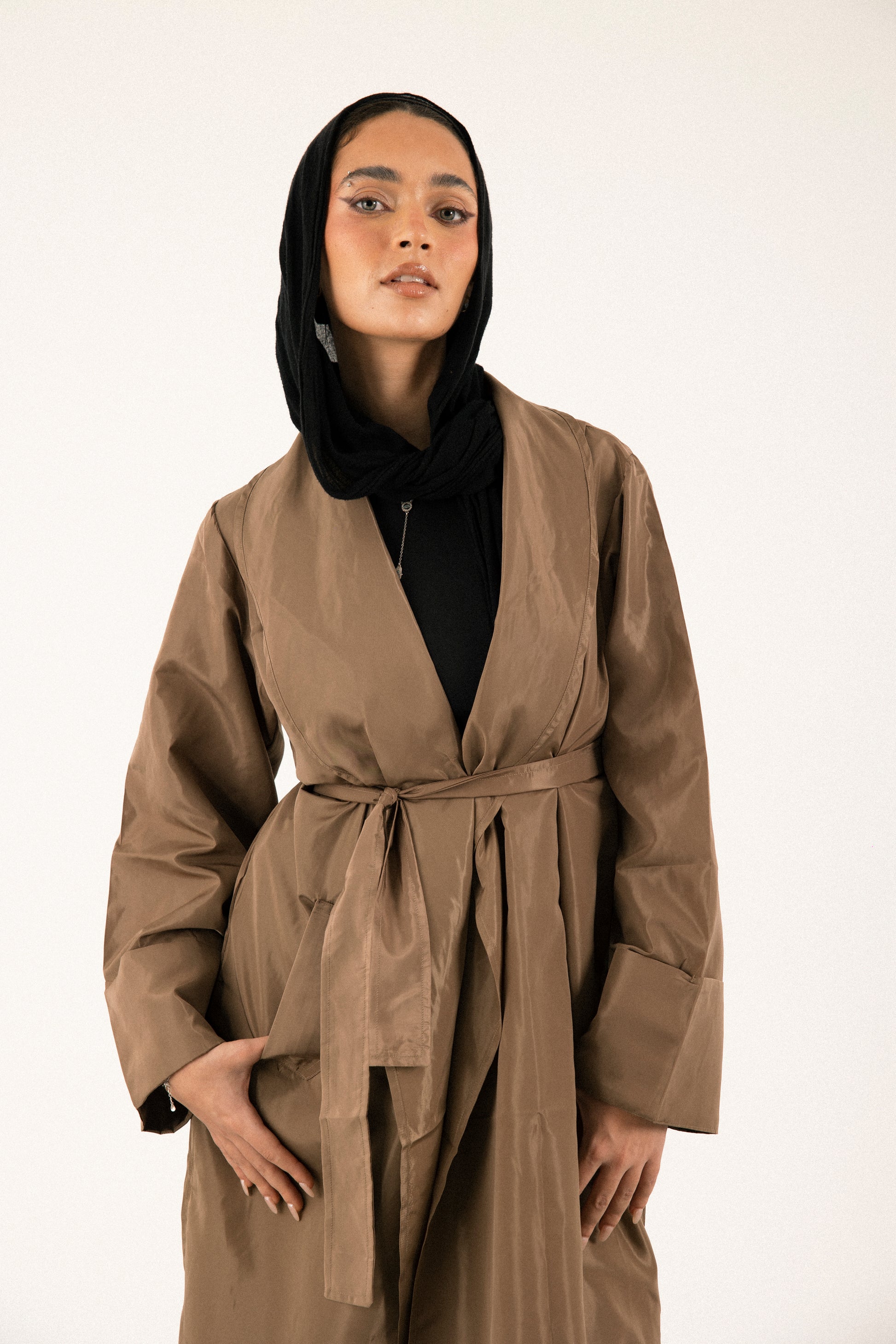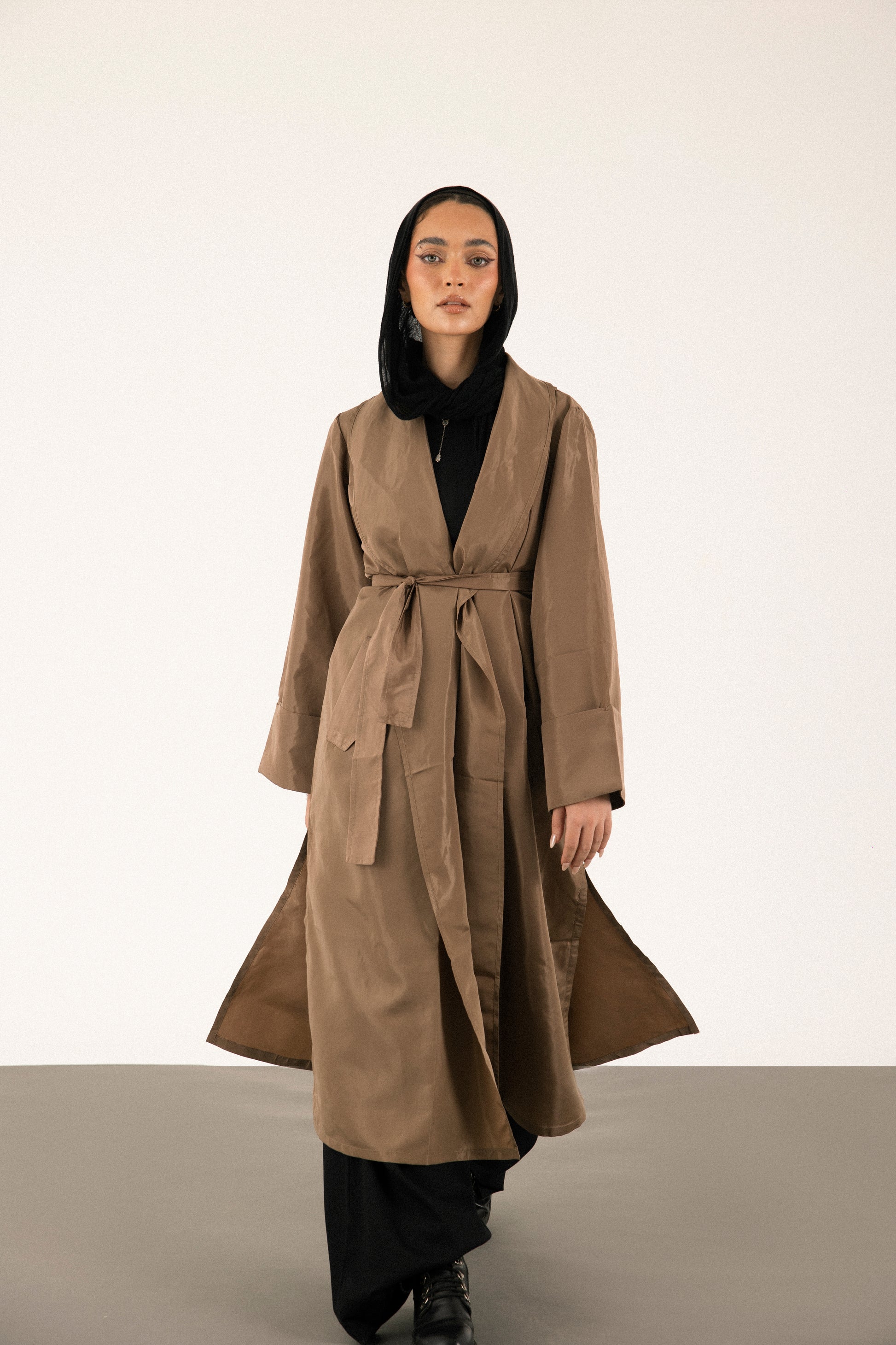 - Crafted for comfort and functionality, it features spacious pockets and an external belt to cinch the waist for a flattering silhouette.