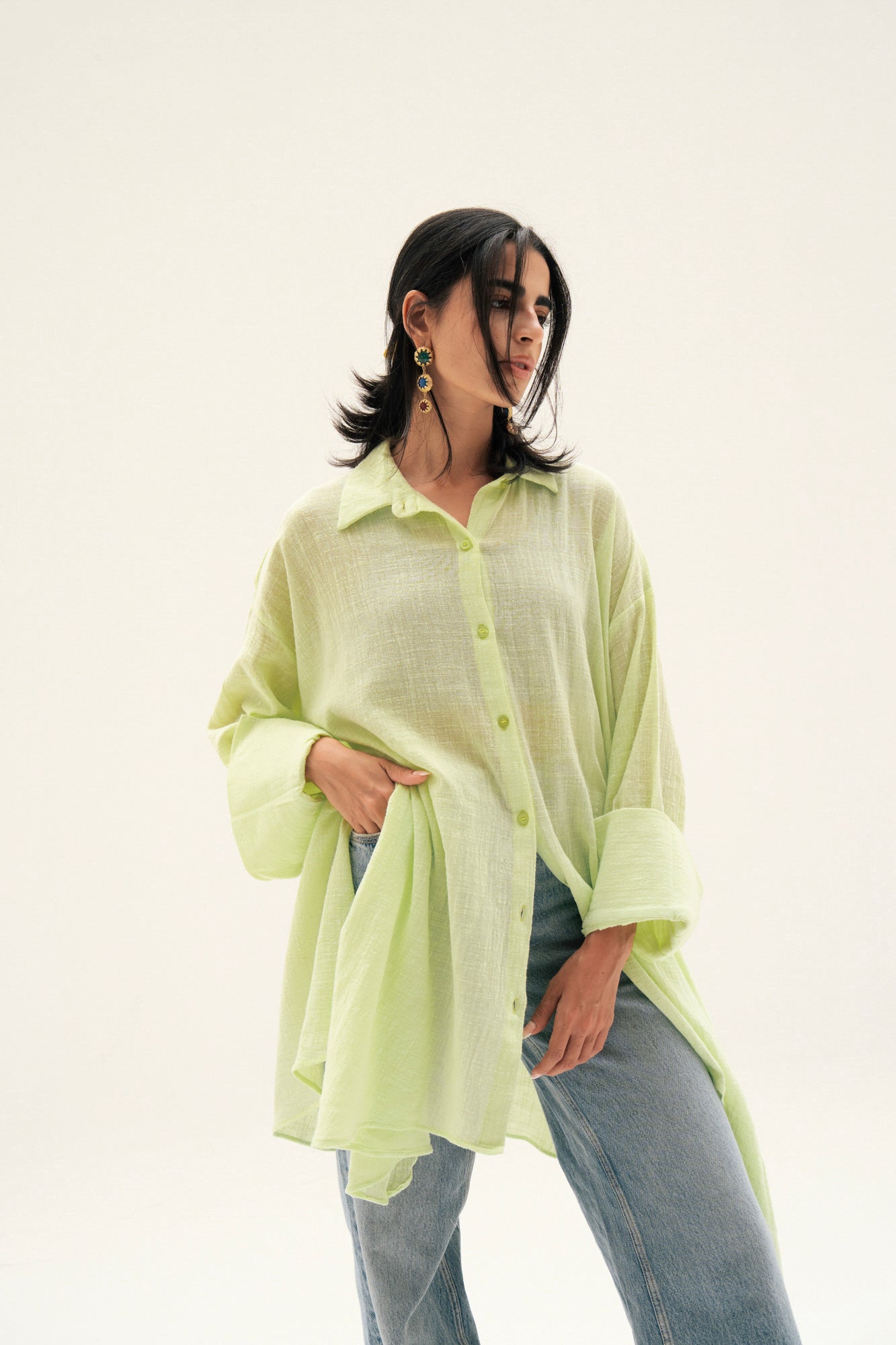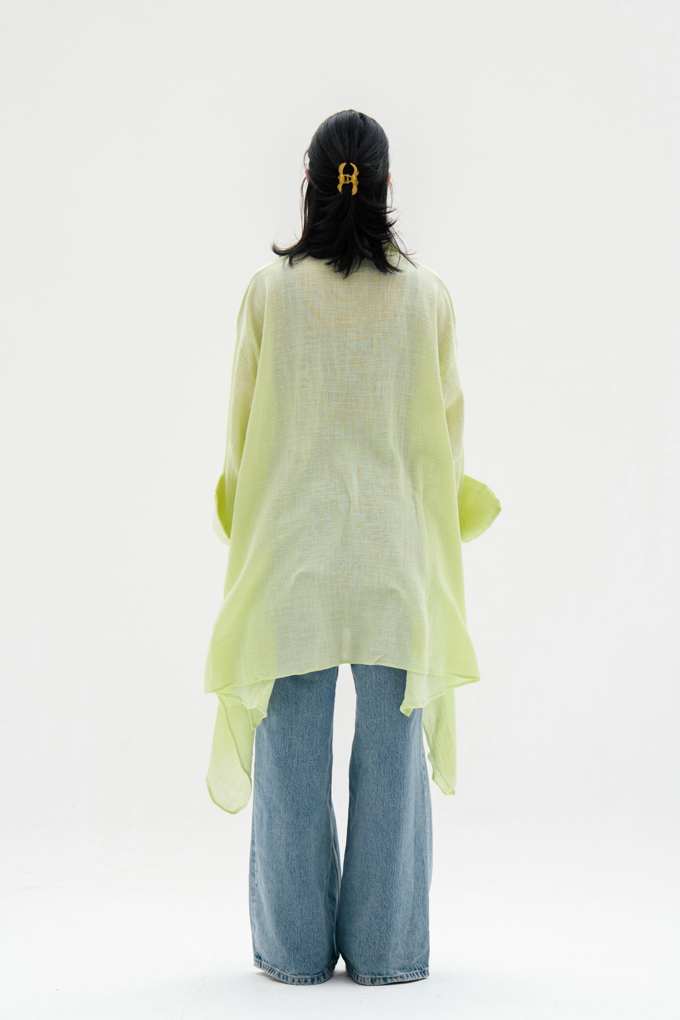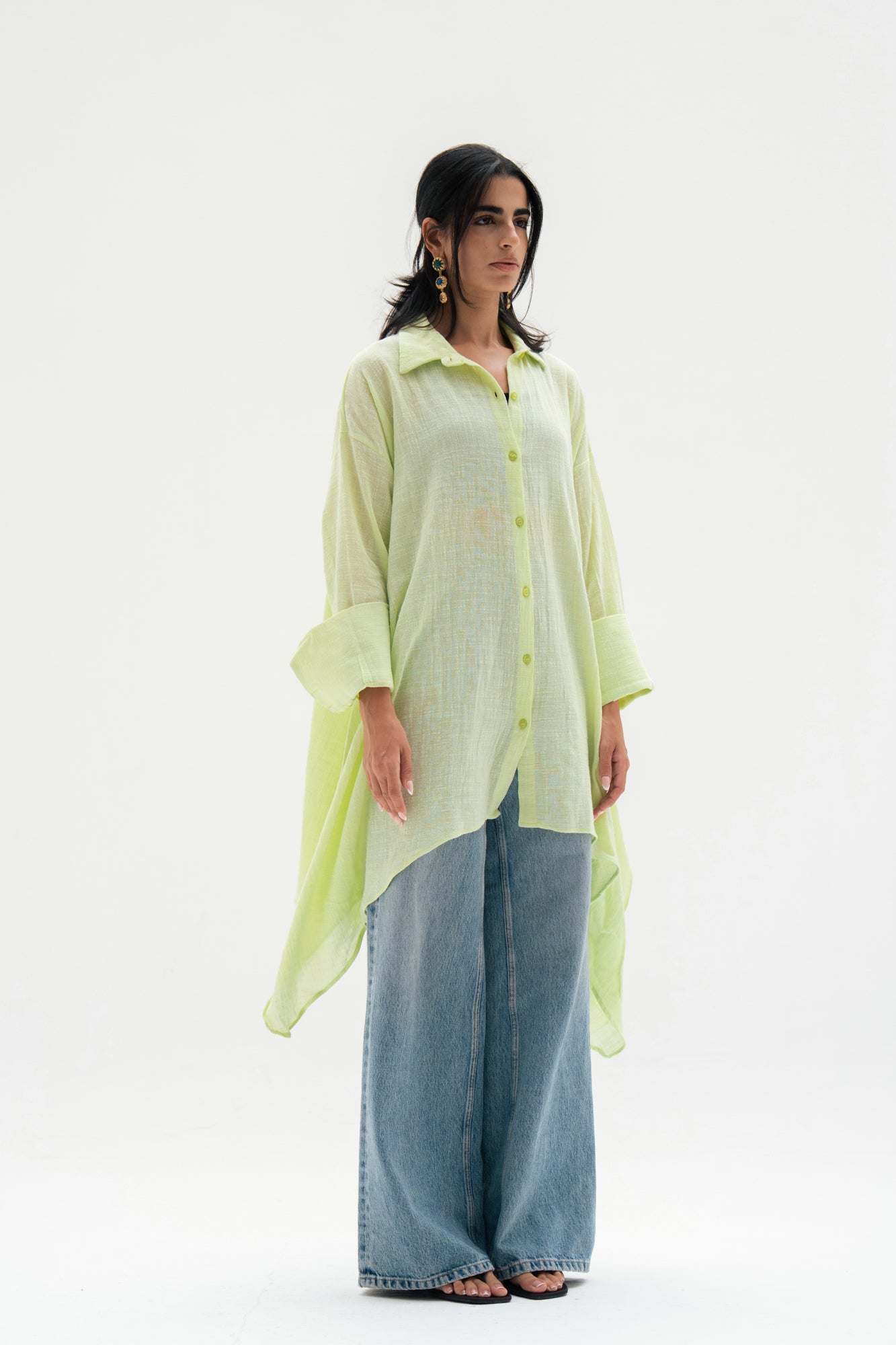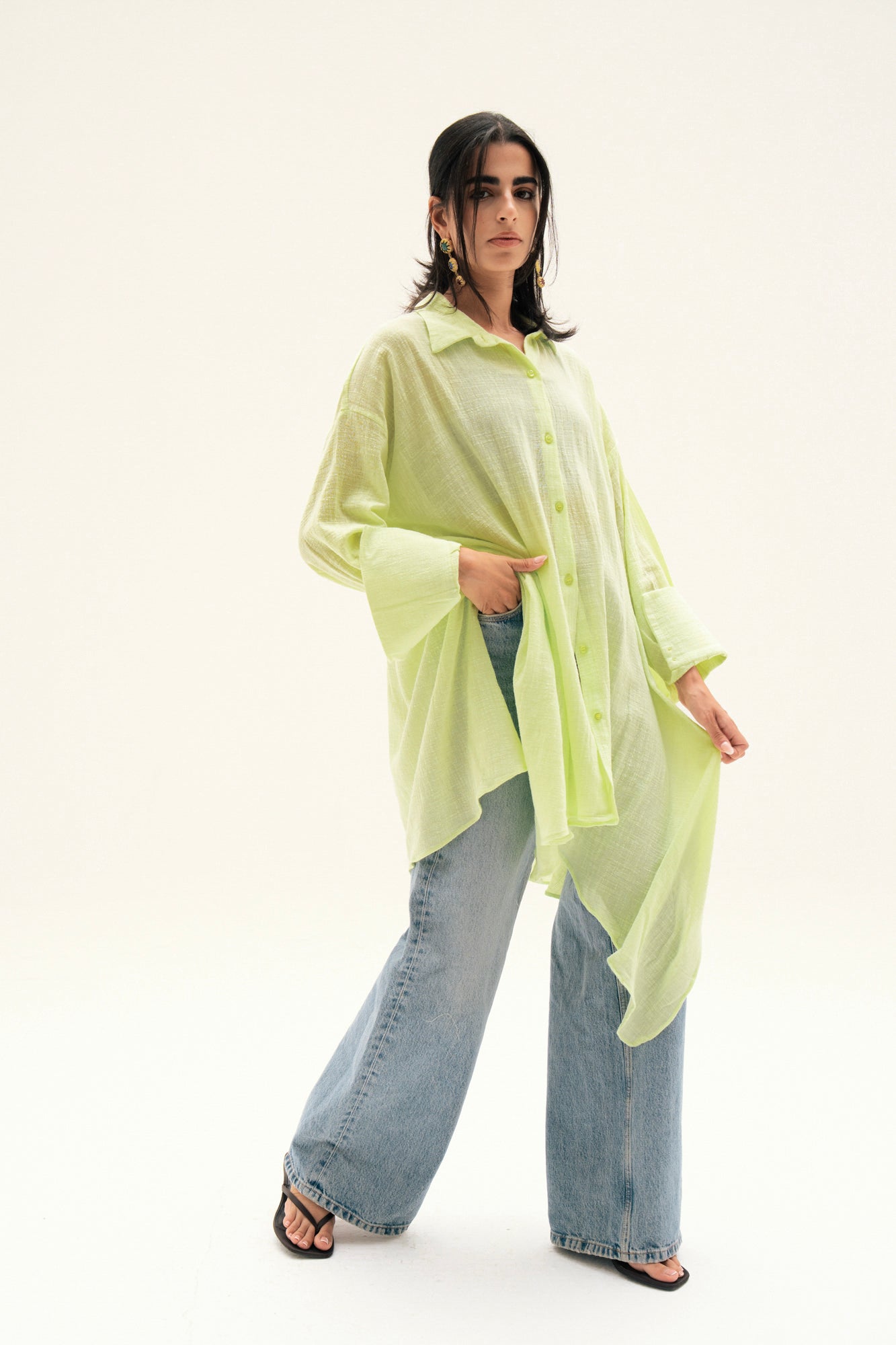 Oversized asymmetric linen shirt with a relaxed fit, closed with front buttons for effortless styling. Designed with a modern twist on a timeless silhouette, it pairs comfort with understated elegance.