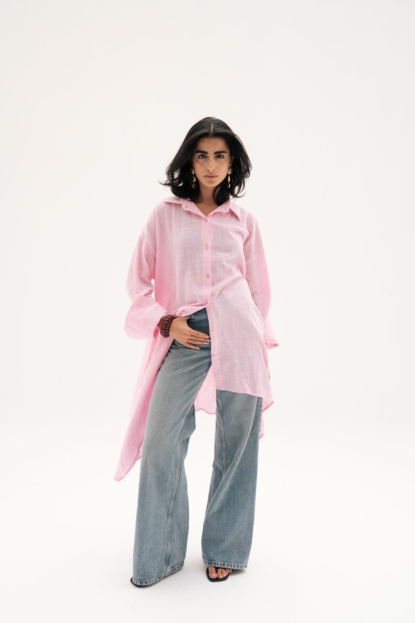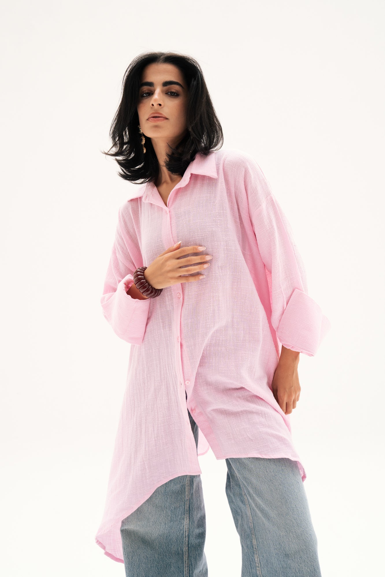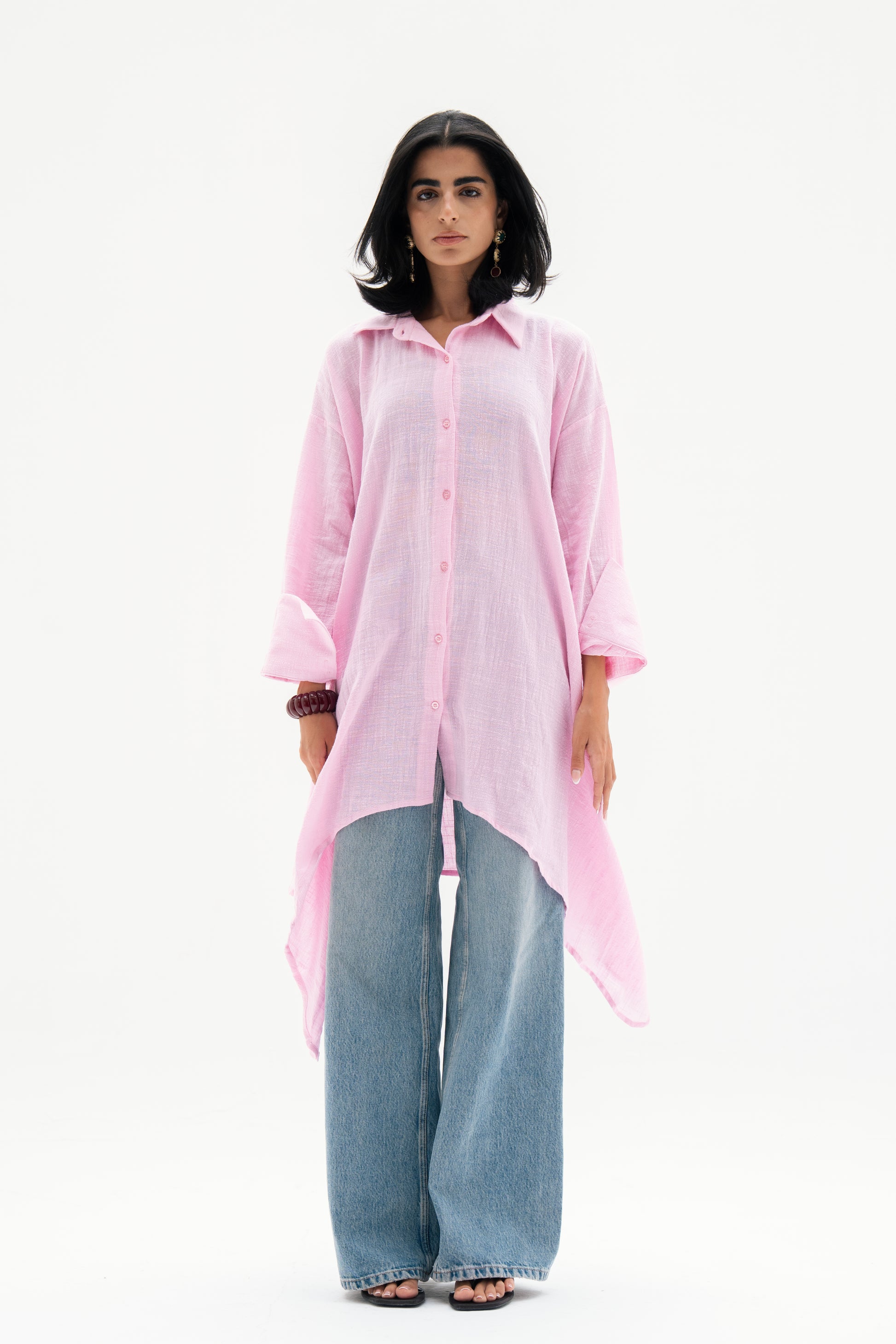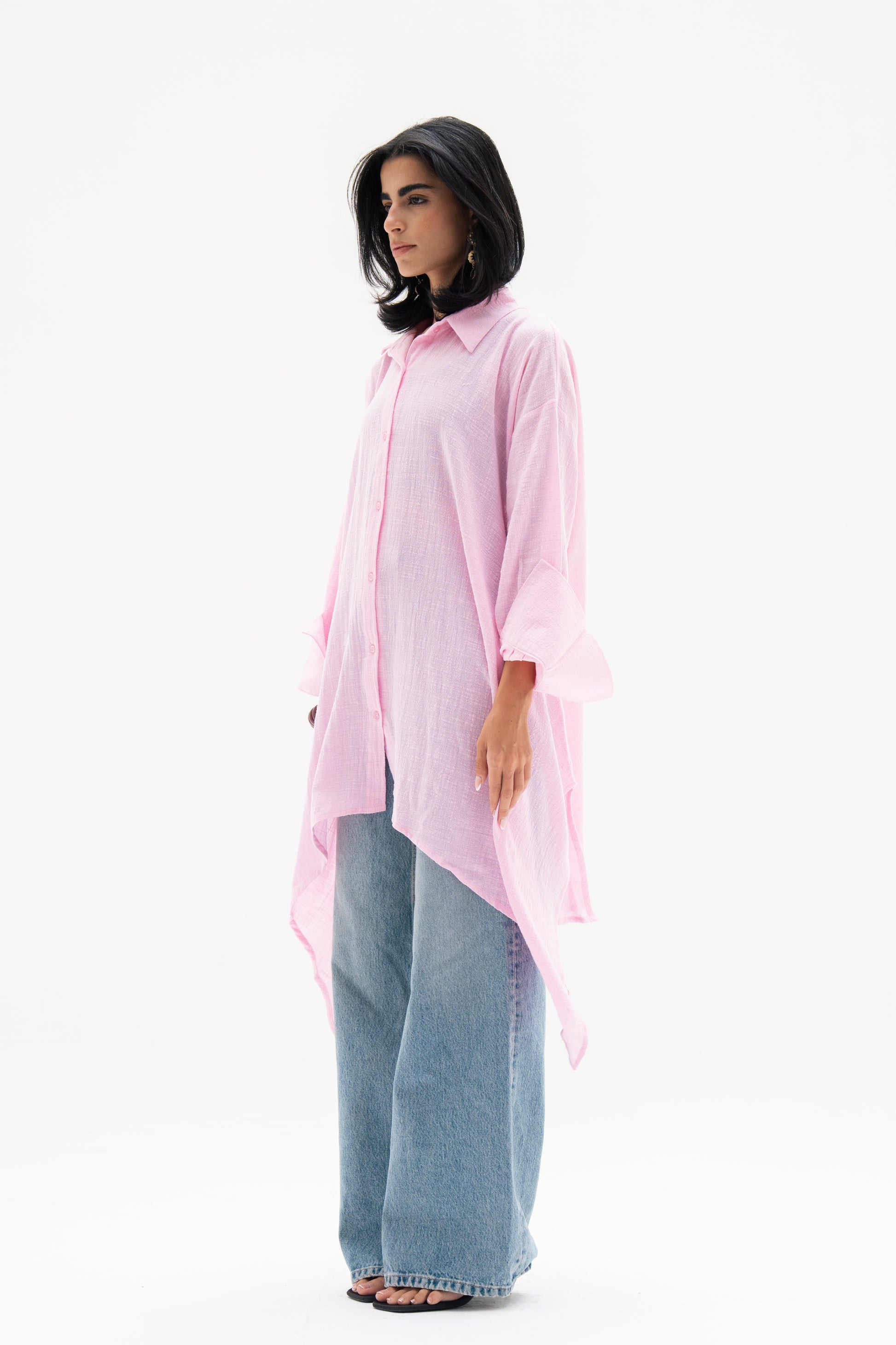 Oversized asymmetric linen shirt with a relaxed fit, closed with front buttons for effortless styling. Designed with a modern twist on a timeless silhouette, it pairs comfort with understated elegance.