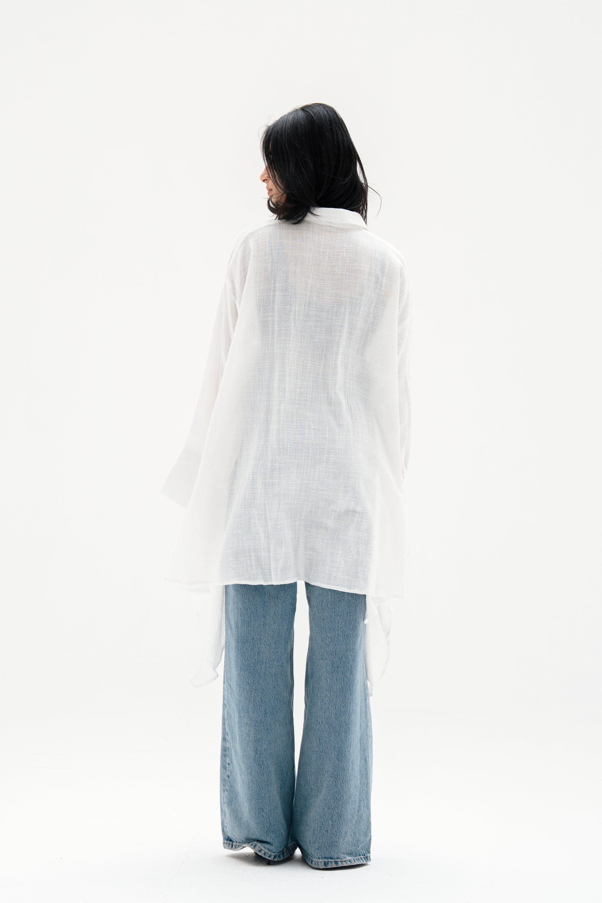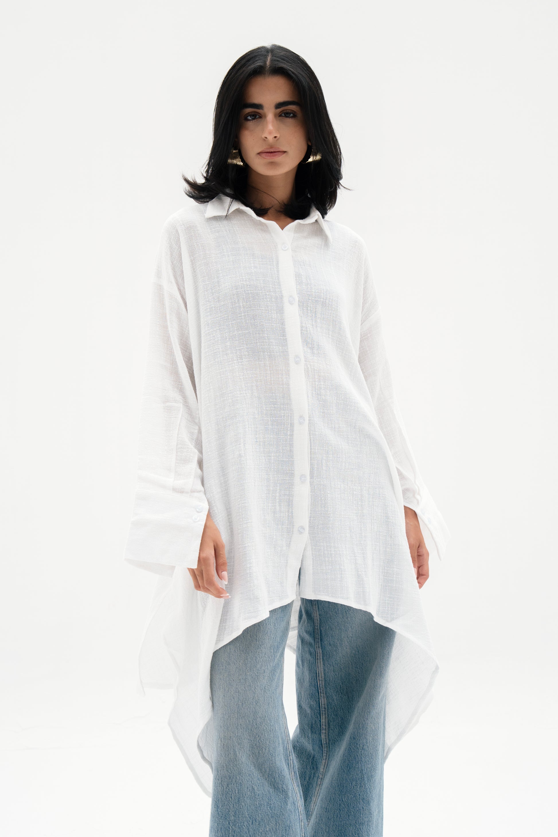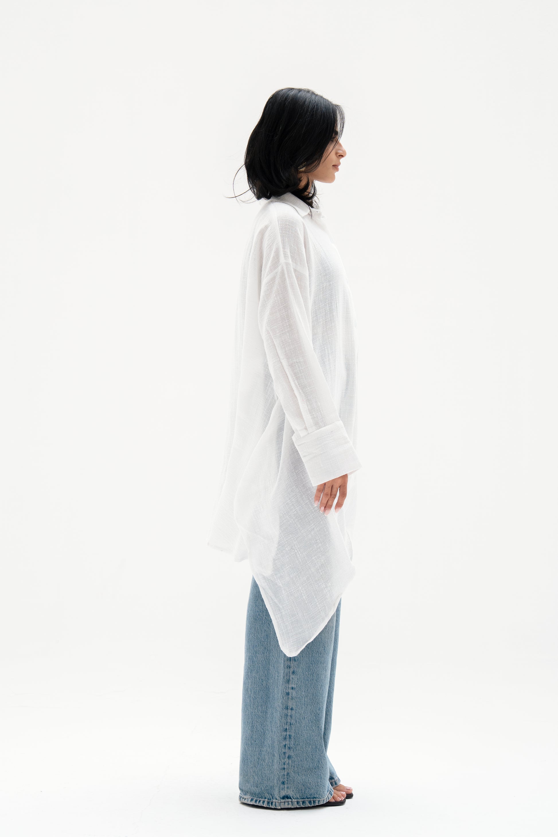 Oversized asymmetric linen shirt with a relaxed fit, closed with front buttons for effortless styling. Designed with a modern twist on a timeless silhouette, it pairs comfort with understated elegance.