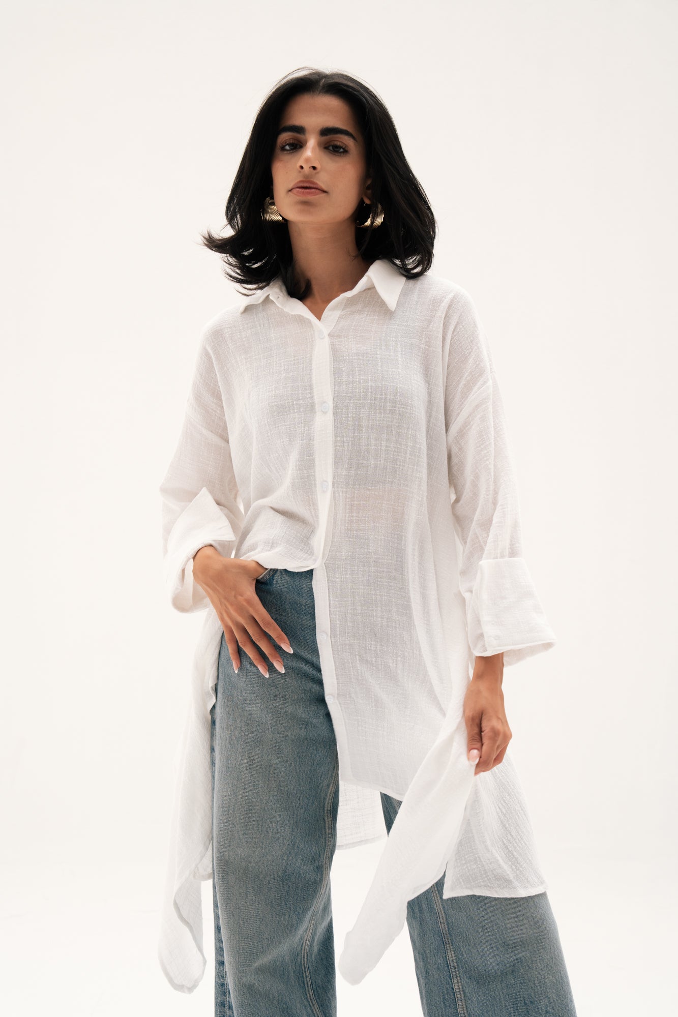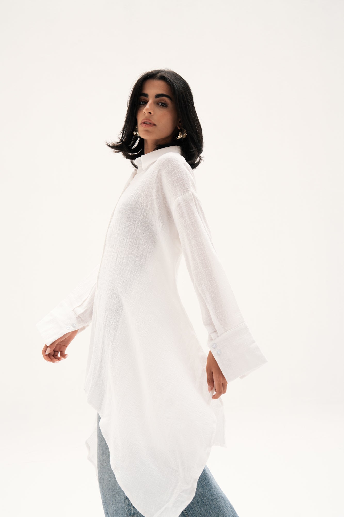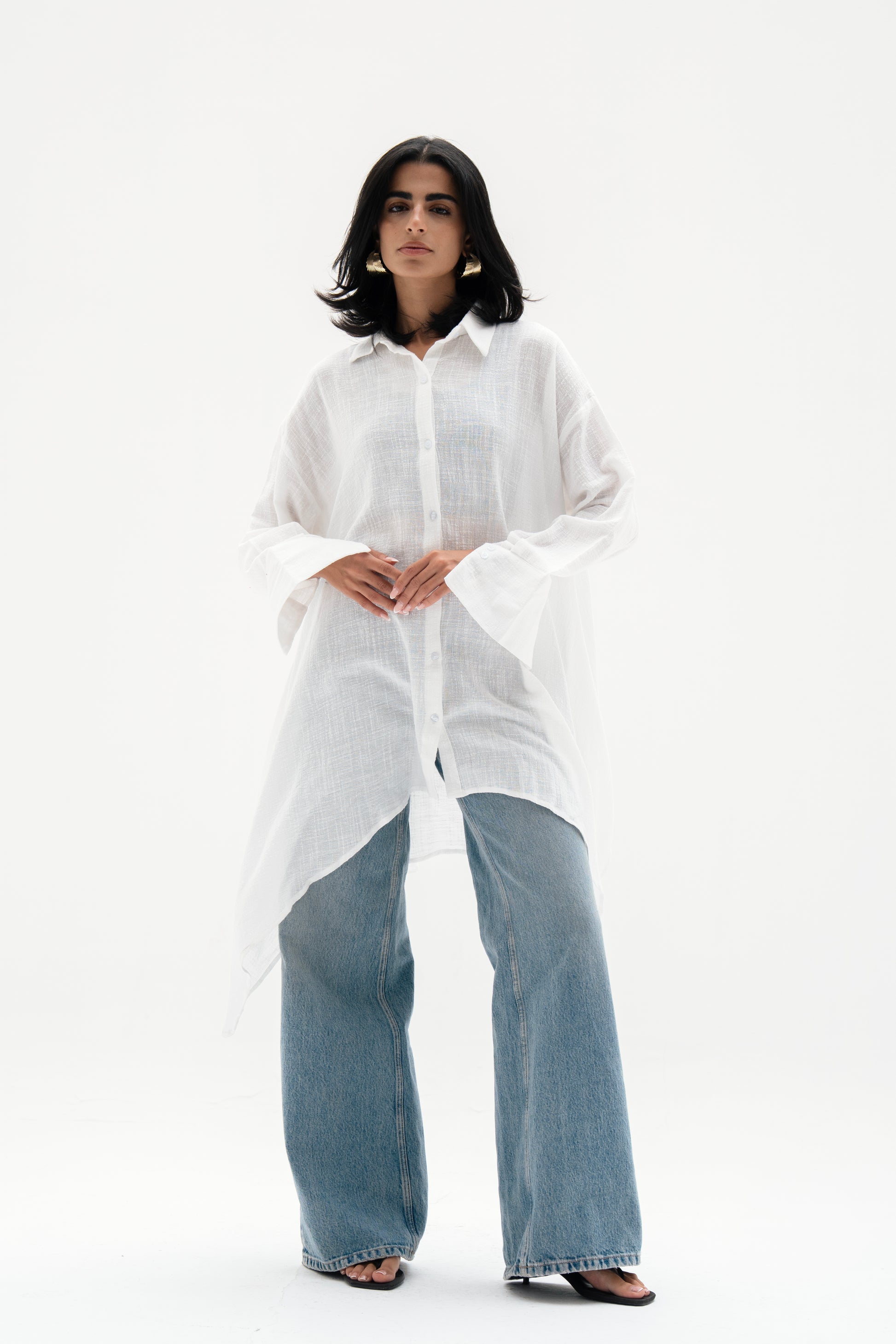 Oversized asymmetric linen shirt with a relaxed fit, closed with front buttons for effortless styling. Designed with a modern twist on a timeless silhouette, it pairs comfort with understated elegance.