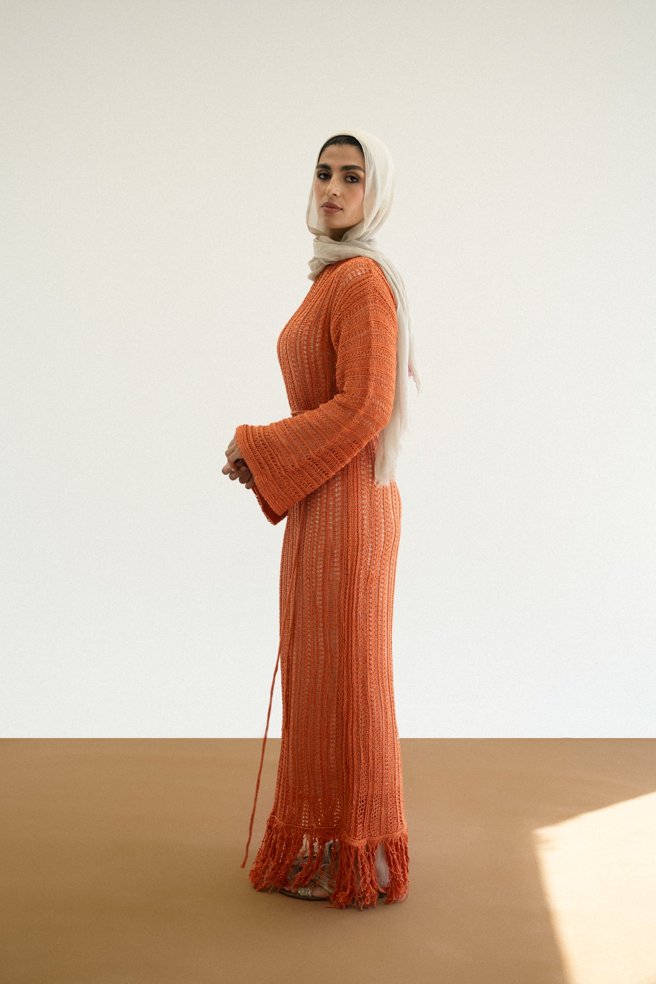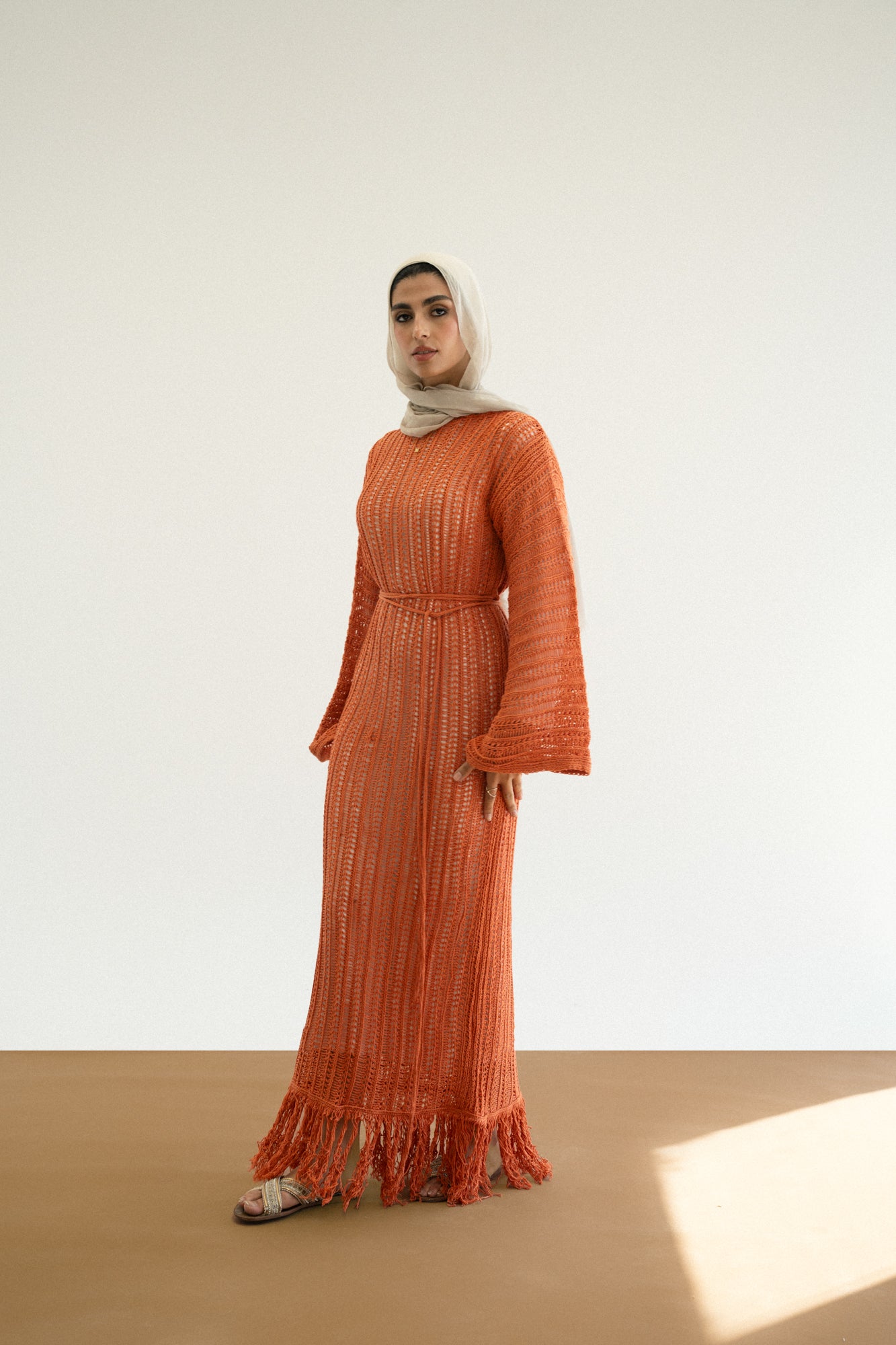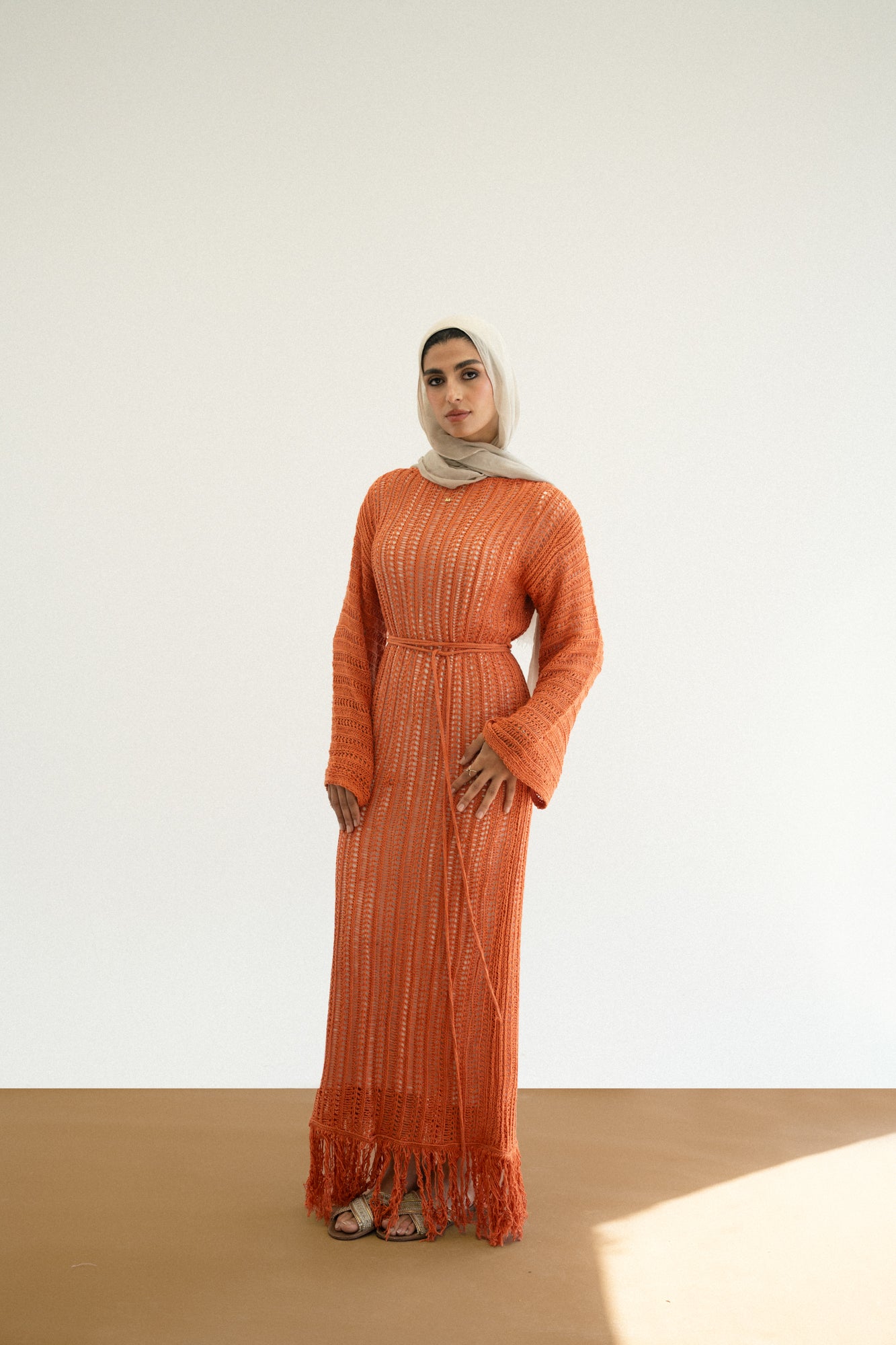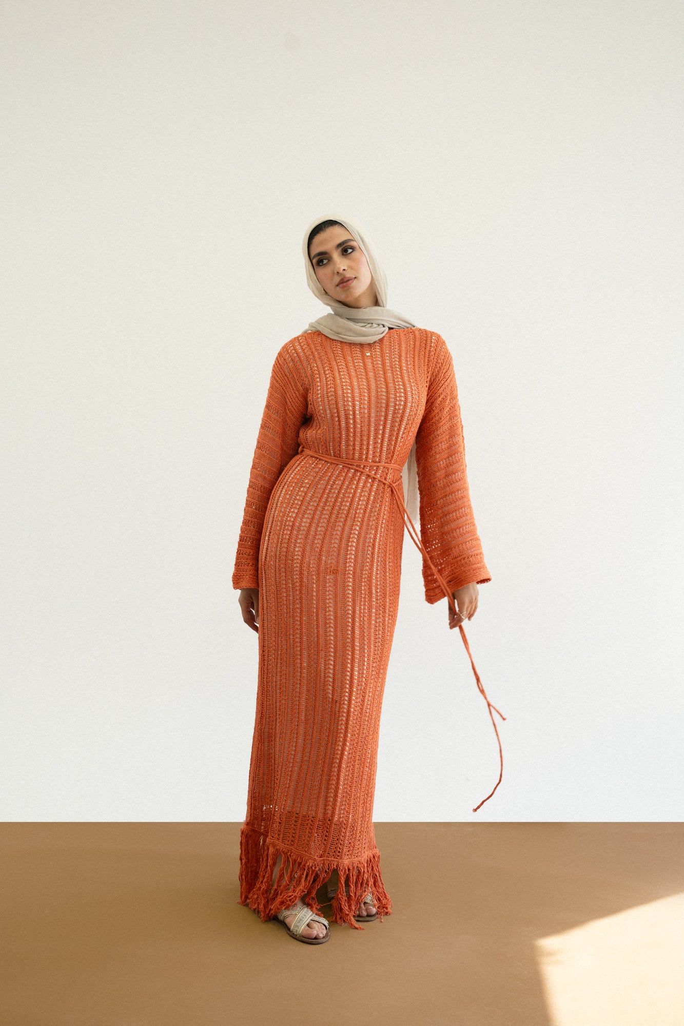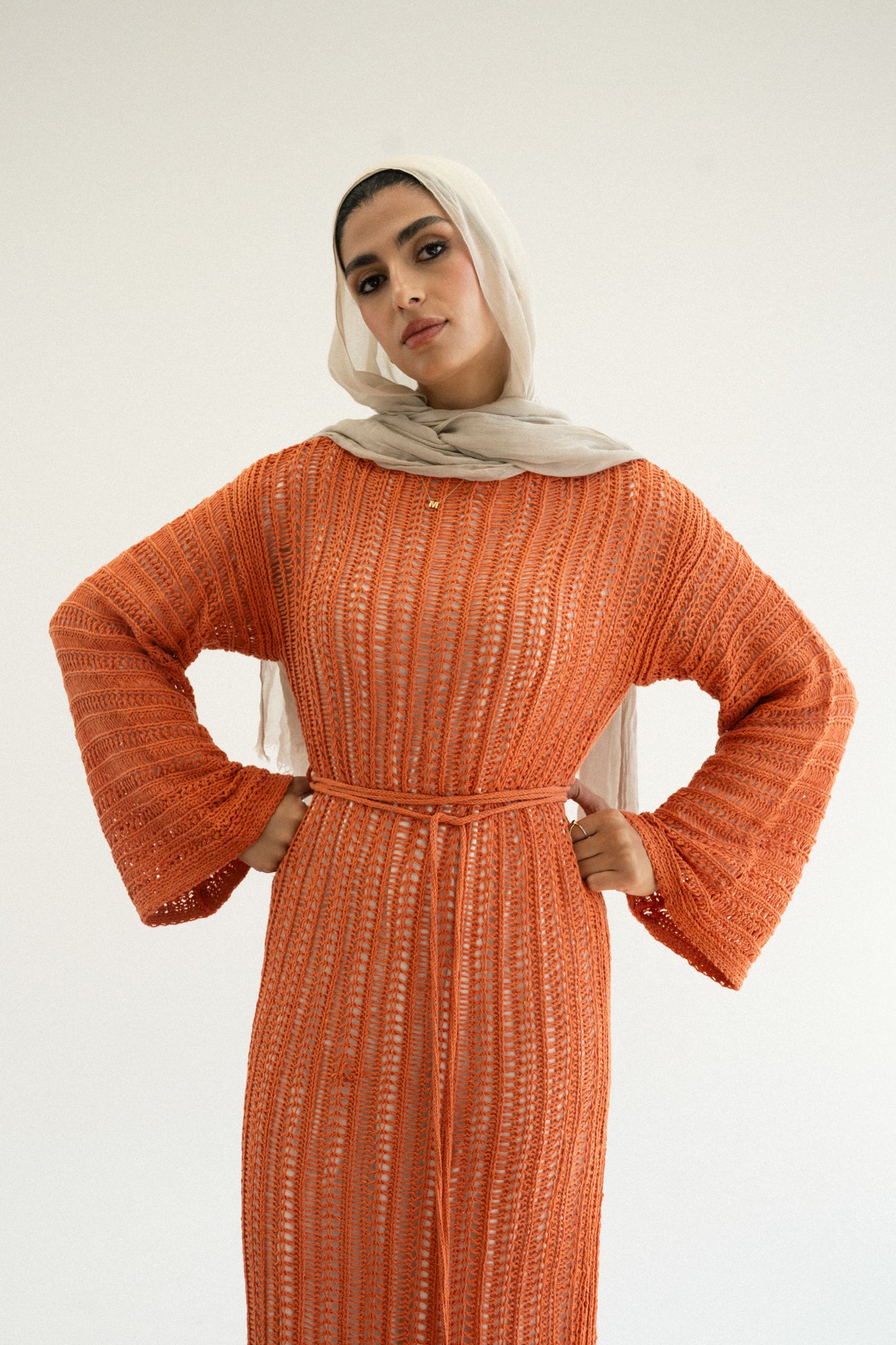 Lightweight with long sleeves and a soft belt to define the waist, it offers a relaxed fit that’s perfect for breezy seaside days or sunset strolls.