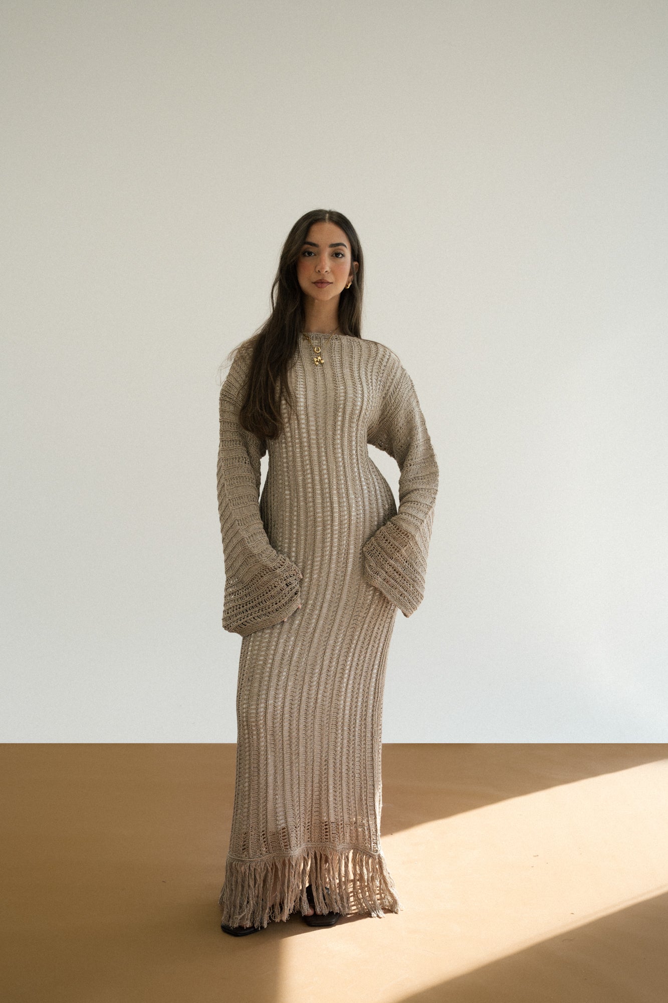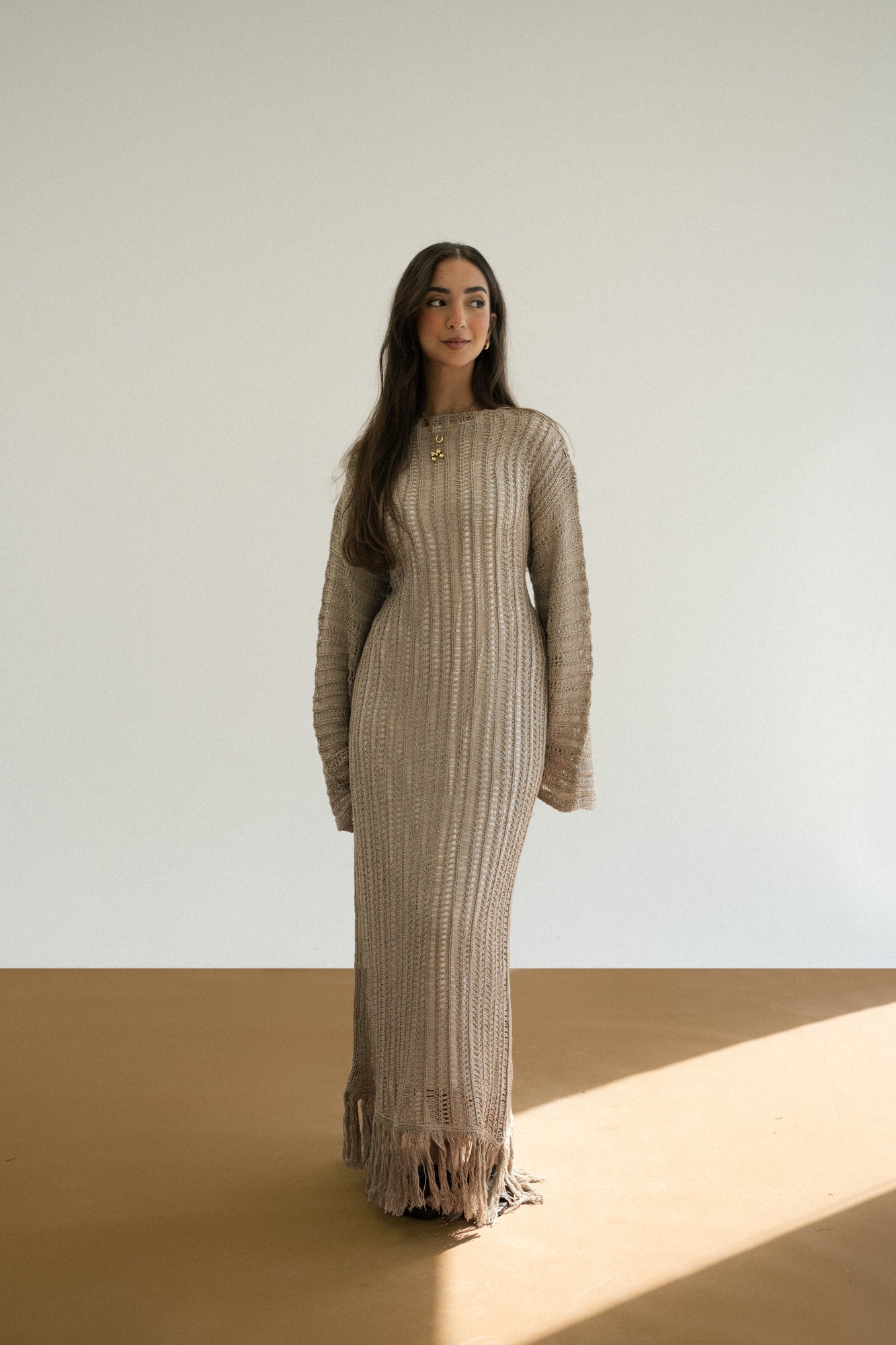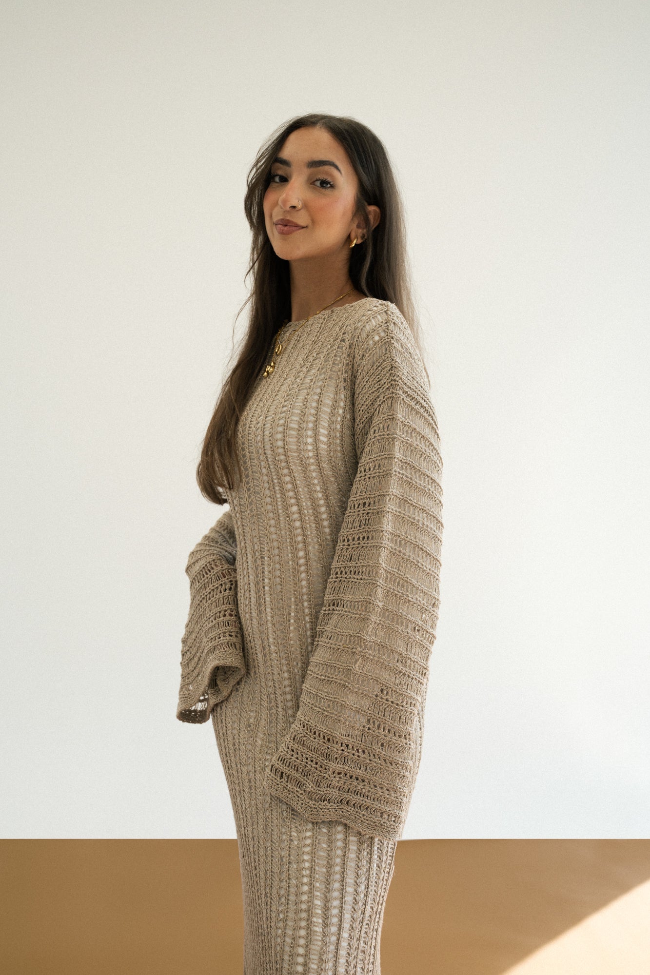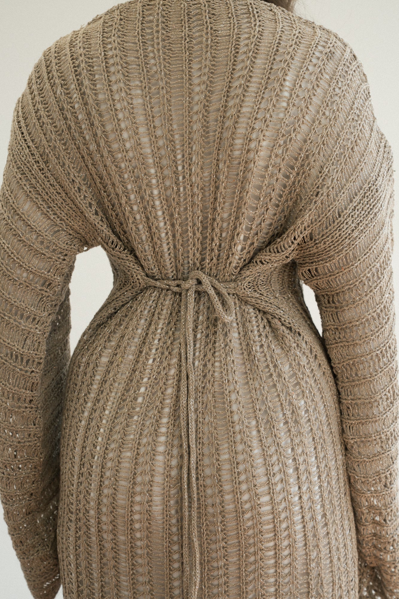 Lightweight with long sleeves and a soft belt to define the waist, it offers a relaxed fit that’s perfect for breezy seaside days or sunset strolls.