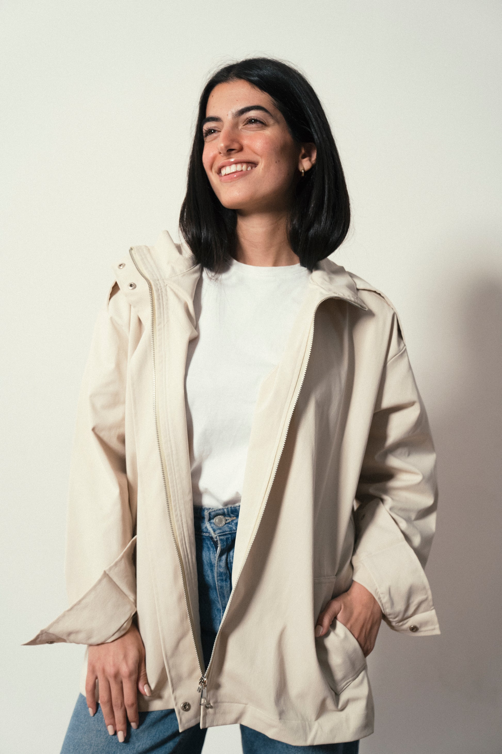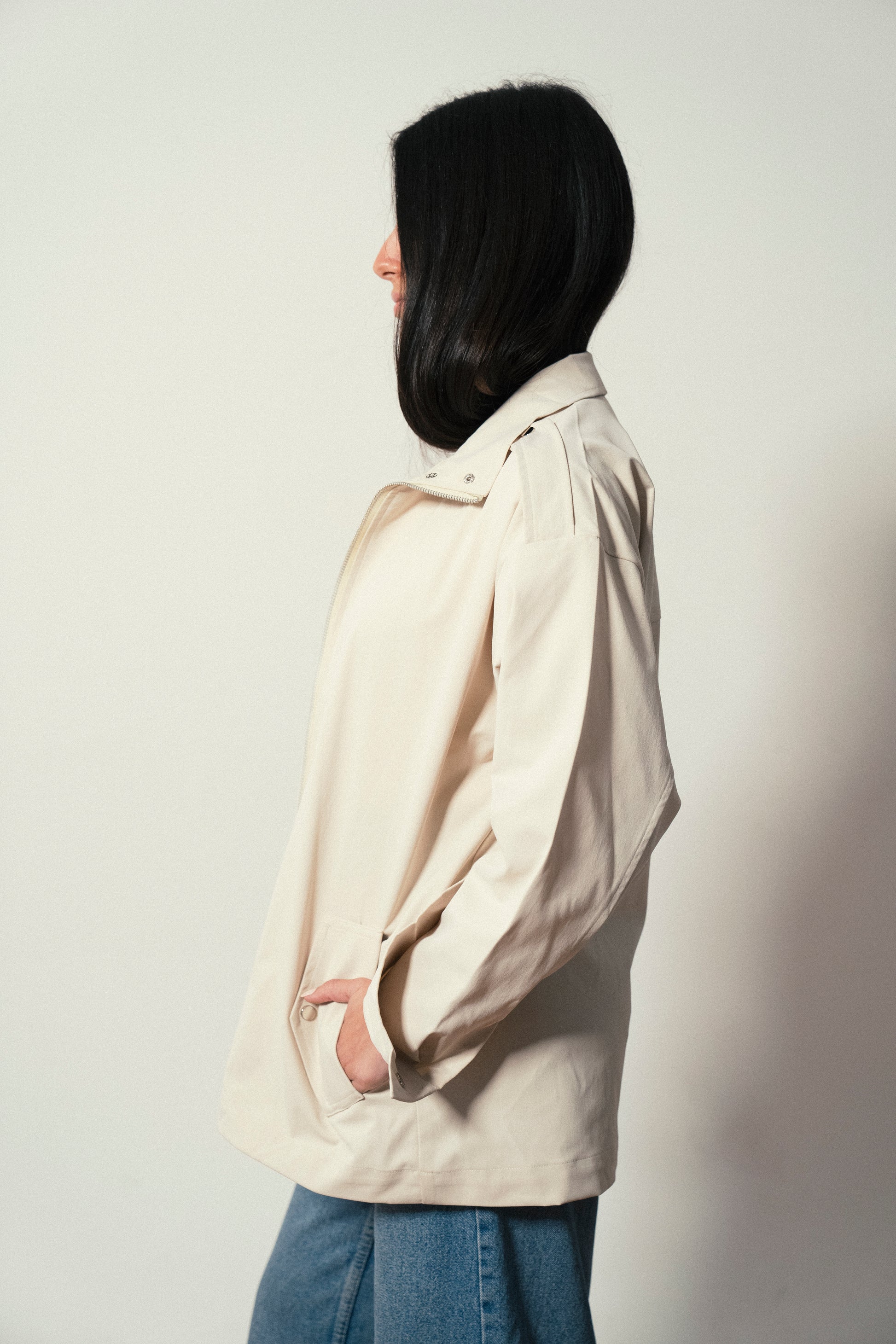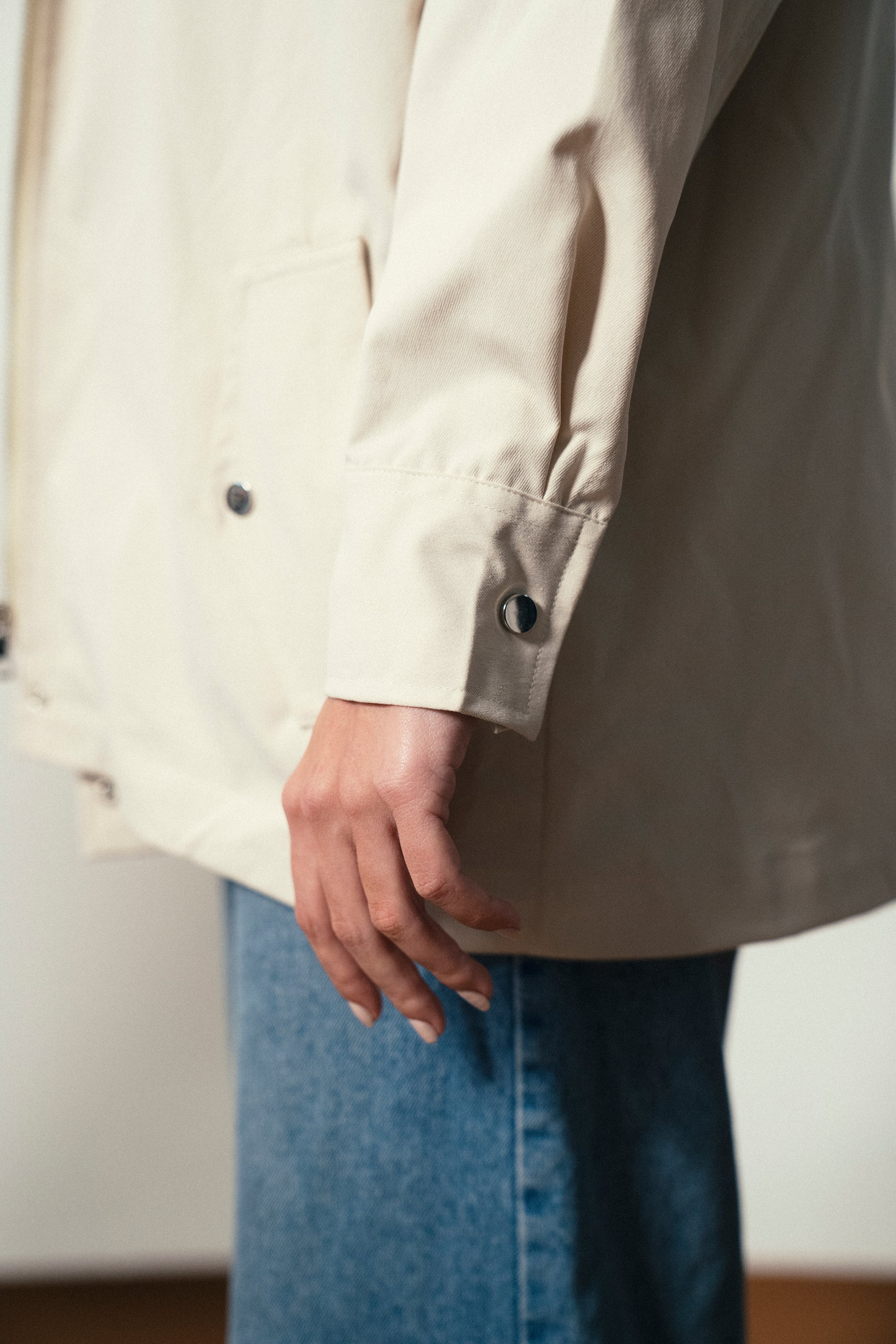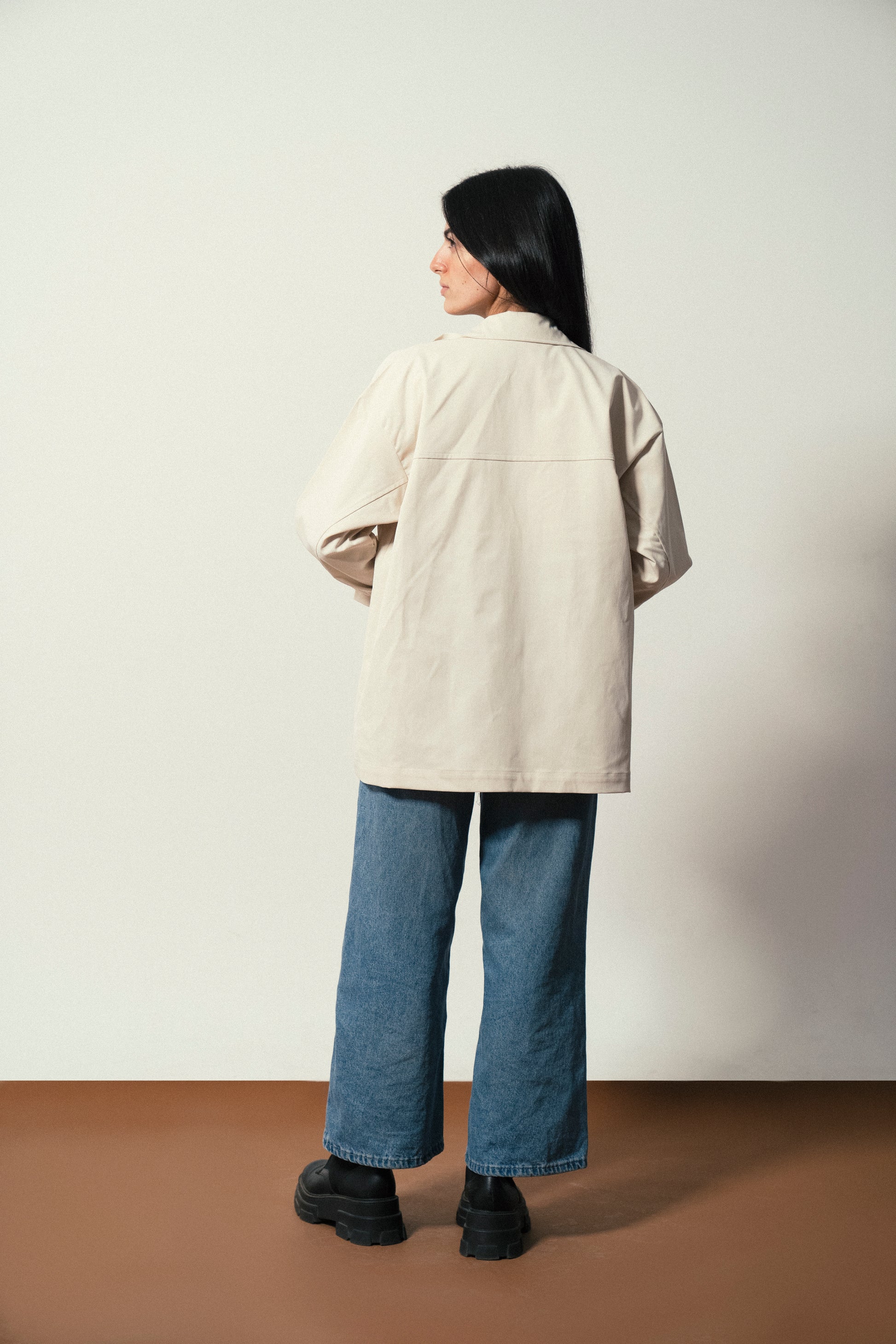 An oversized gabardine jacket featuring multiple pockets and press-stud closures. This jacket blends style and utility, perfect for a chic, laid-back look with plenty of storage.