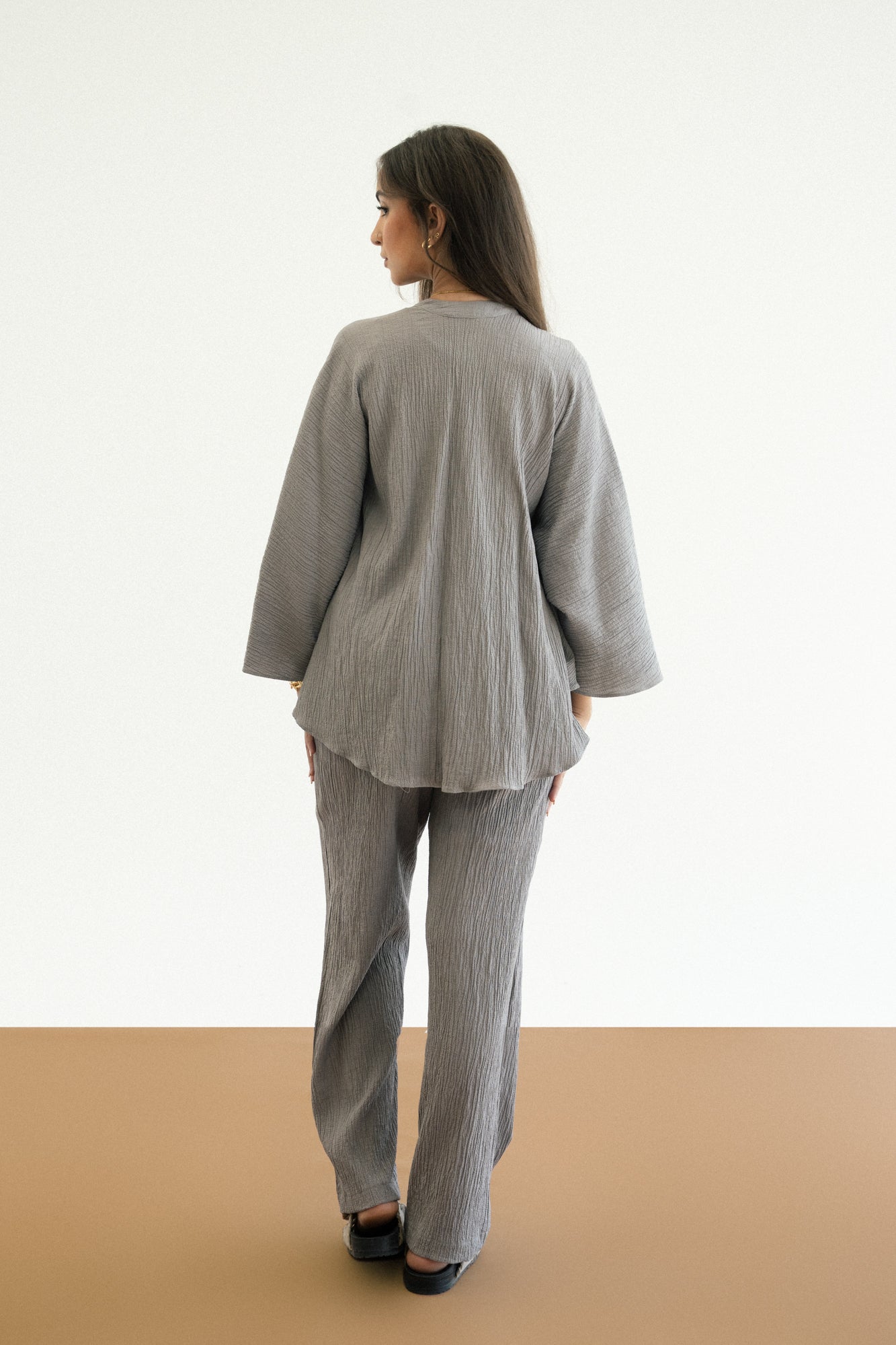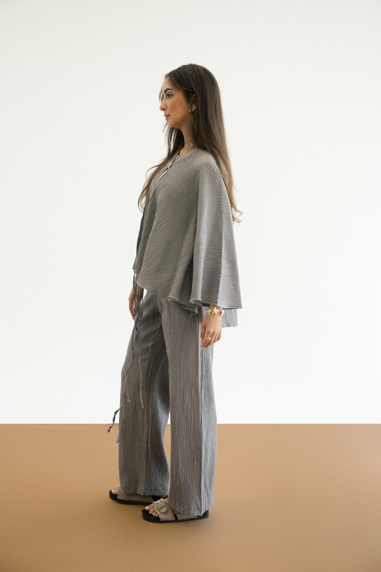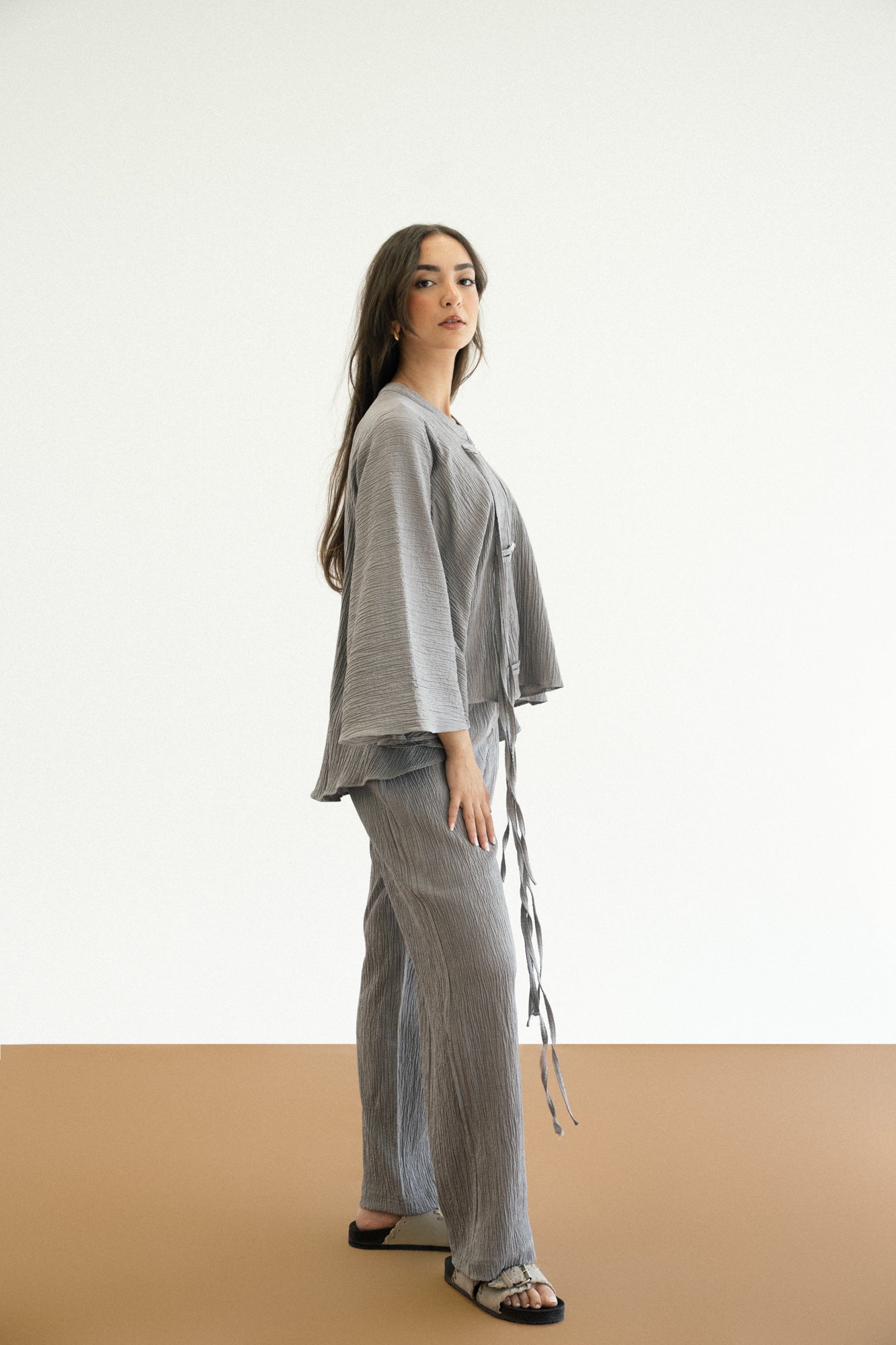 - Crafted from a textured, lightweight fabric with a natural crinkle effect, this set blends comfort with quiet sophistication. The kimono features wide, cape-like sleeves and is detailed with front ties and buttons, creating a layered, airy silhouette.