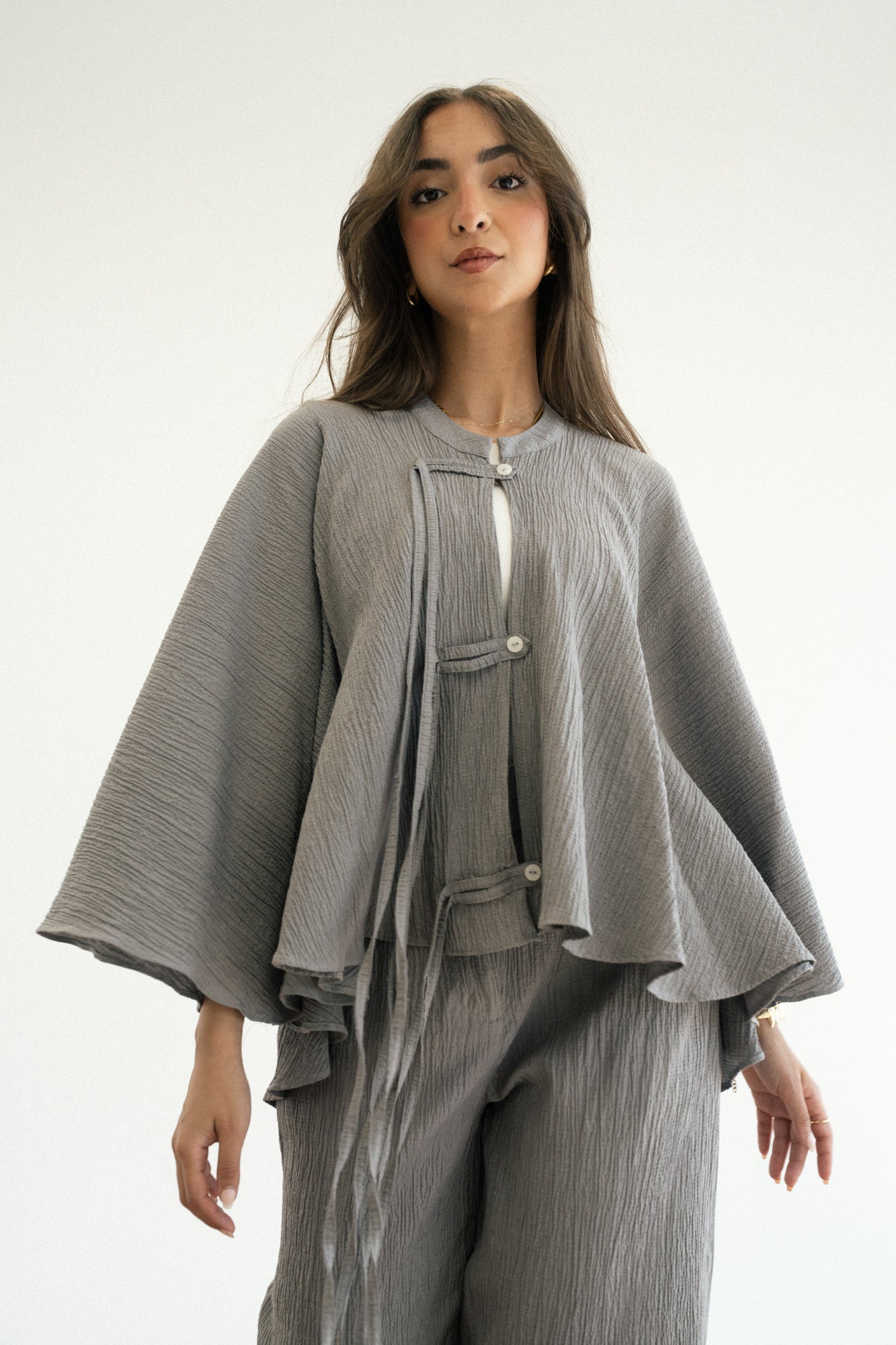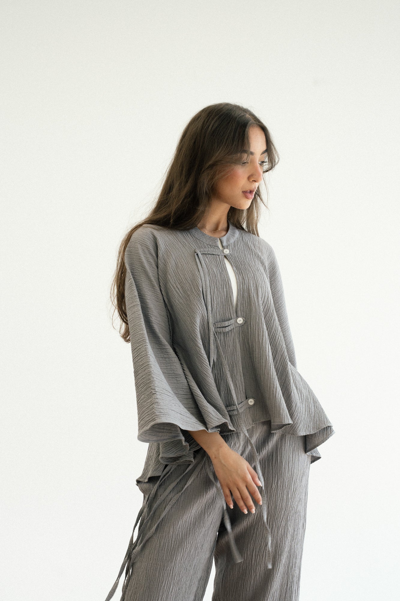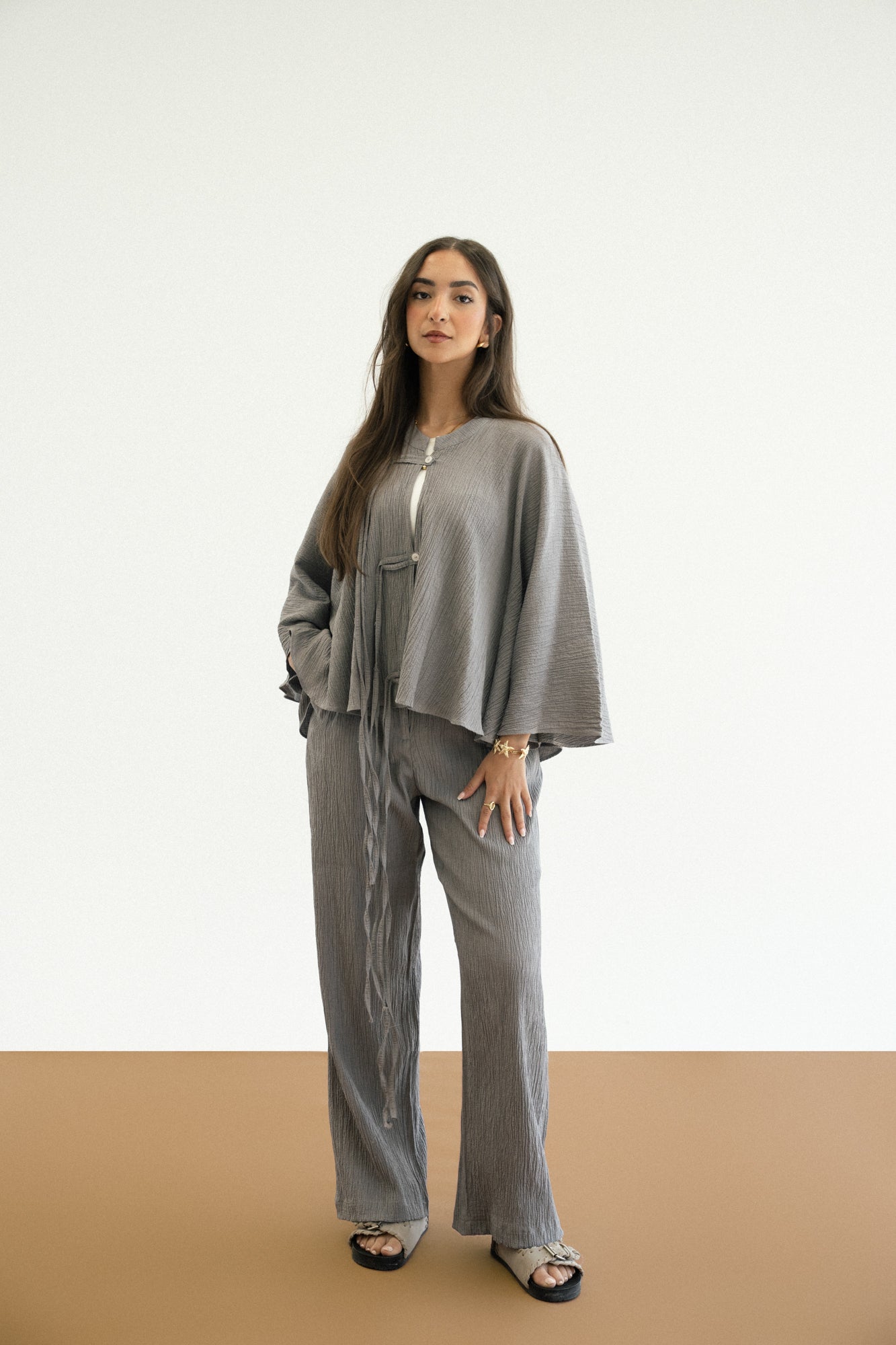 - Crafted from a textured, lightweight fabric with a natural crinkle effect, this set blends comfort with quiet sophistication. The kimono features wide, cape-like sleeves and is detailed with front ties and buttons, creating a layered, airy silhouette.