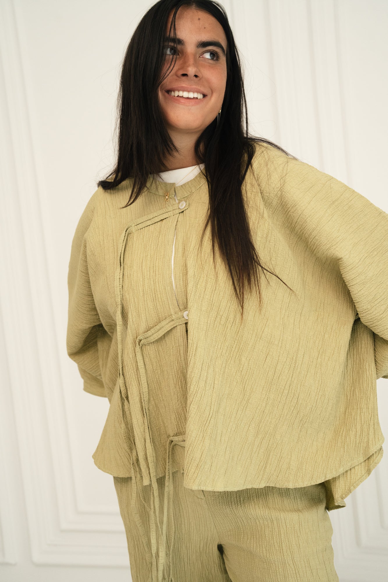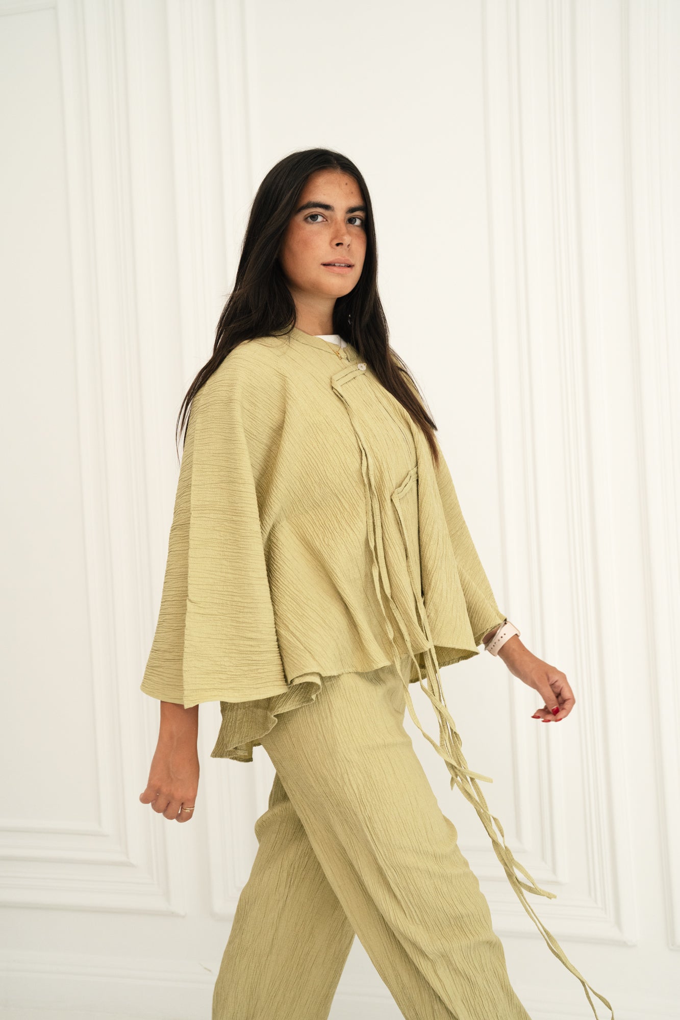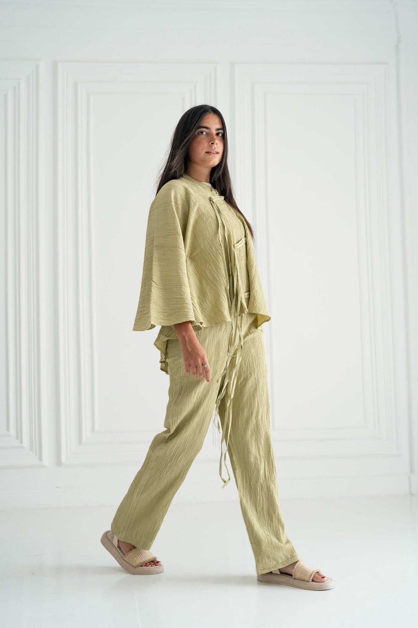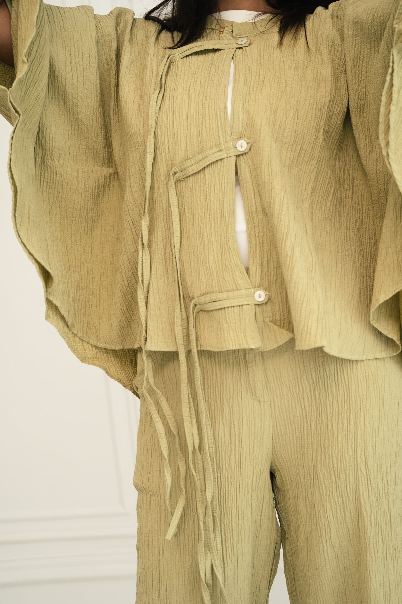 - Crafted from a textured, lightweight fabric with a natural crinkle effect, this set blends comfort with quiet sophistication. The kimono features wide, cape-like sleeves and is detailed with front ties and buttons, creating a layered, airy silhouette.