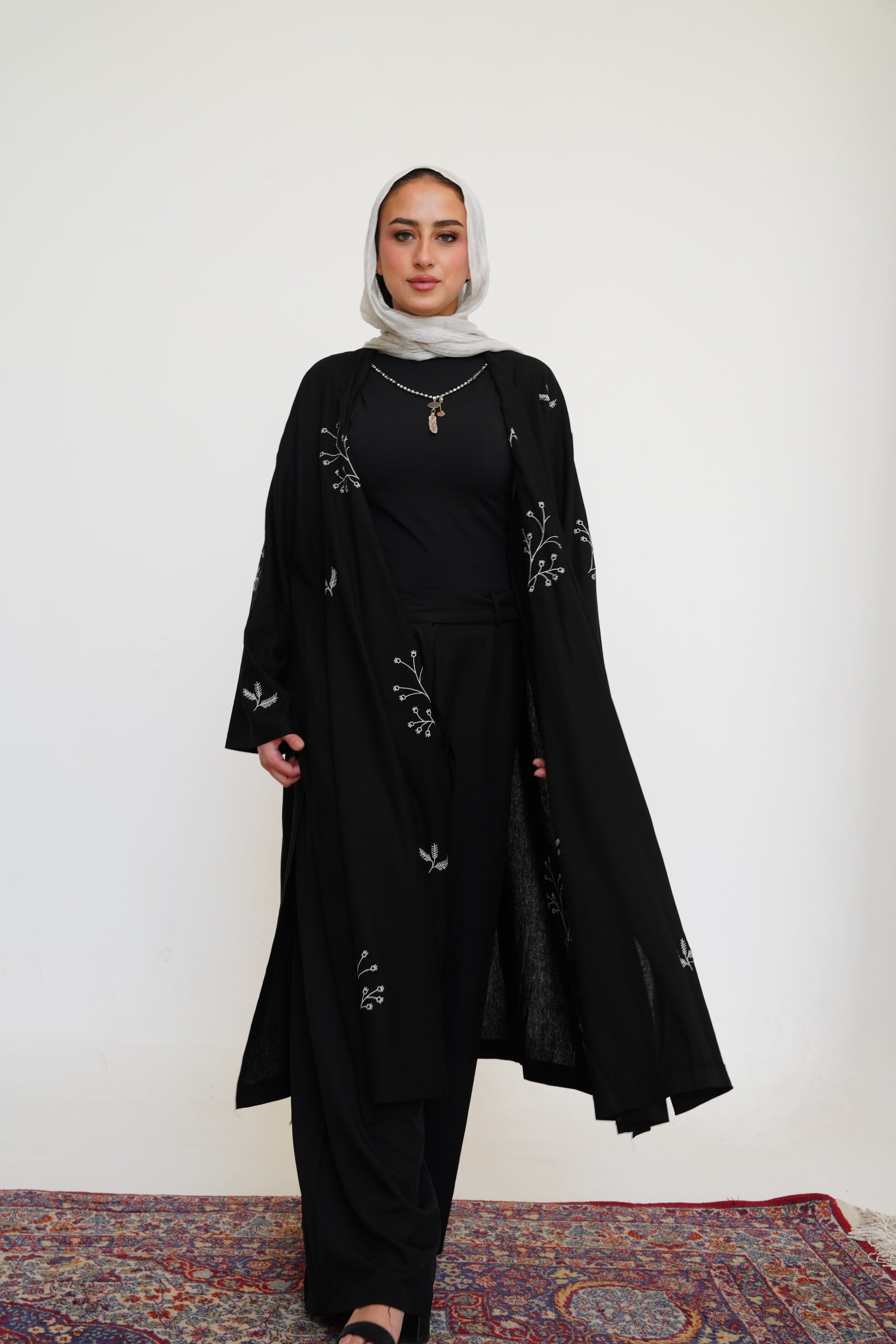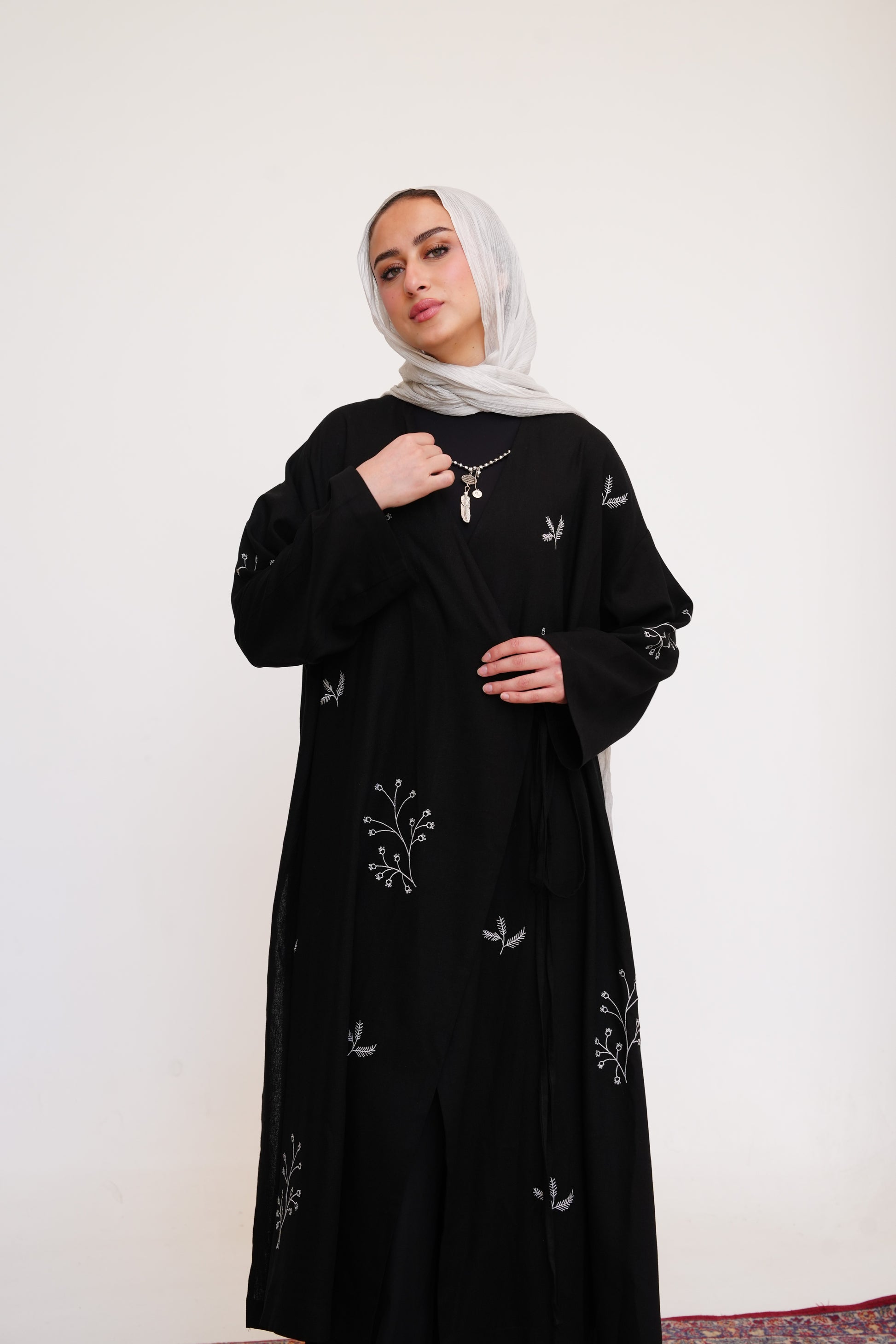This embroidered kaftan is designed with a relaxed, flowing silhouette and a soft wrap-style front. Crafted in a rich earthy tone, it features delicate botanical embroidery scattered across the fabric for a refined artisanal touch. The wide sleeves and fluid drape create graceful movement, while the adjustable front ties allow for subtle shaping. A timeless layering piece that blends modest elegance with understated detail.