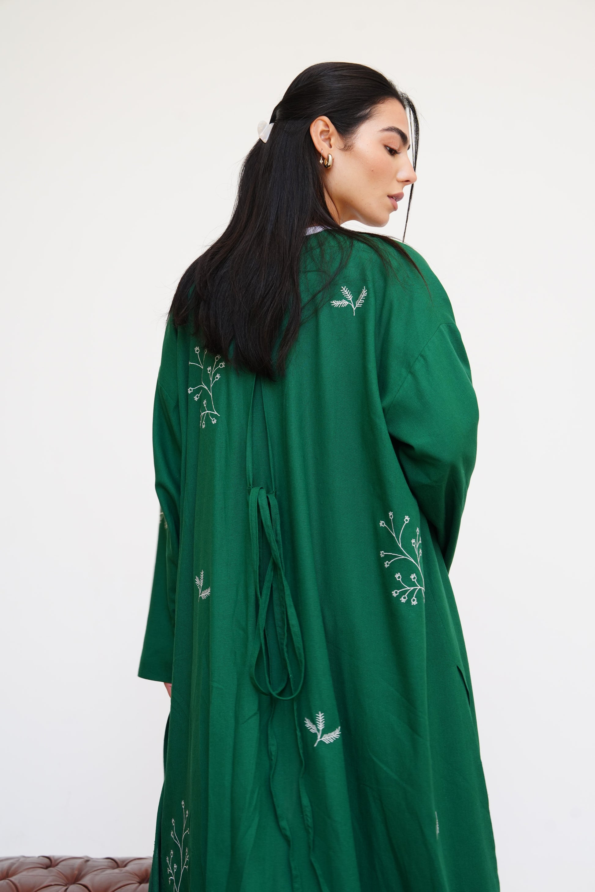 This embroidered kaftan is designed with a relaxed, flowing silhouette and a soft wrap-style front. Crafted in a rich earthy tone, it features delicate botanical embroidery scattered across the fabric for a refined artisanal touch. The wide sleeves and fluid drape create graceful movement, while the adjustable front ties allow for subtle shaping. A timeless layering piece that blends modest elegance with understated detail.