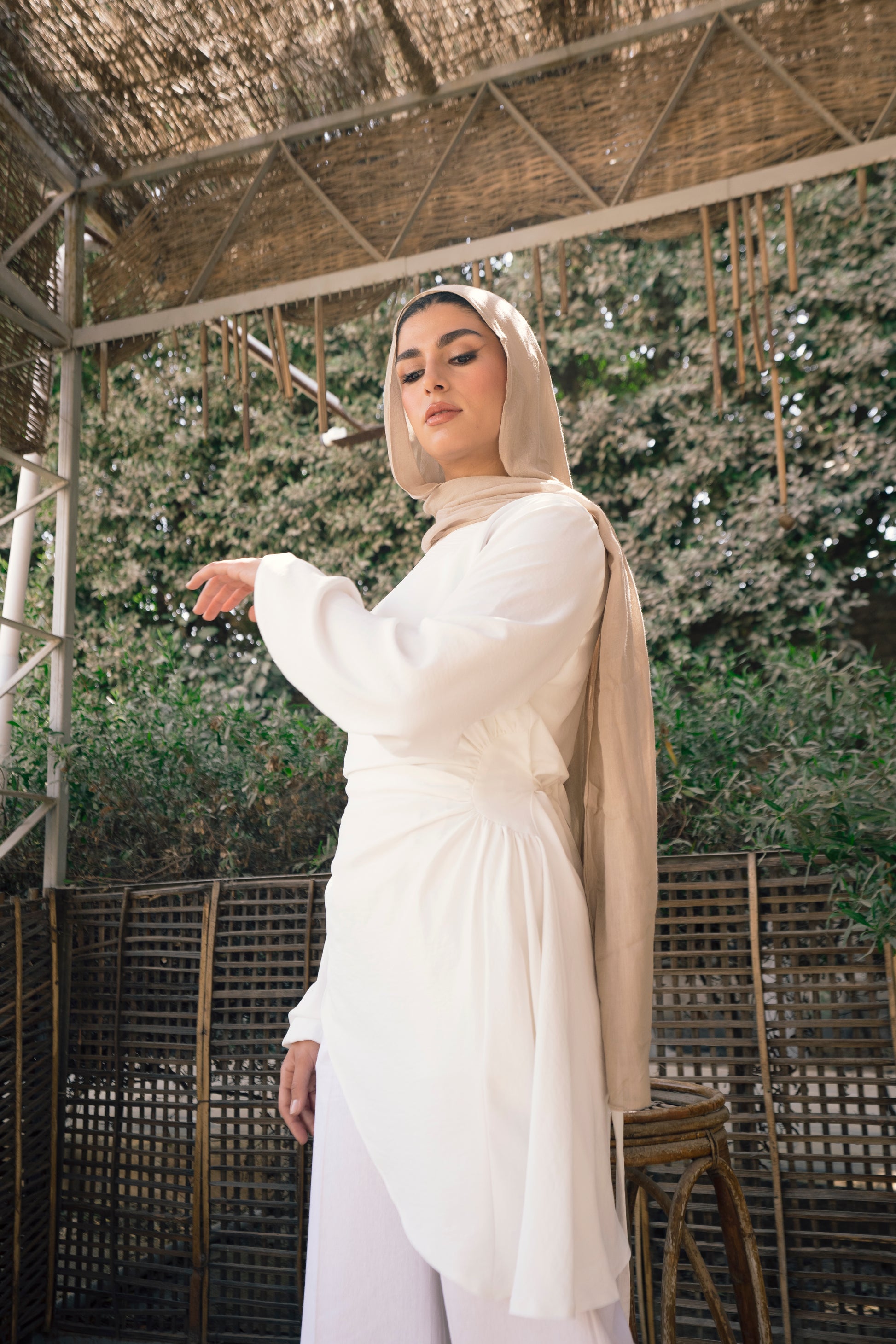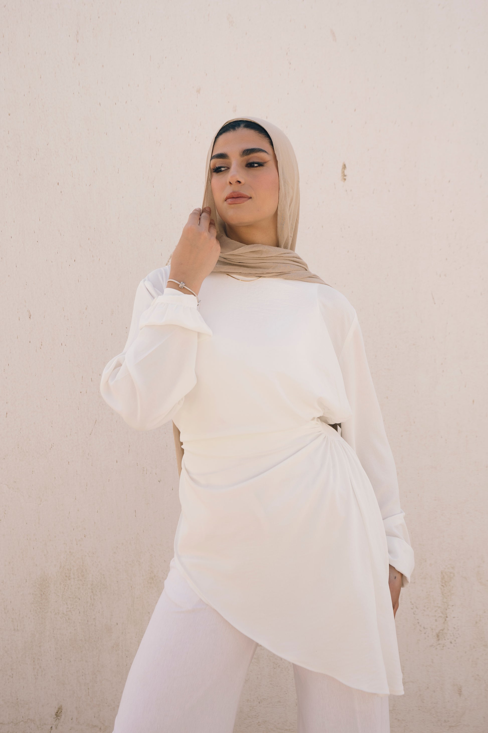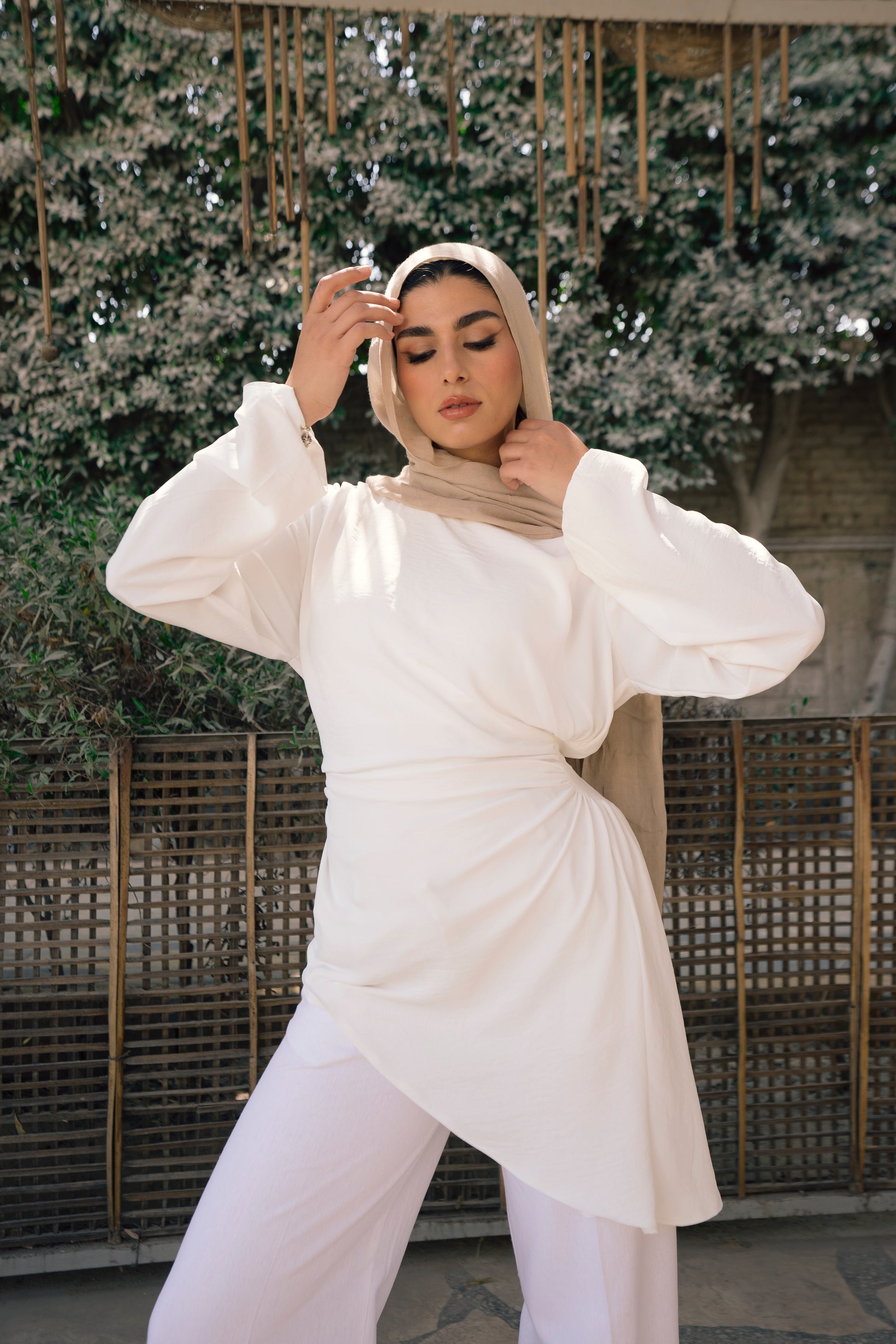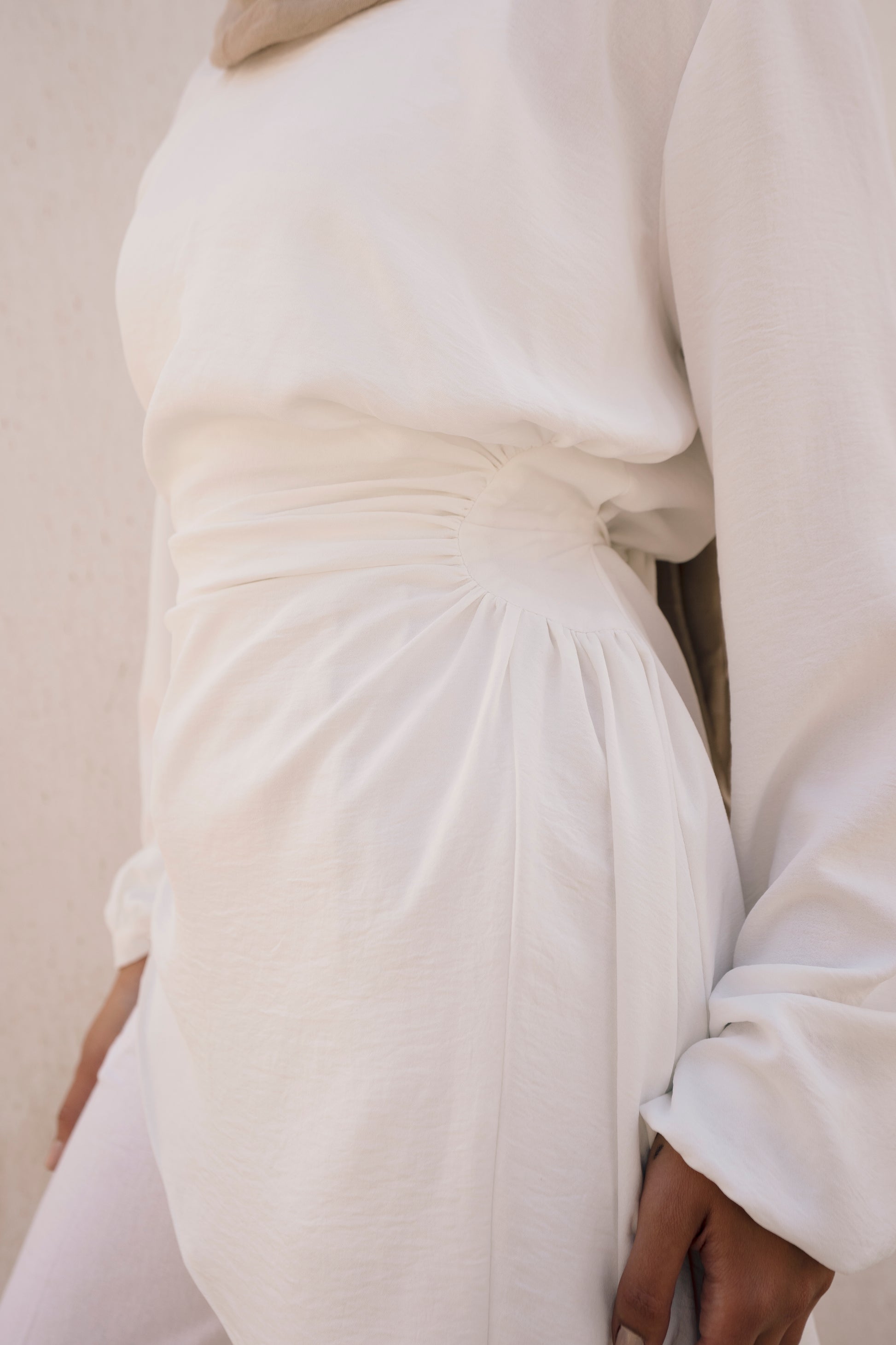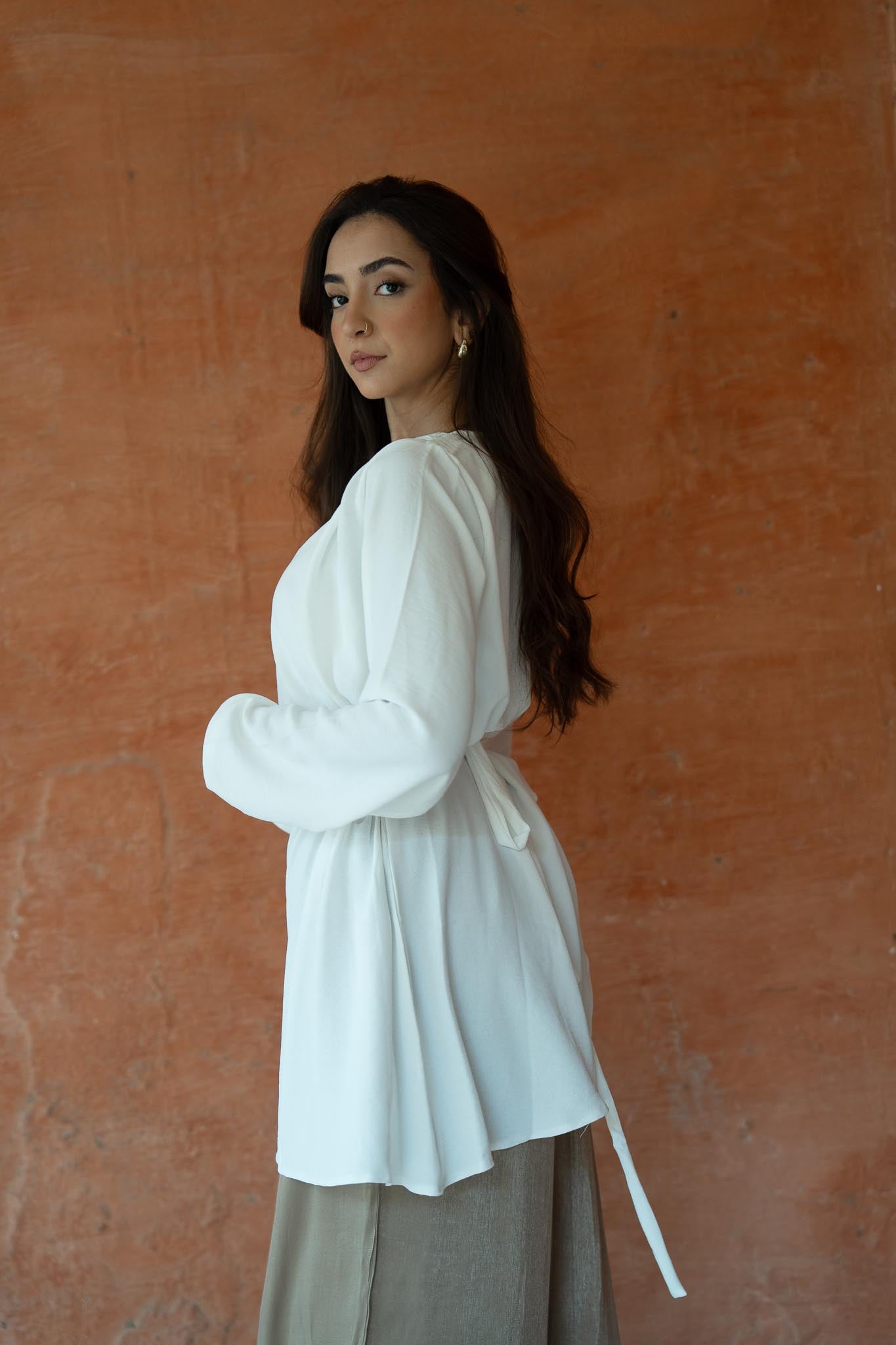 - Blouse with a round neck and long puffy sleeves. I gathered details on the side & draped fabric on the shoulder. A fun, modest piece to add to your wardrobe.