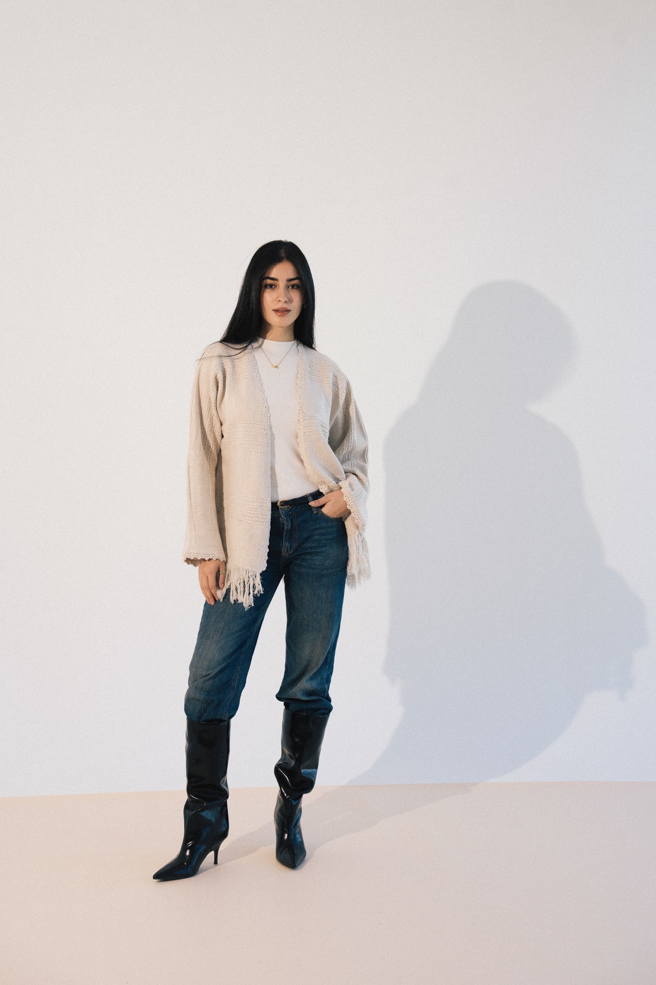 A textured, open-knit cardigan featuring intricate horizontal detailing and soft fringe along the hem. Designed with a relaxed, easy silhouette and wide sleeves, it adds effortless dimension to any outfit. Lightweight yet cozy, it layers beautifully over basics for an elevated everyday look.