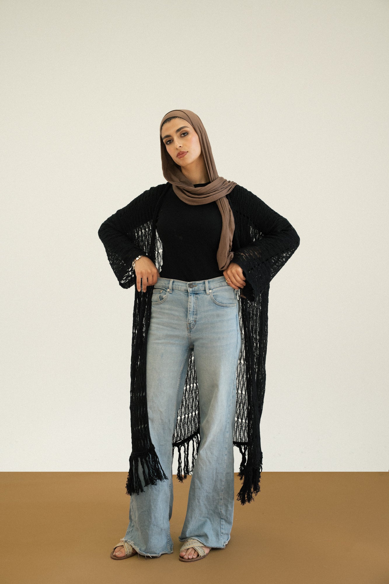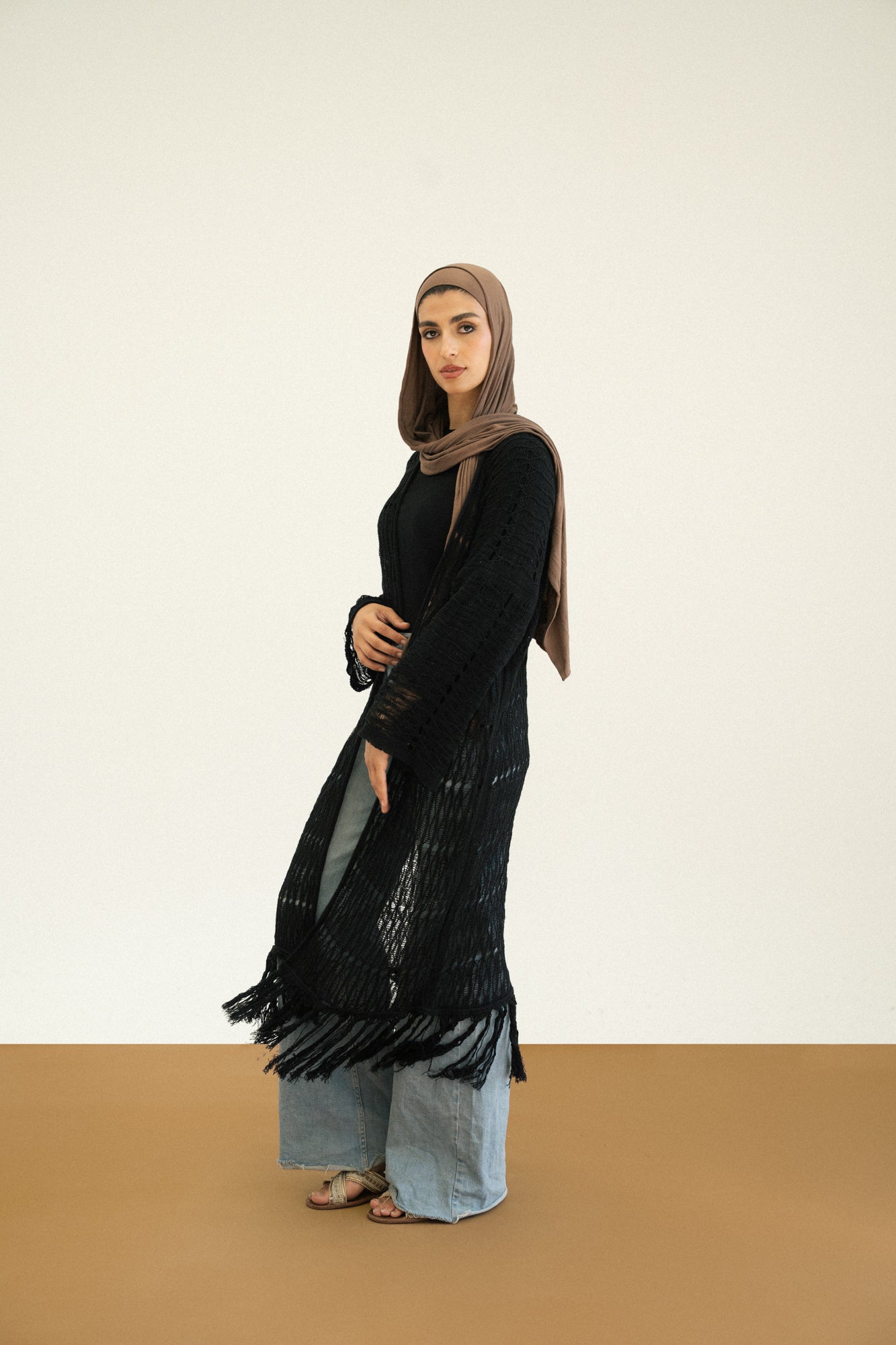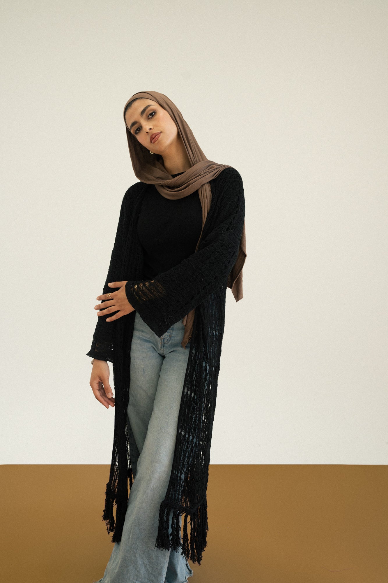 - Knee-length knit cardigan with a relaxed fit and fringe detailing for a touch of texture and movement.