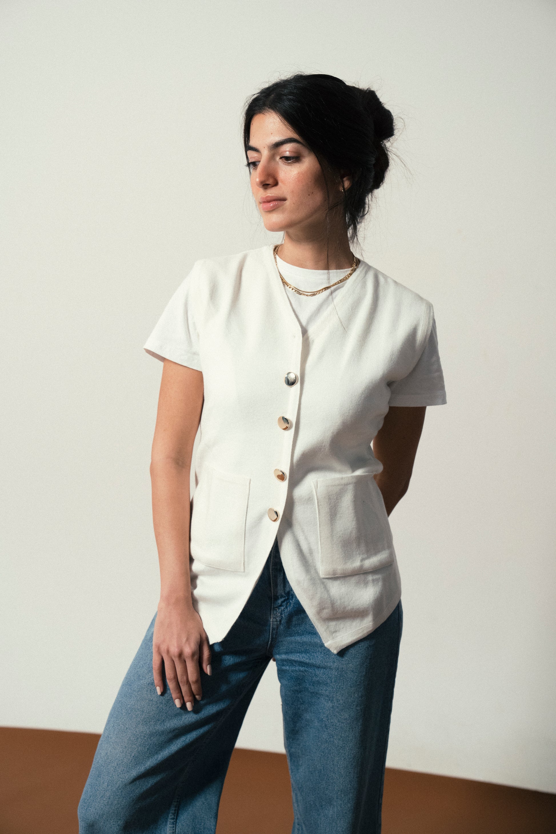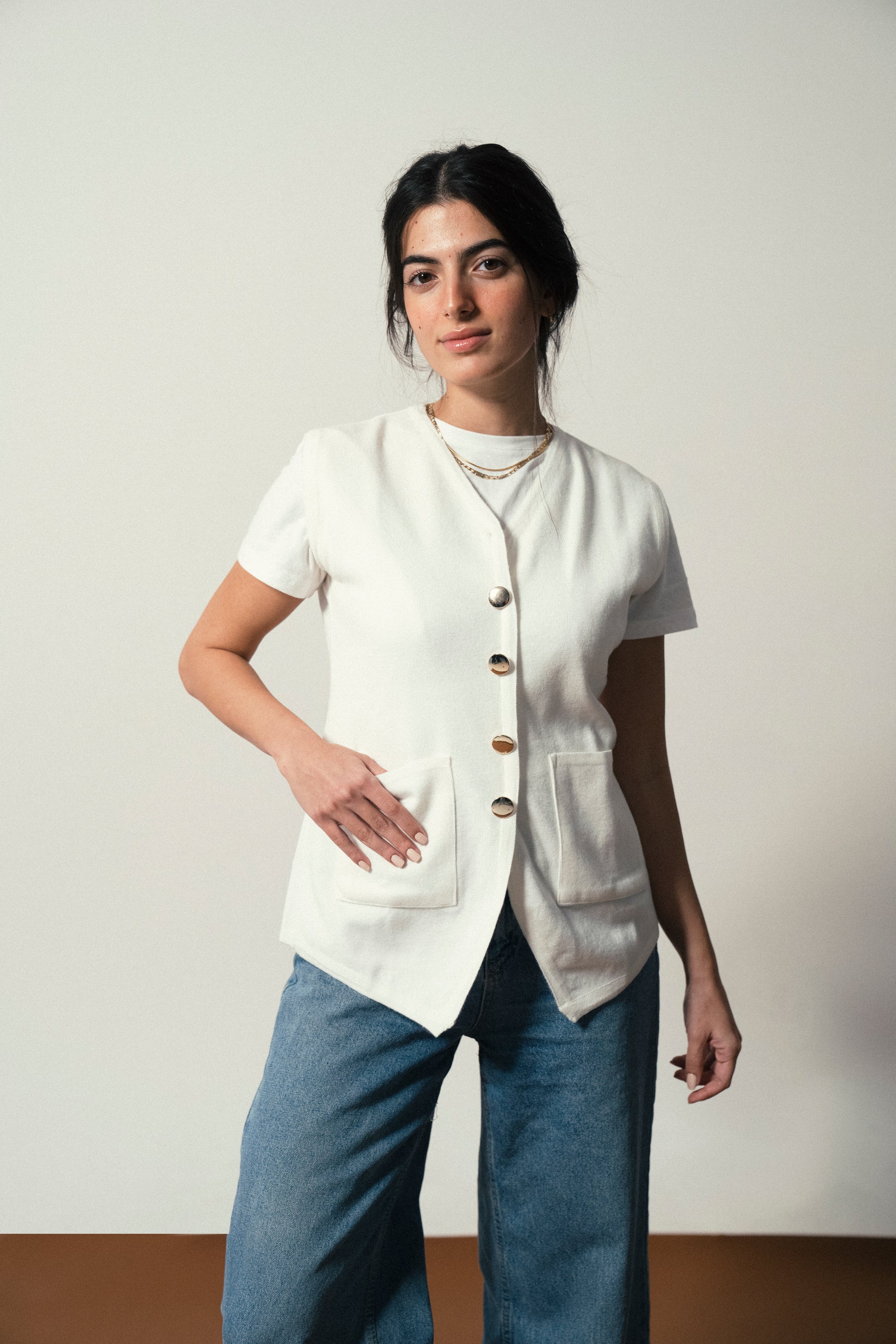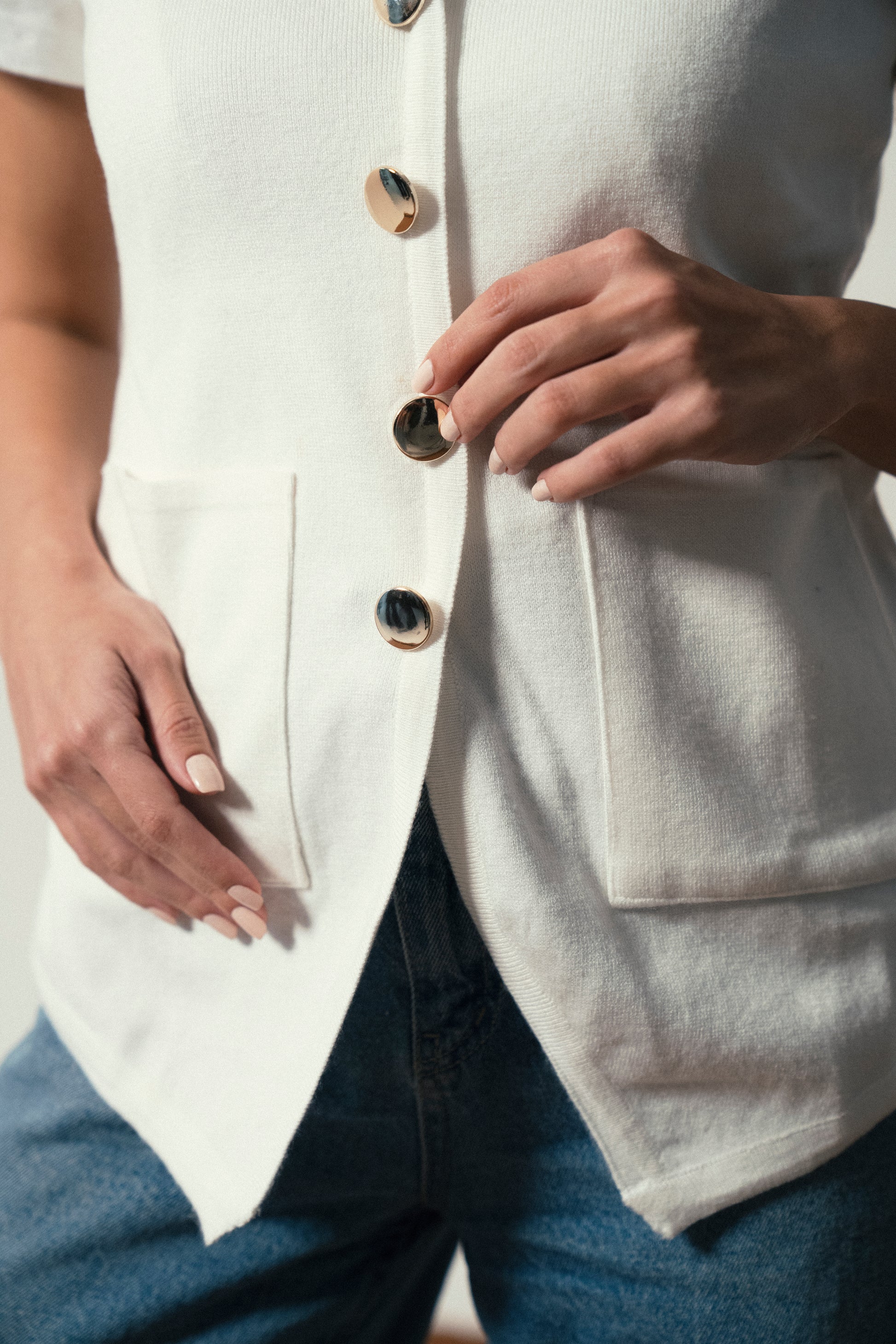 A stylish tricot vest featuring elegant gold buttons down the front and two pockets. This versatile piece adds a touch of sophistication to any outfit, perfect for layering or wearing alone.