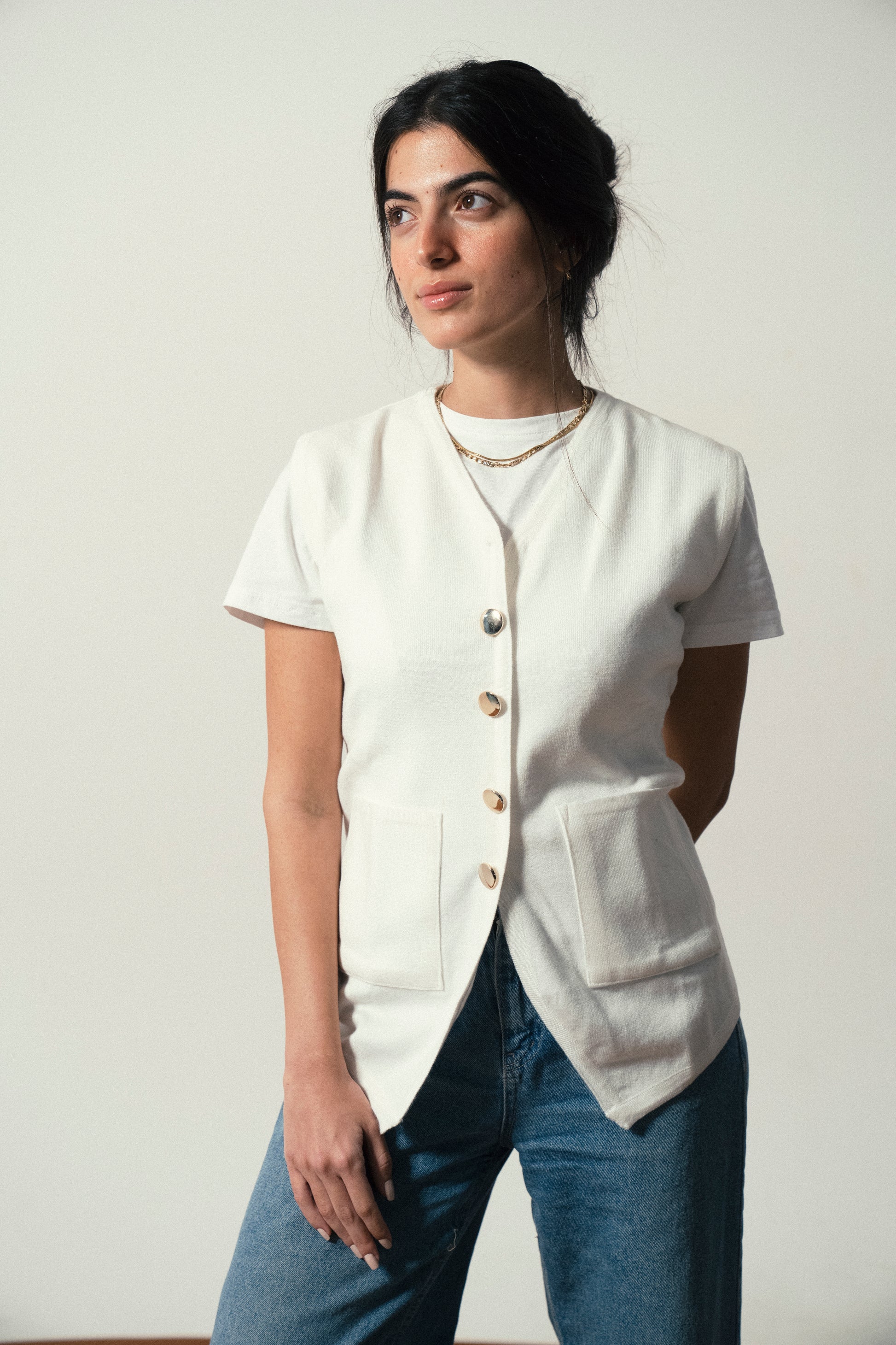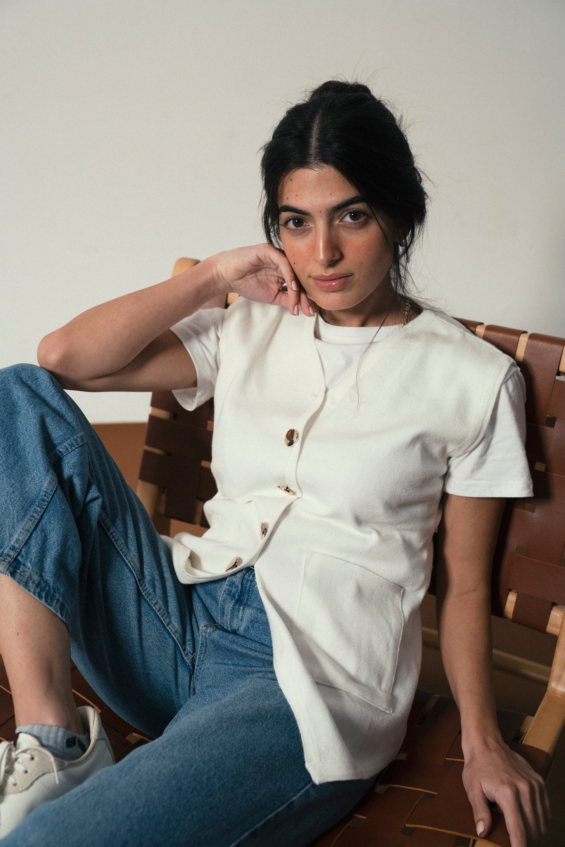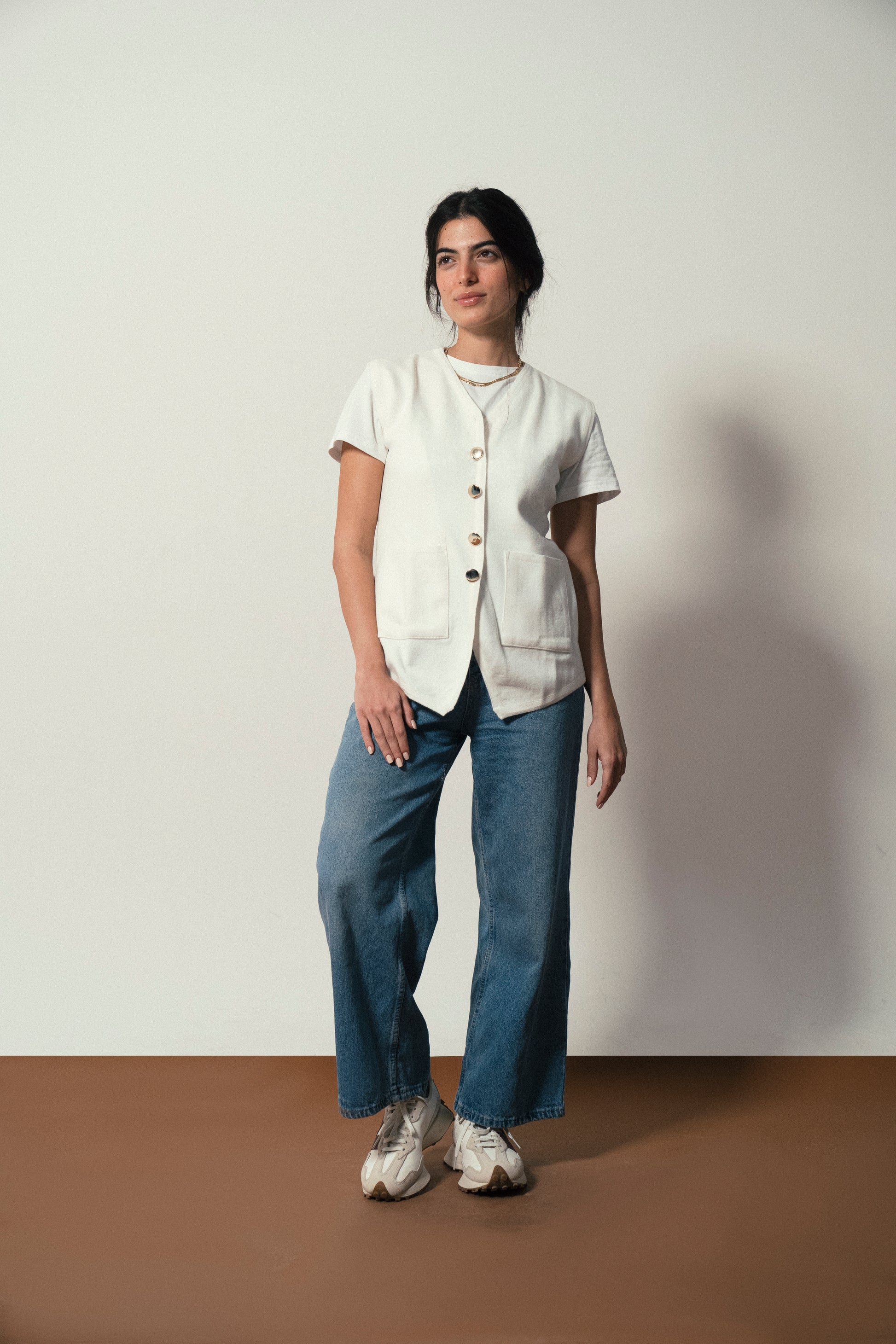 A stylish tricot vest featuring elegant gold buttons down the front and two pockets. This versatile piece adds a touch of sophistication to any outfit, perfect for layering or wearing alone.