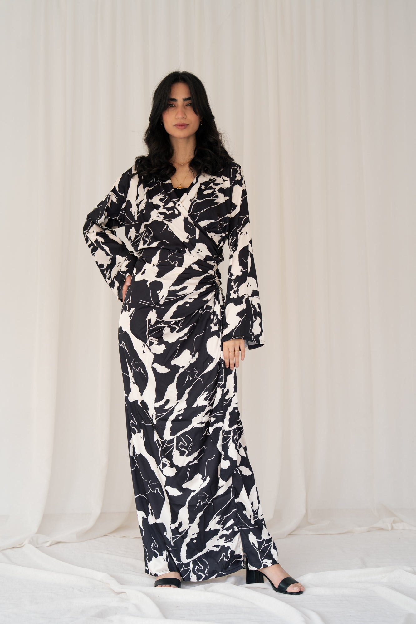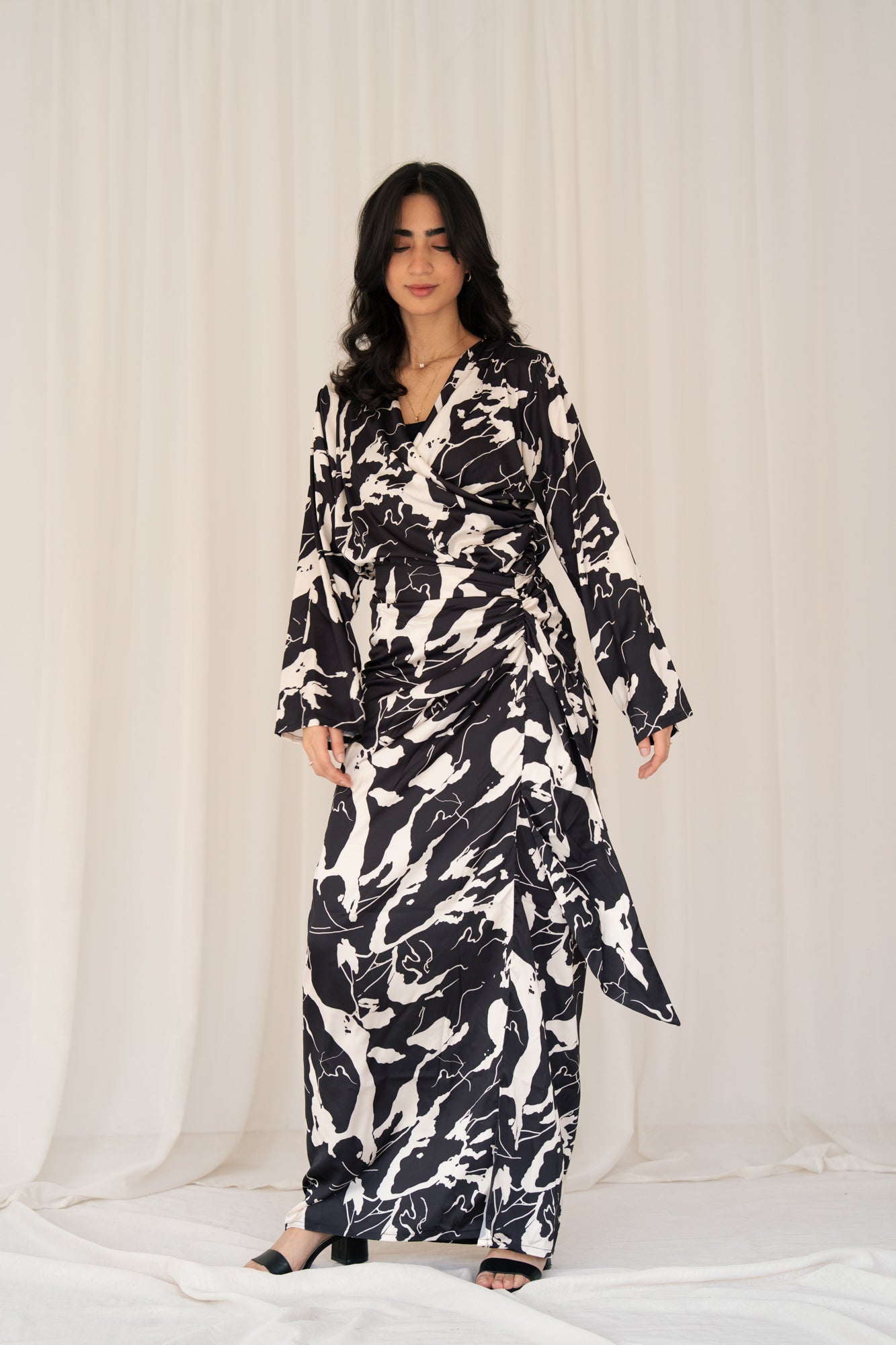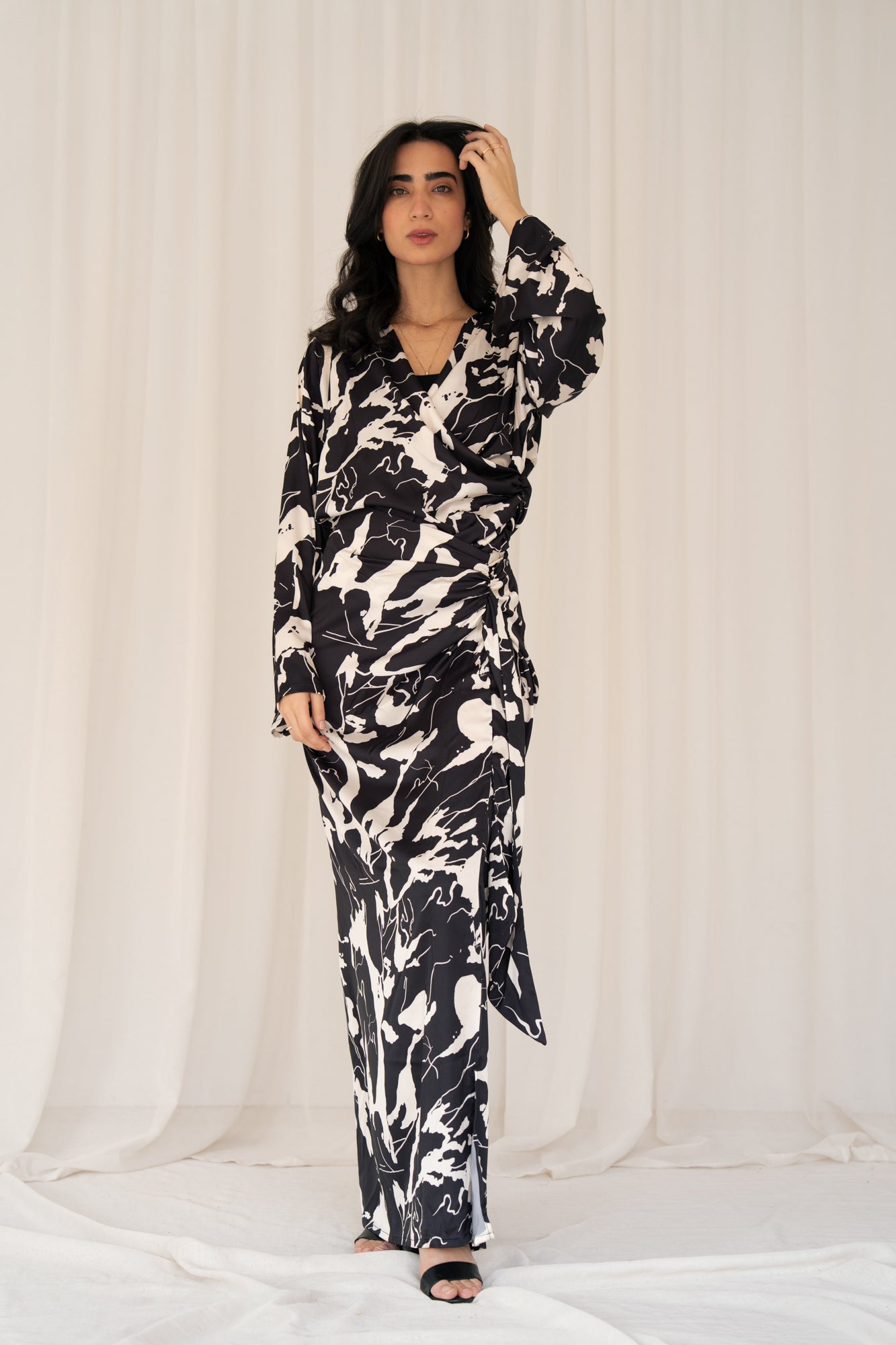 - Satin printed skirt designed to match the blouse for a coordinated, elegant set.