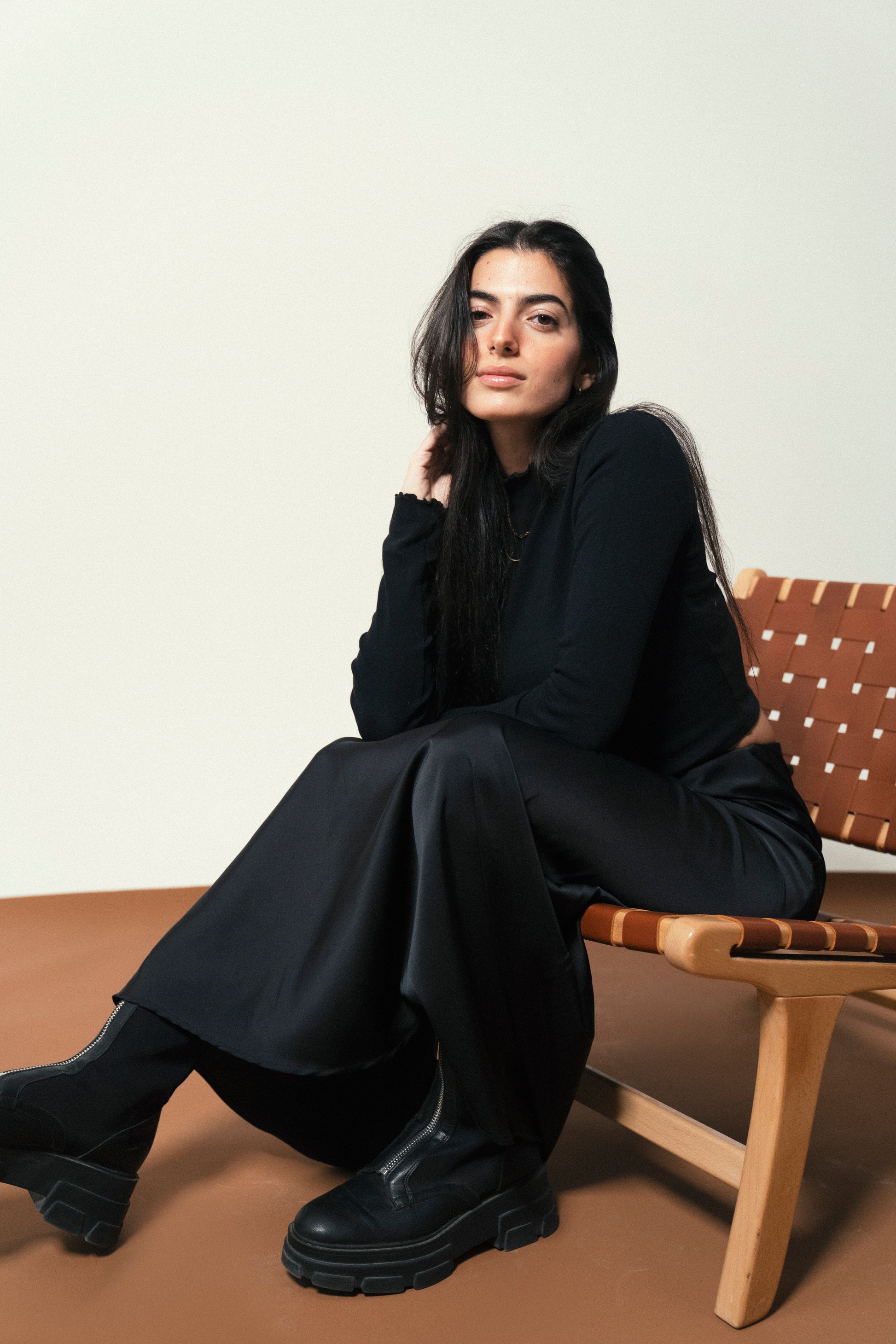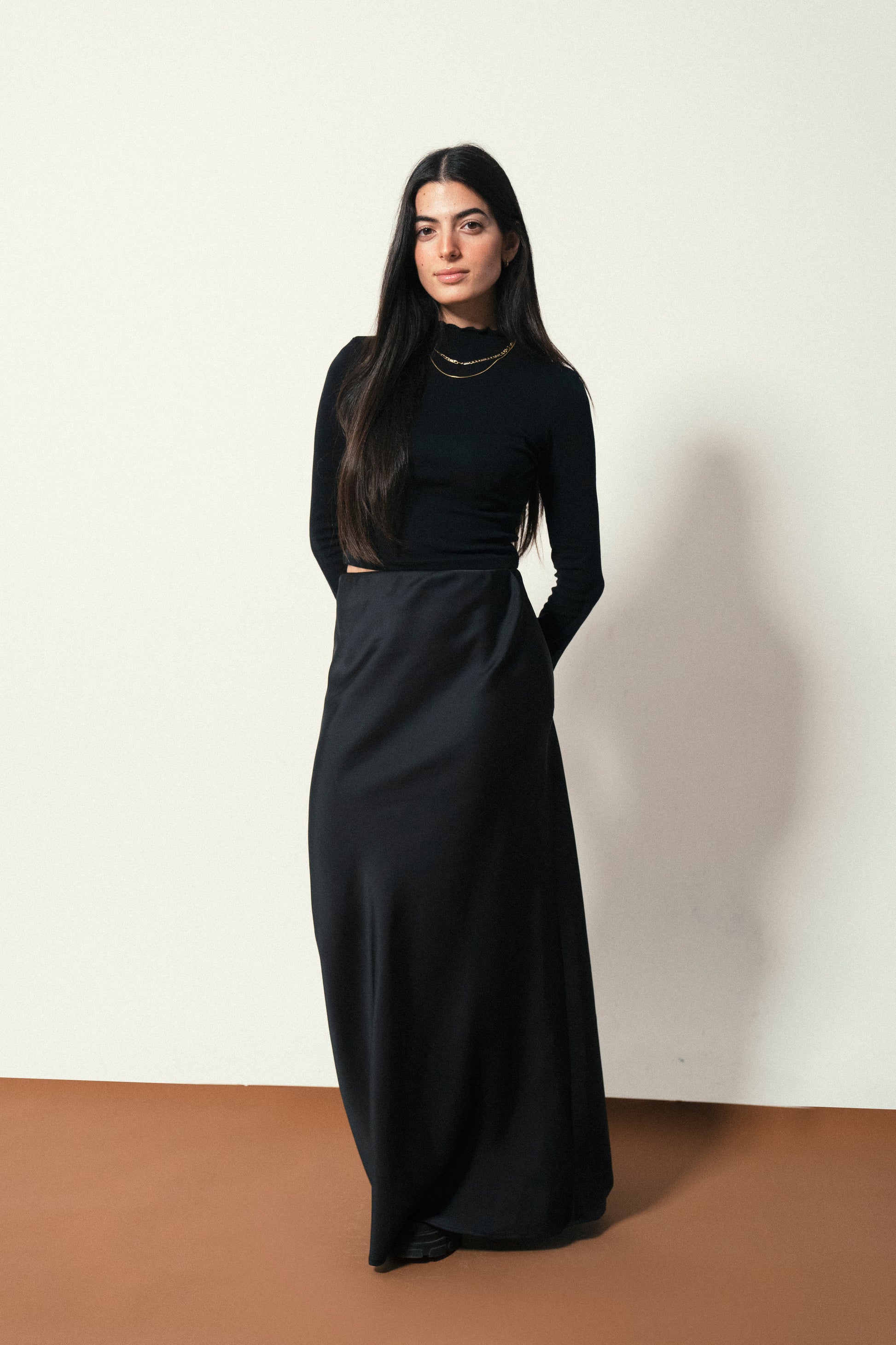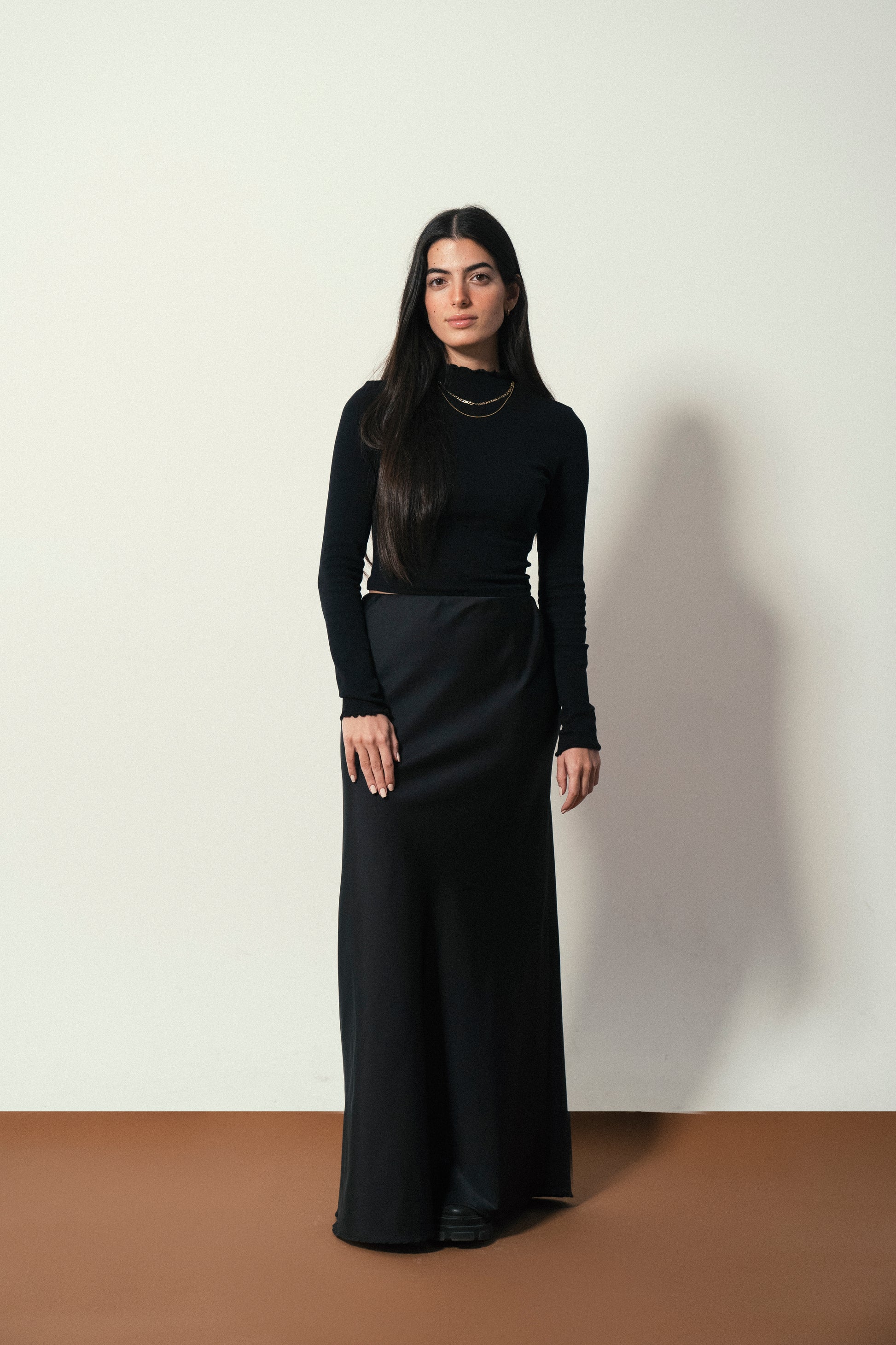 An elegant high-waist long satin skirt with a comfortable elastic waistband. This flowy skirt drapes beautifully, making it perfect for both casual outings and special occasions.