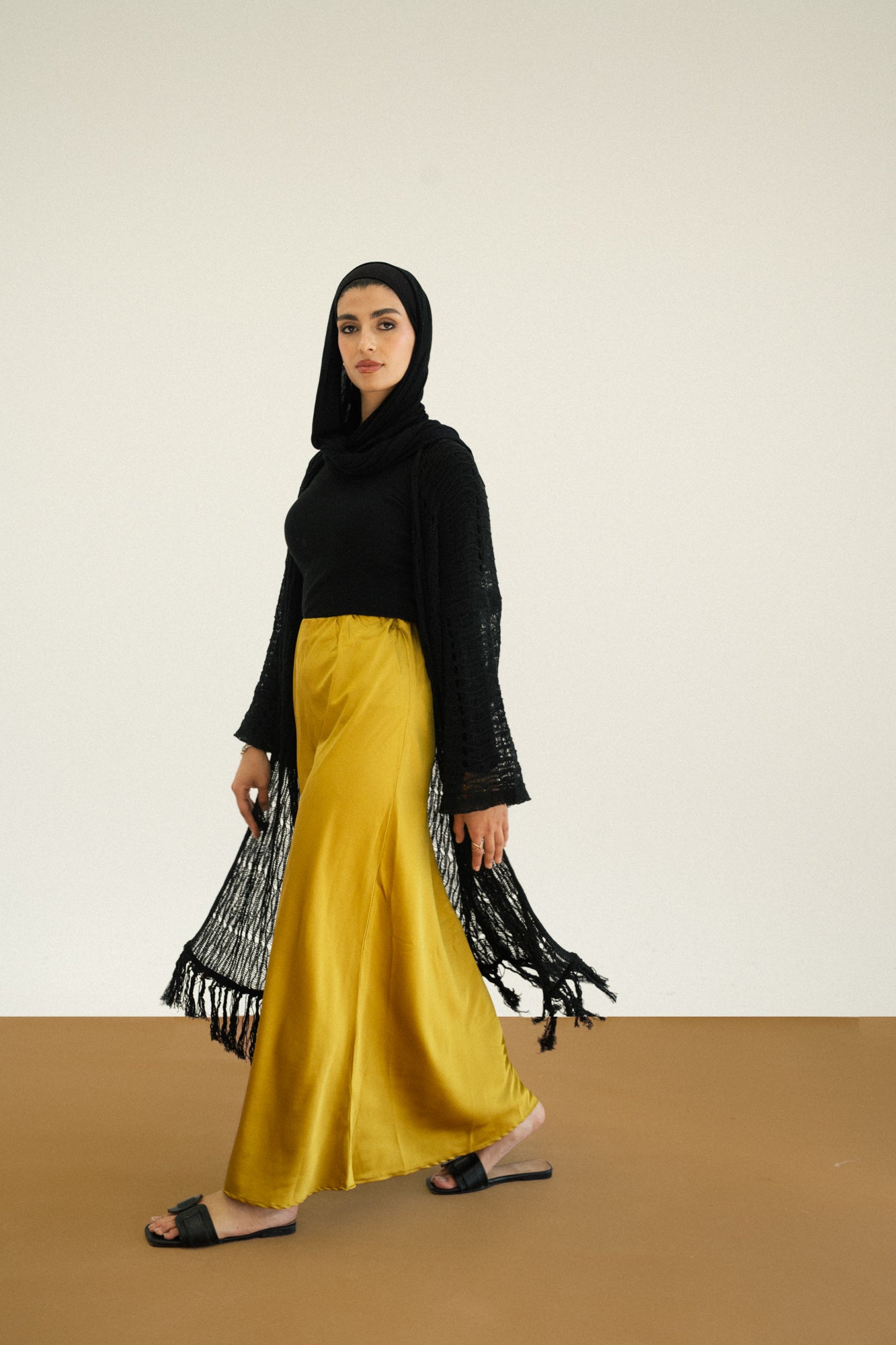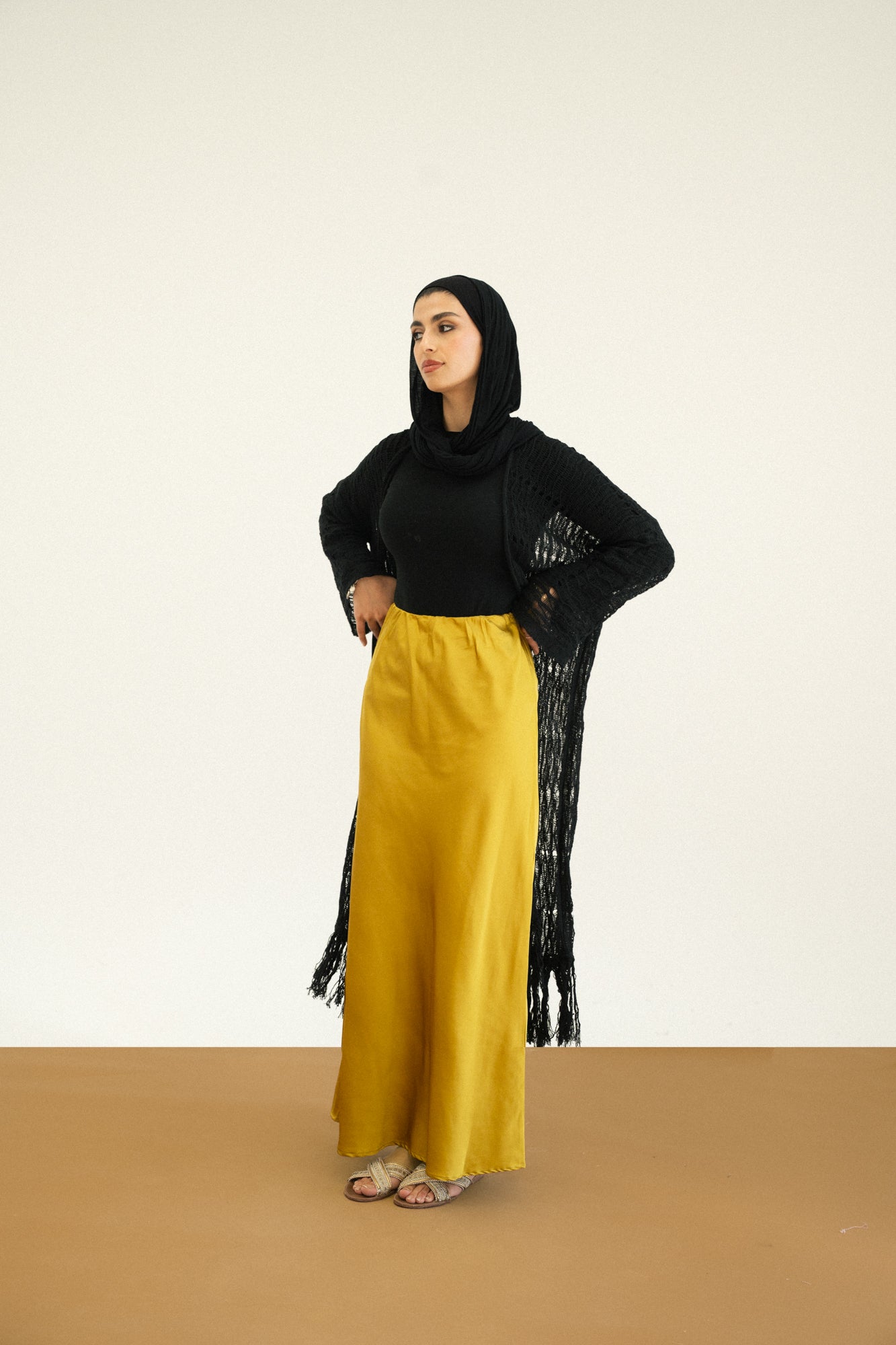 An elegant high-waist long satin skirt with a comfortable elastic waistband. This flowy skirt drapes beautifully, making it perfect for both casual outings and special occasions.