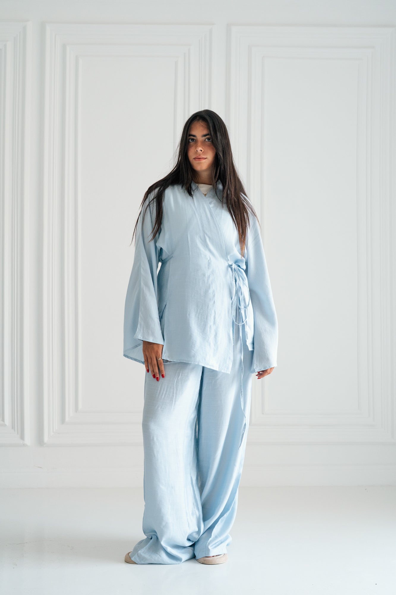 Includes wide-leg pants with a string-tied, elastic waist and a matching kimono featuring wide sleeves and adjustable front ties—ideal for relaxed days with a refined edge.
