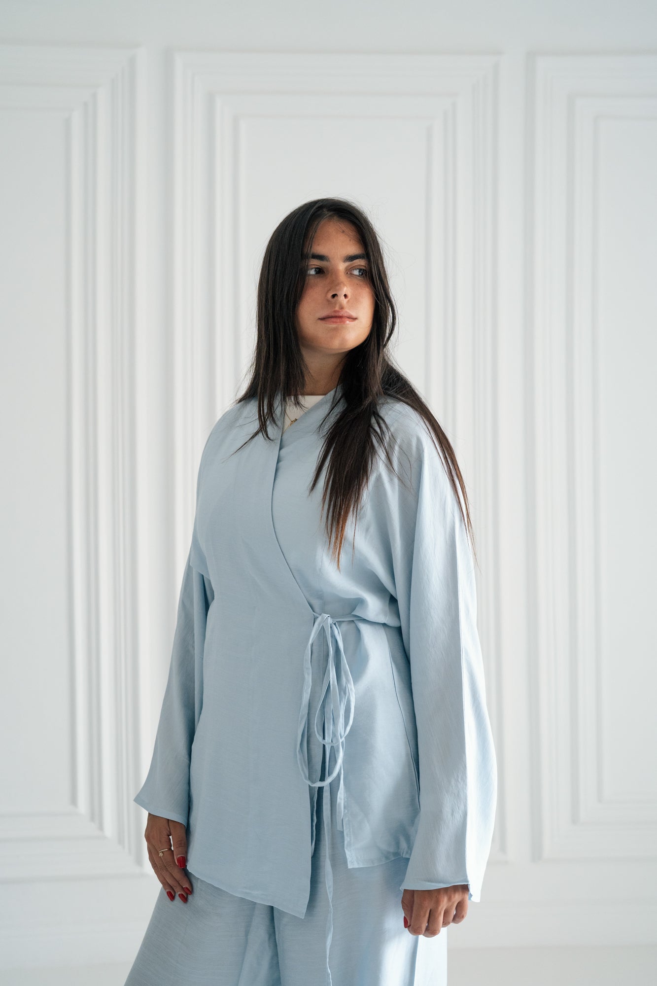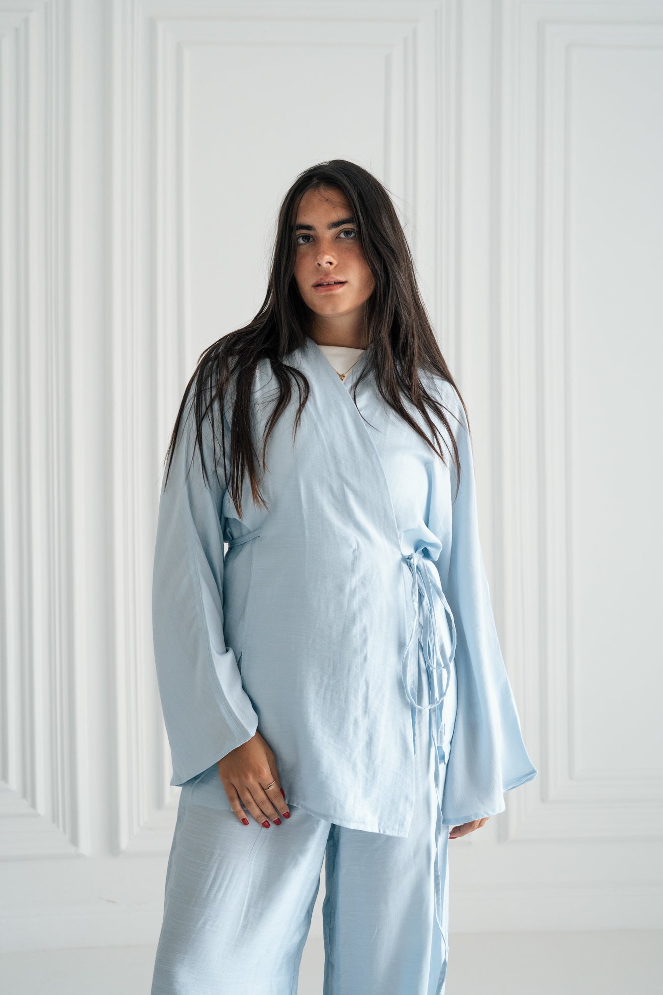 - Kimono top with wide sleeves and front string closure.
