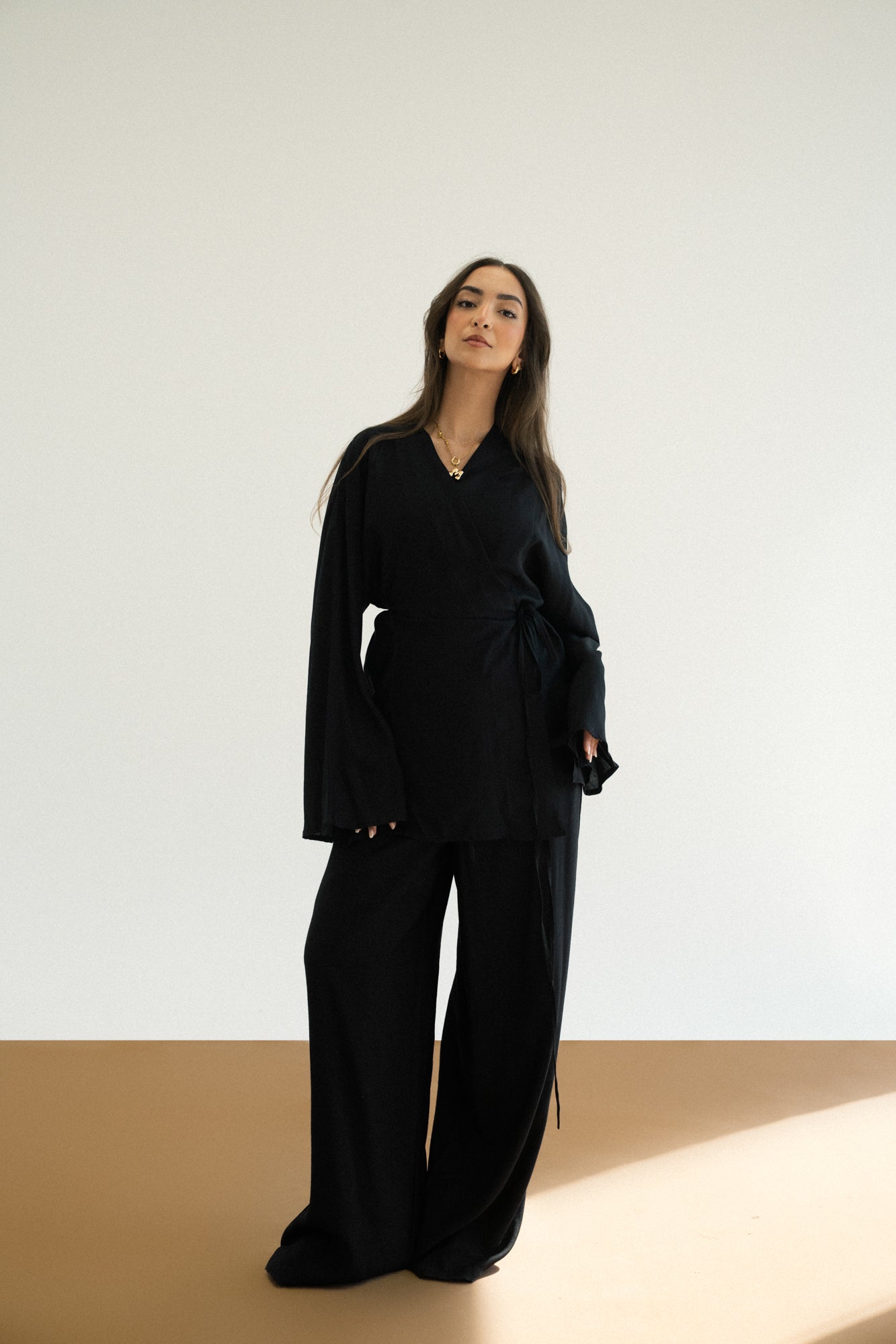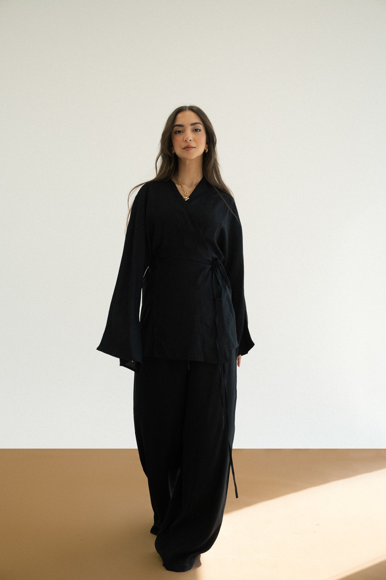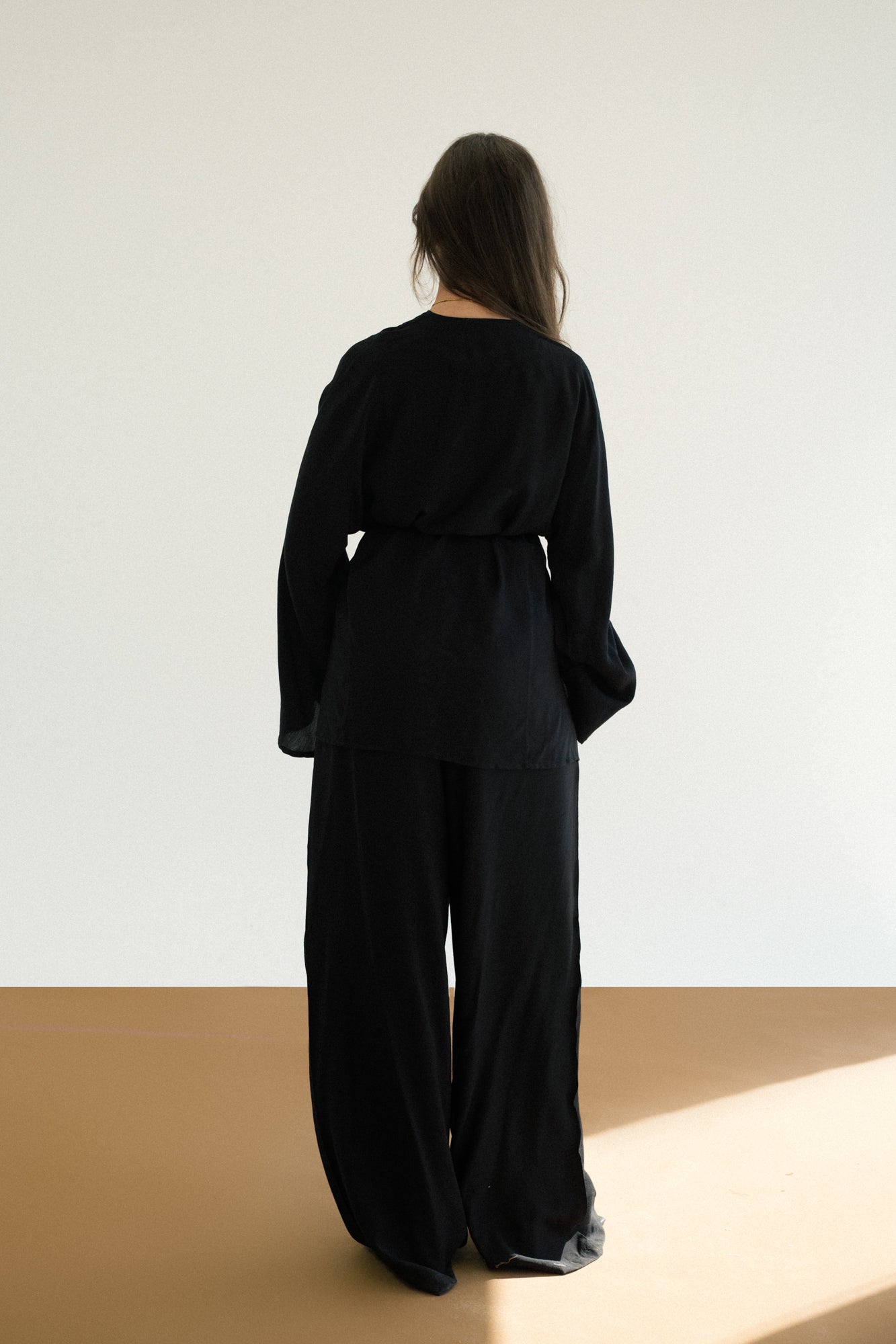 Includes wide-leg pants with a string-tied, elastic waist and a matching kimono featuring wide sleeves and adjustable front ties—ideal for relaxed days with a refined edge.