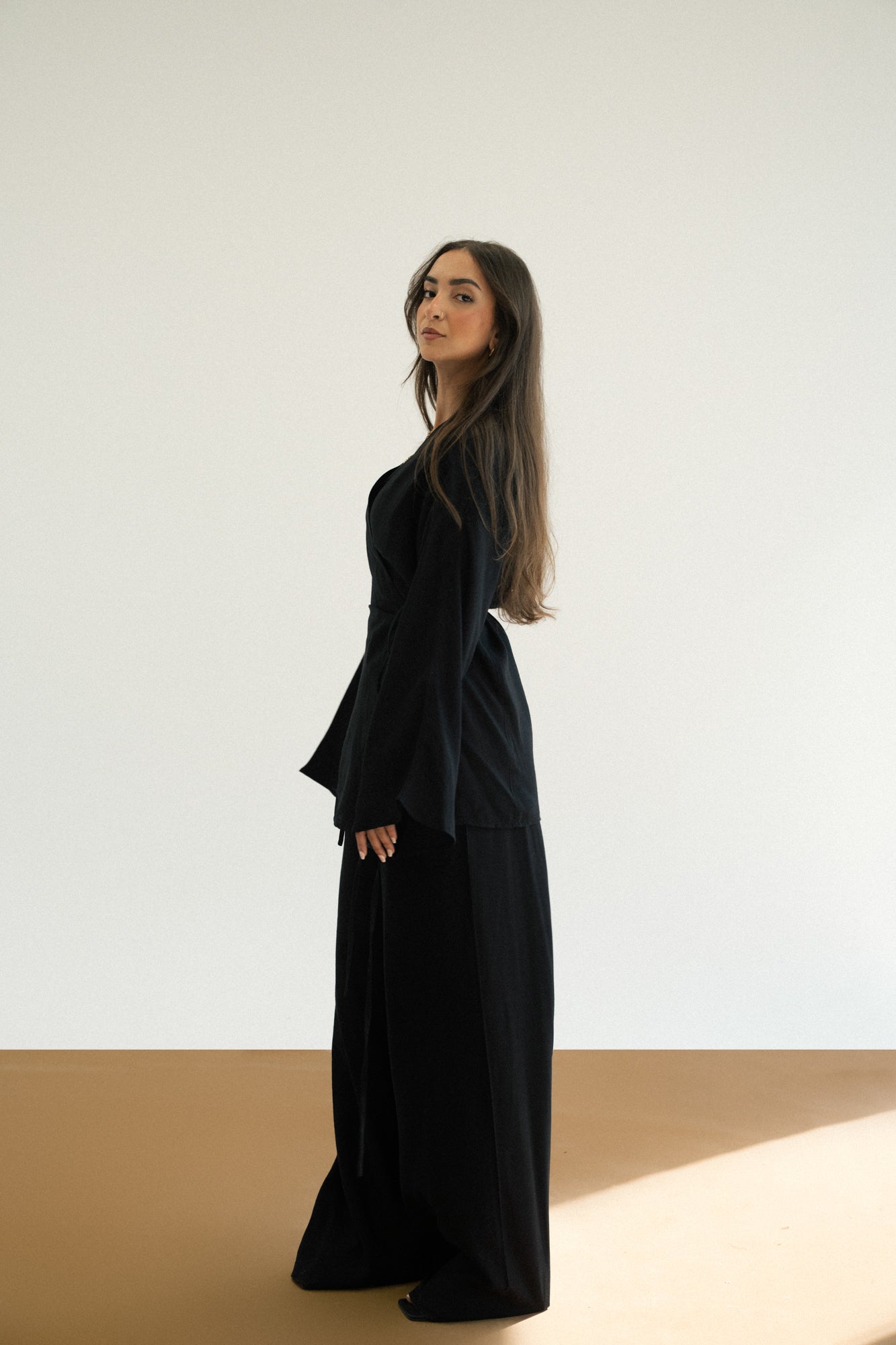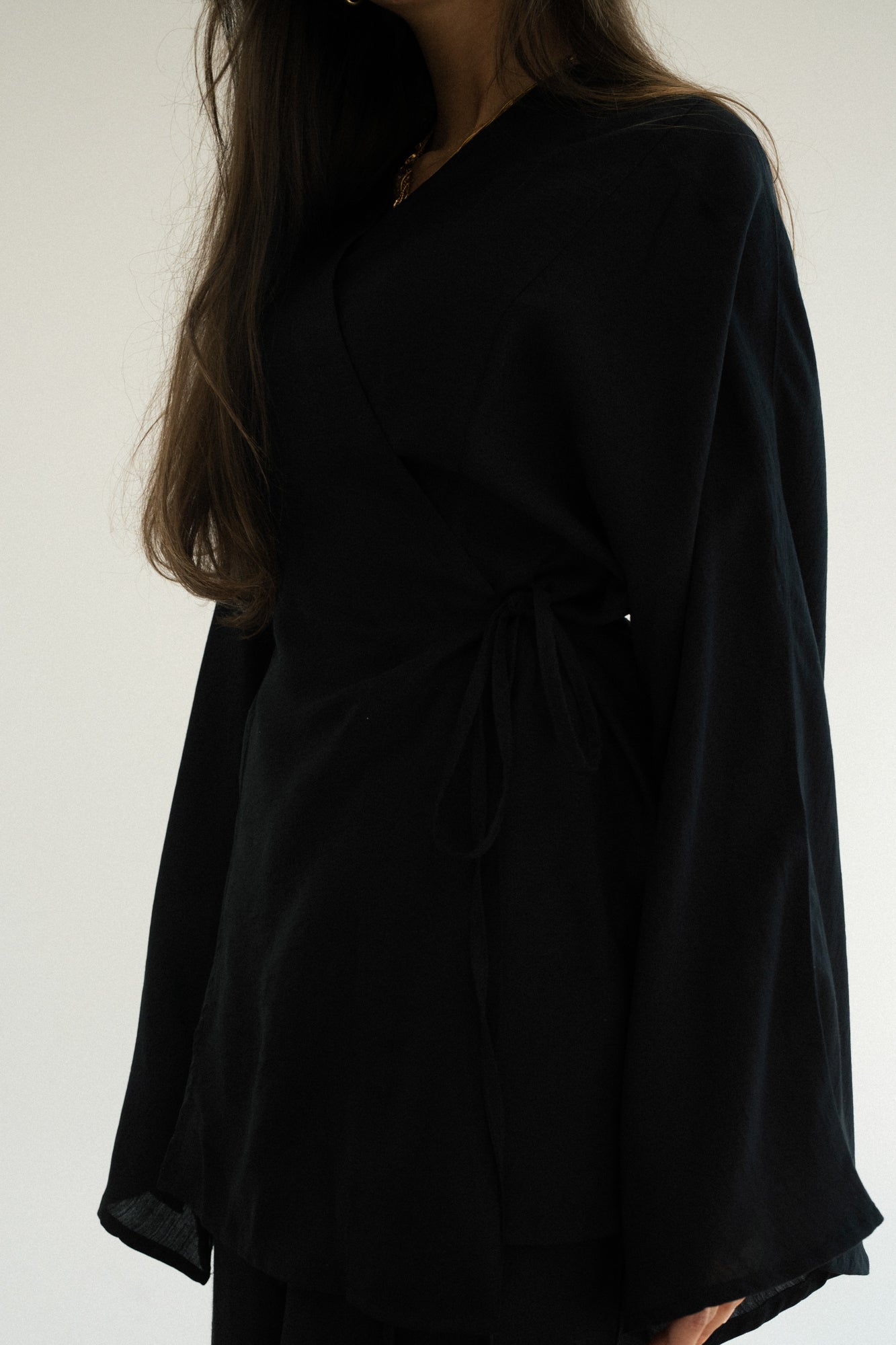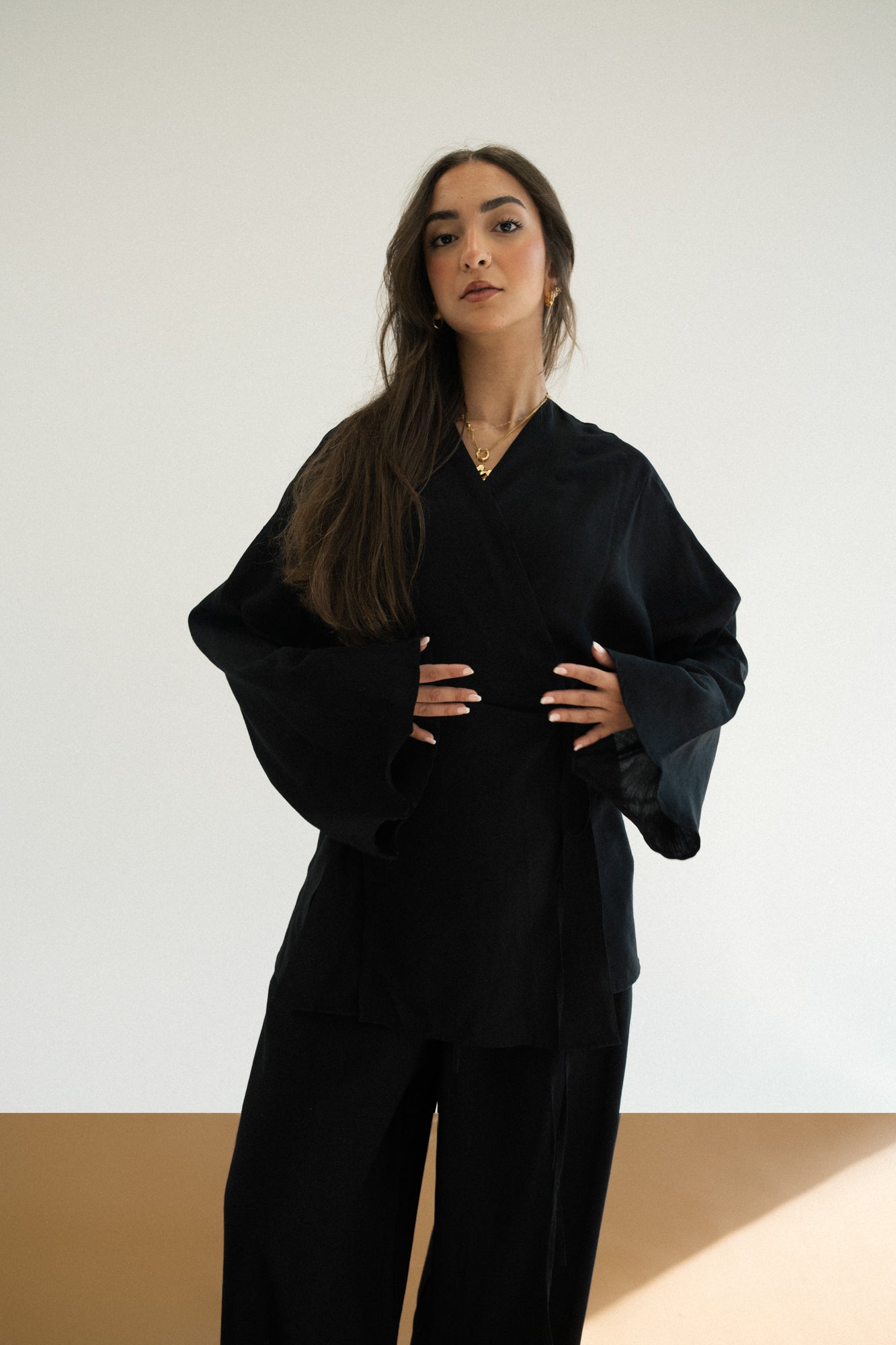 Includes wide-leg pants with a string-tied, elastic waist and a matching kimono featuring wide sleeves and adjustable front ties—ideal for relaxed days with a refined edge.
