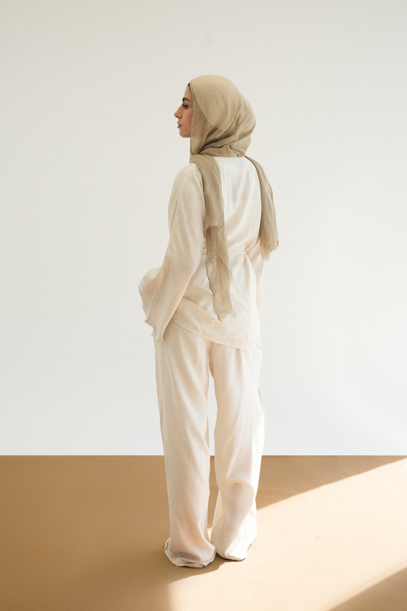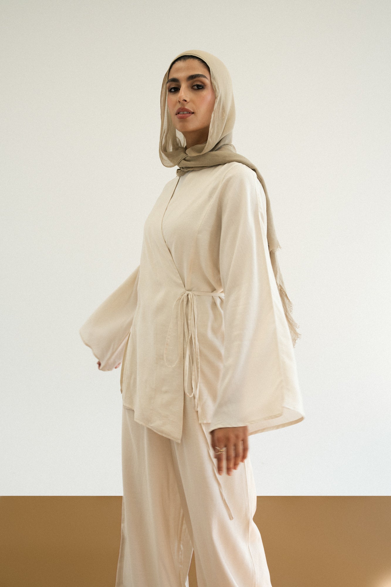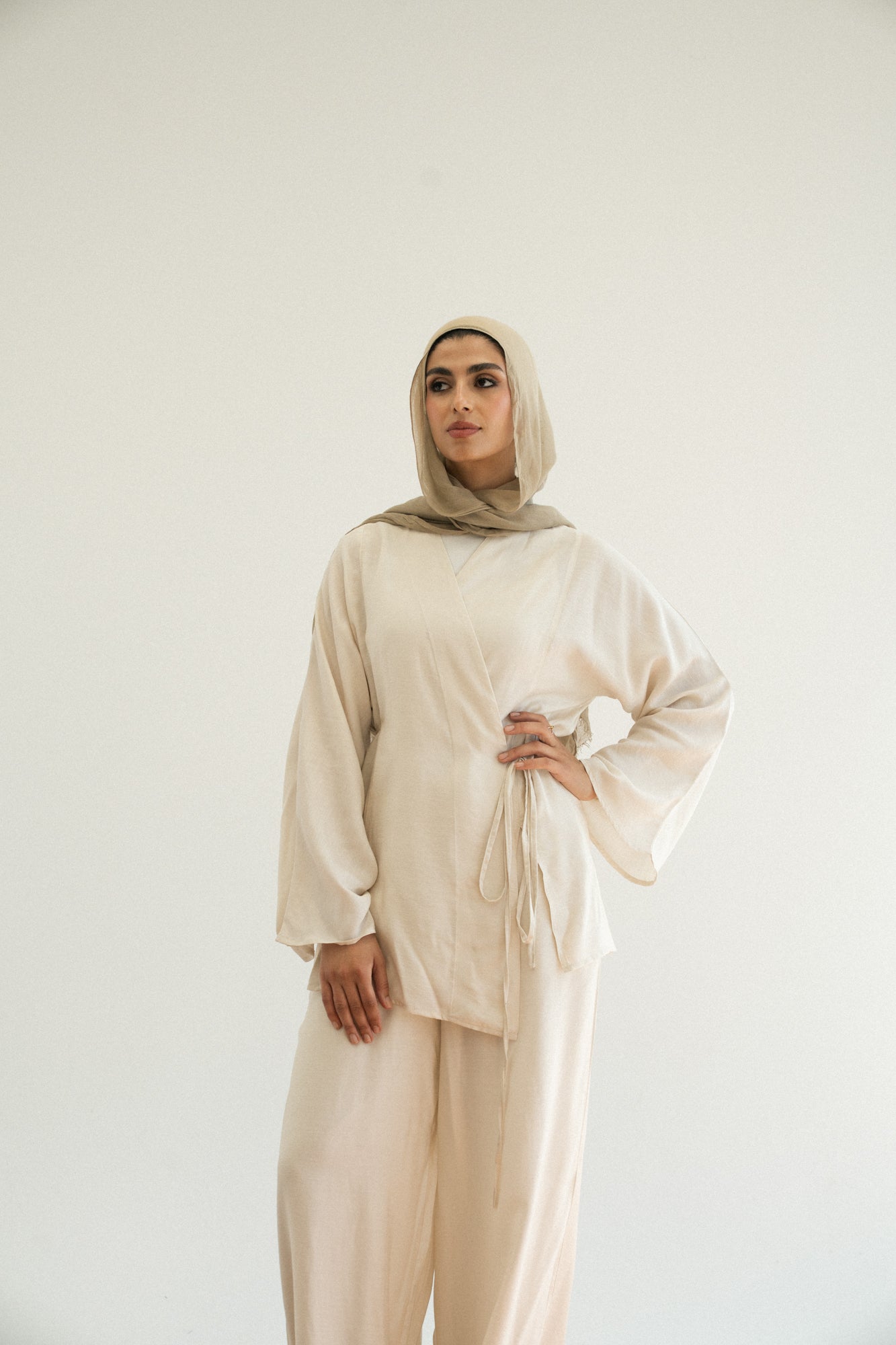 Includes wide-leg pants with a string-tied, elastic waist and a matching kimono featuring wide sleeves and adjustable front ties—ideal for relaxed days with a refined edge.