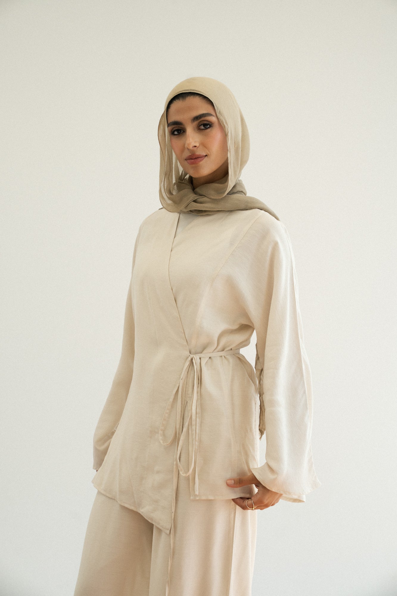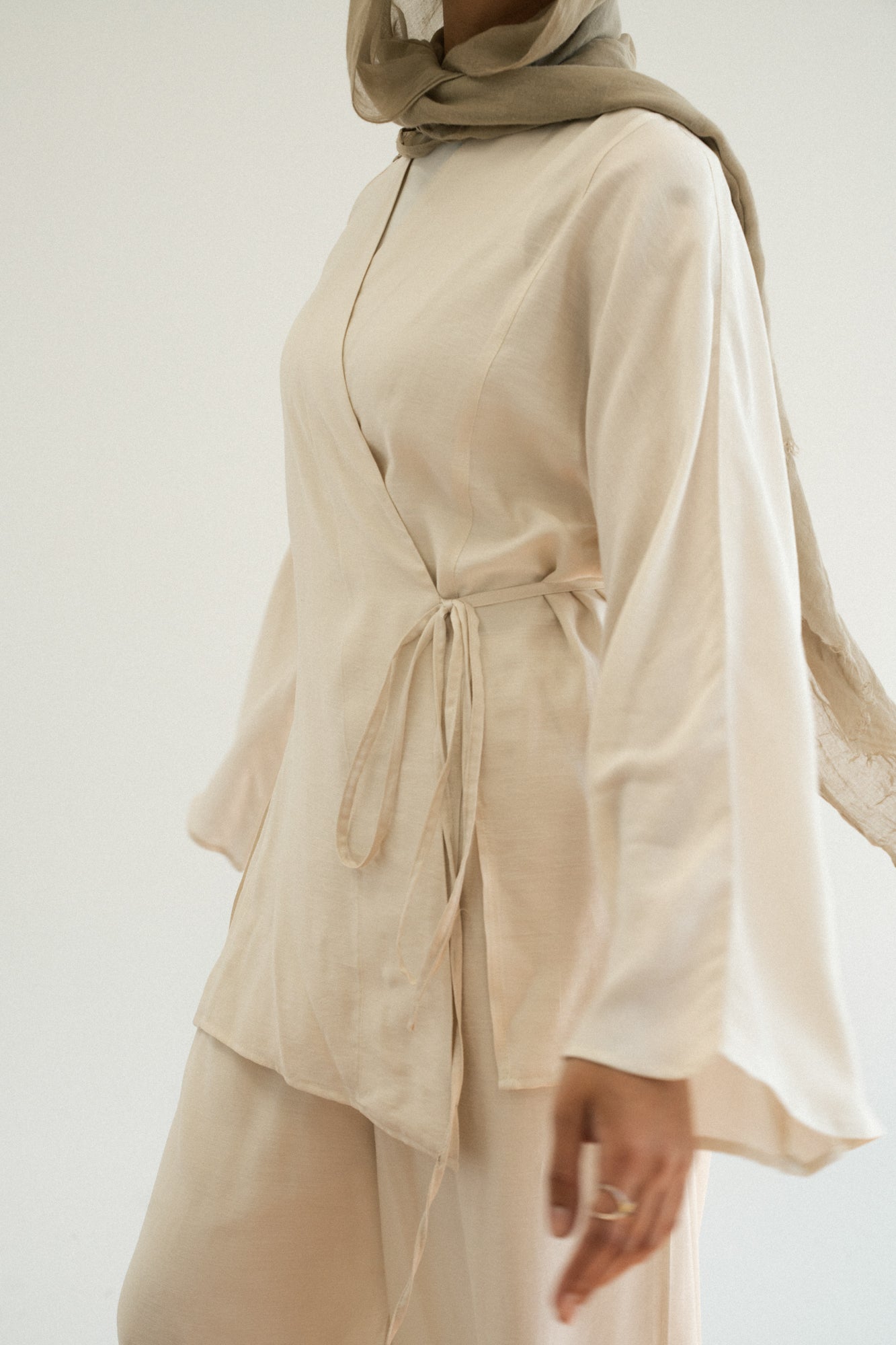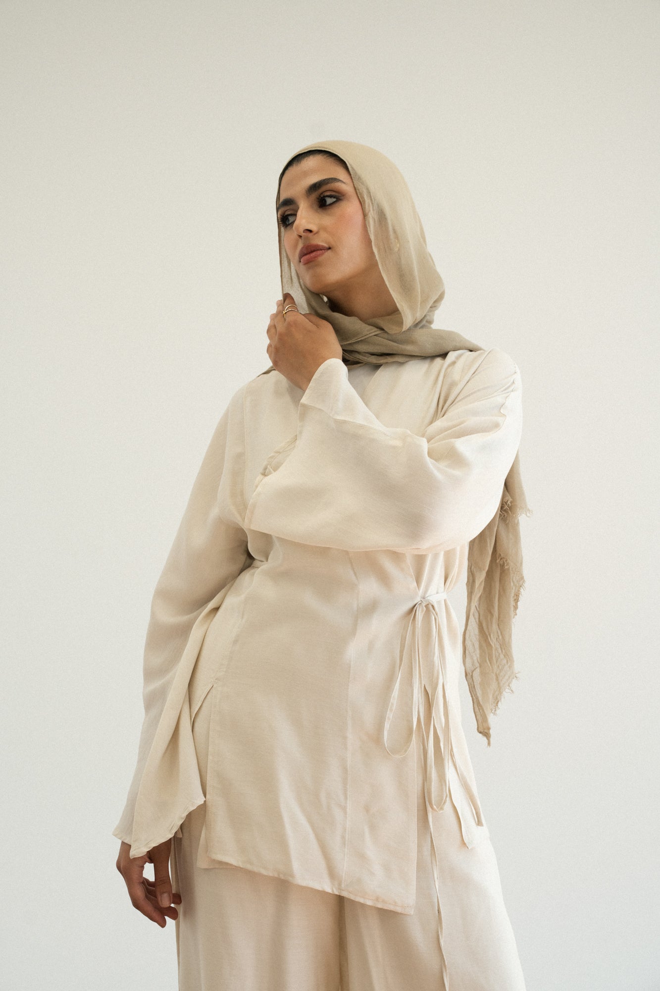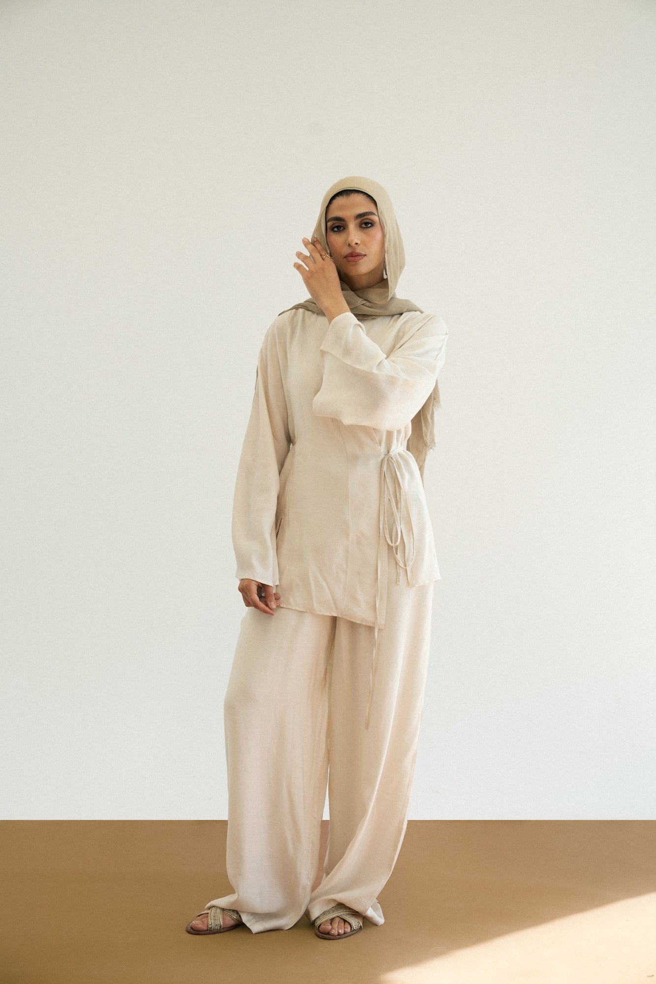 Includes wide-leg pants with a string-tied, elastic waist and a matching kimono featuring wide sleeves and adjustable front ties—ideal for relaxed days with a refined edge.