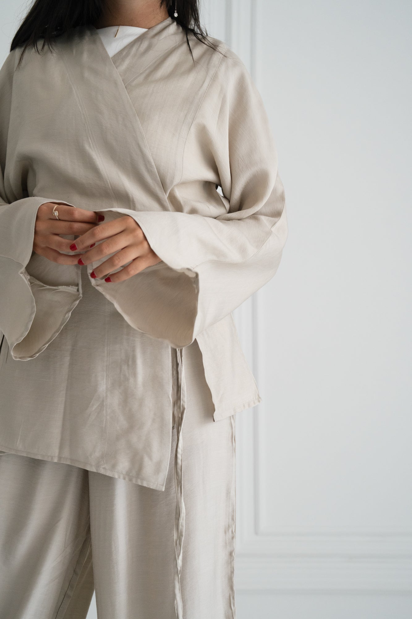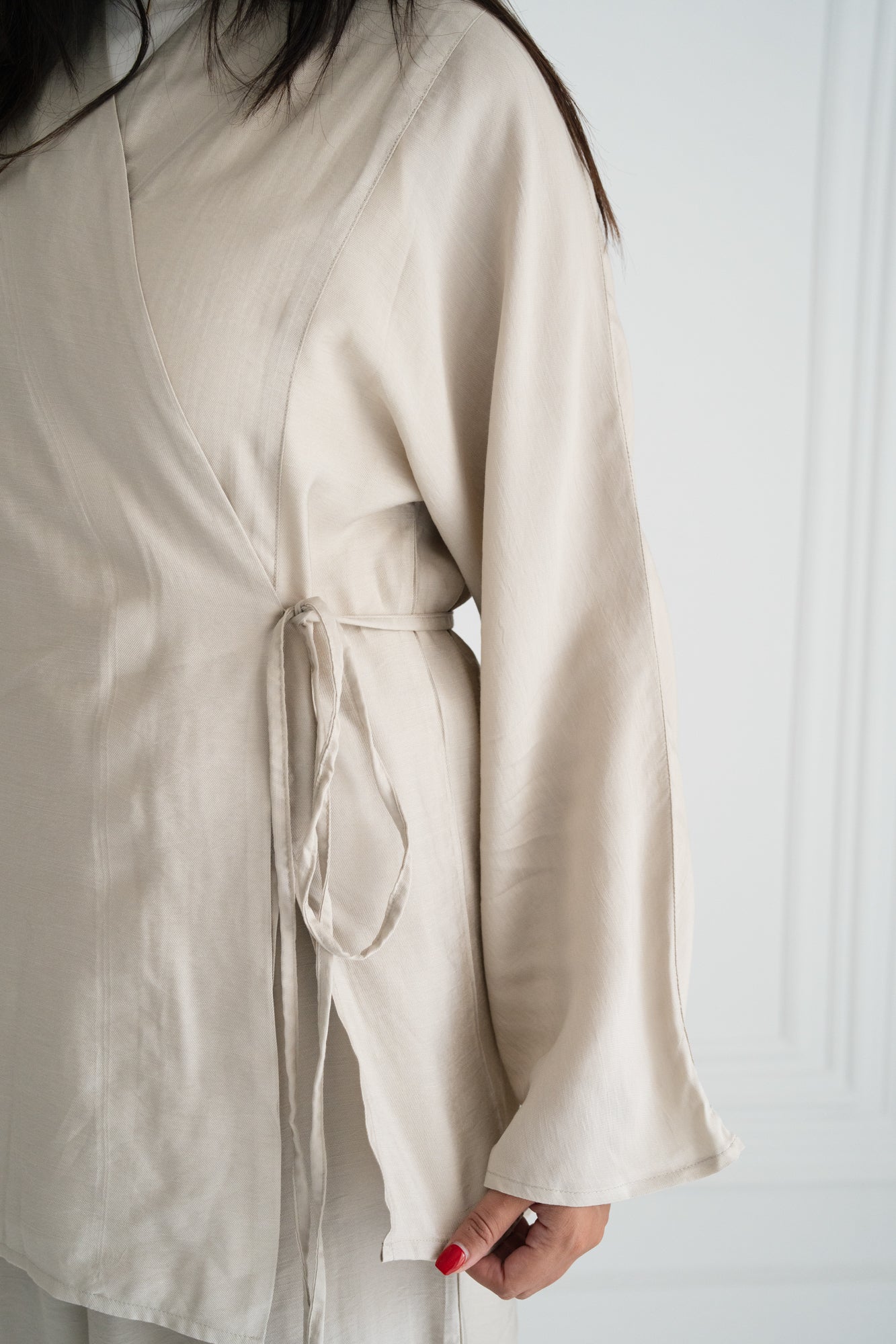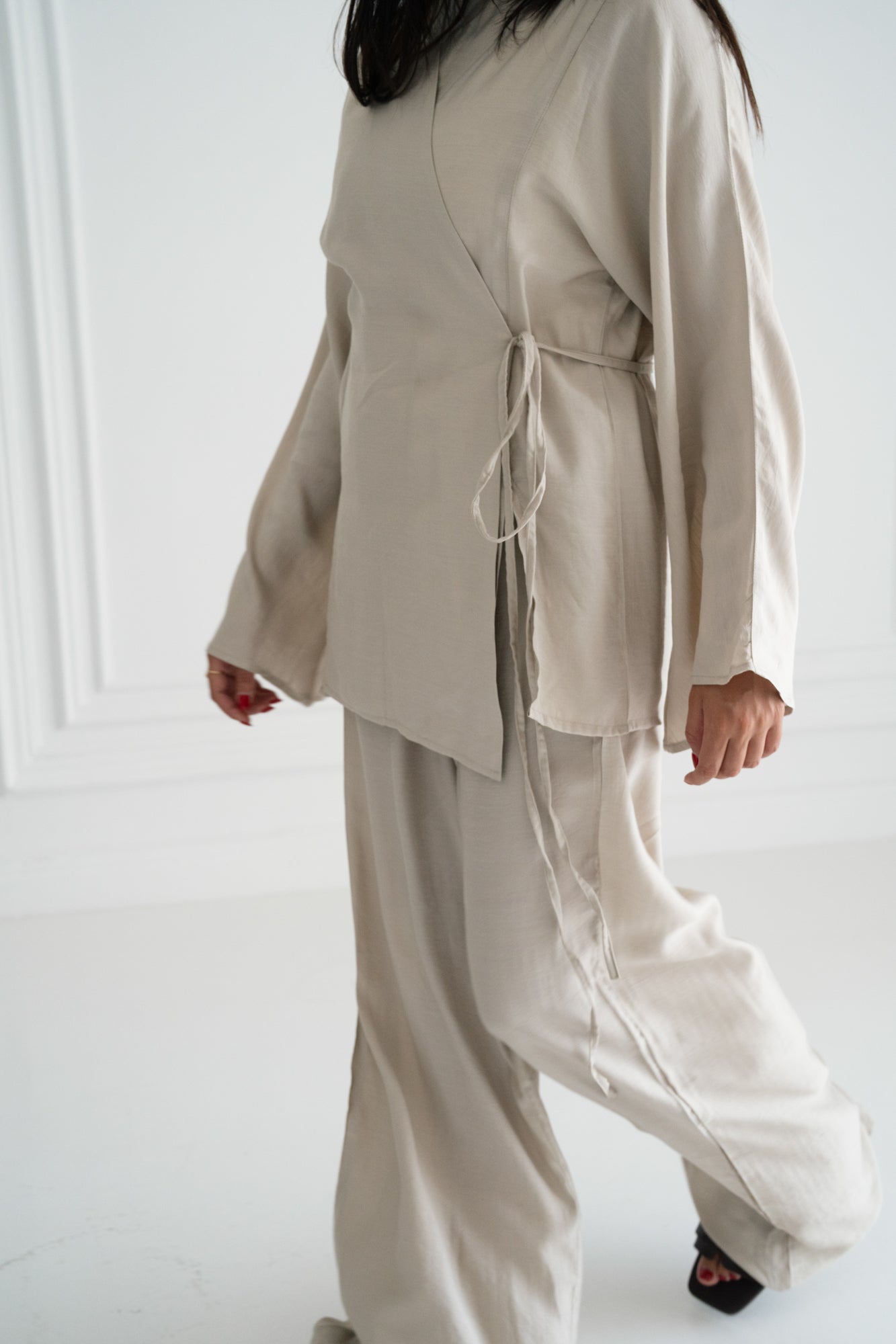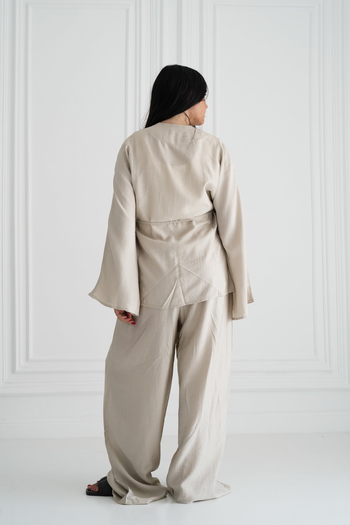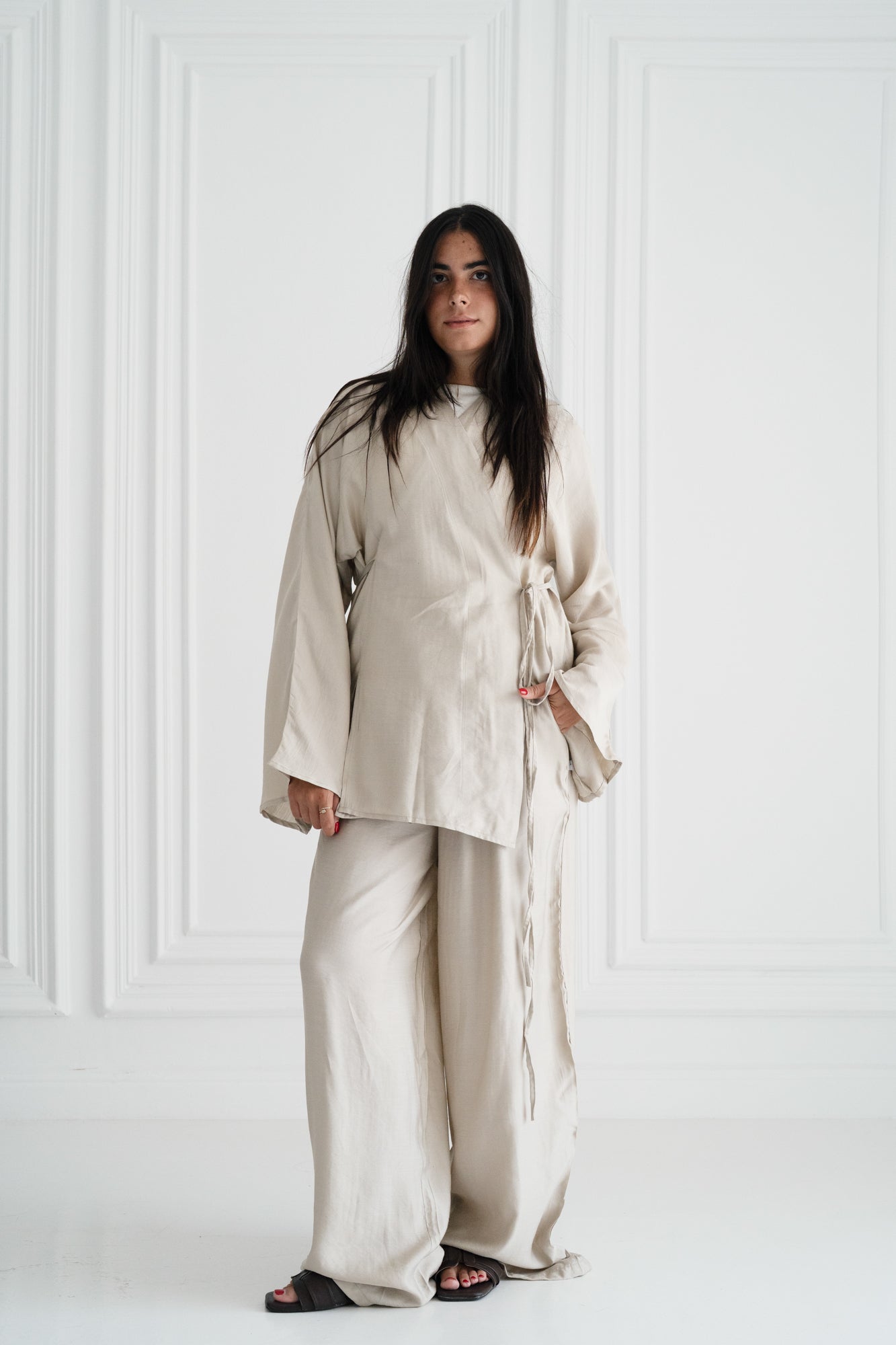 Includes wide-leg pants with a string-tied, elastic waist and a matching kimono featuring wide sleeves and adjustable front ties—ideal for relaxed days with a refined edge.