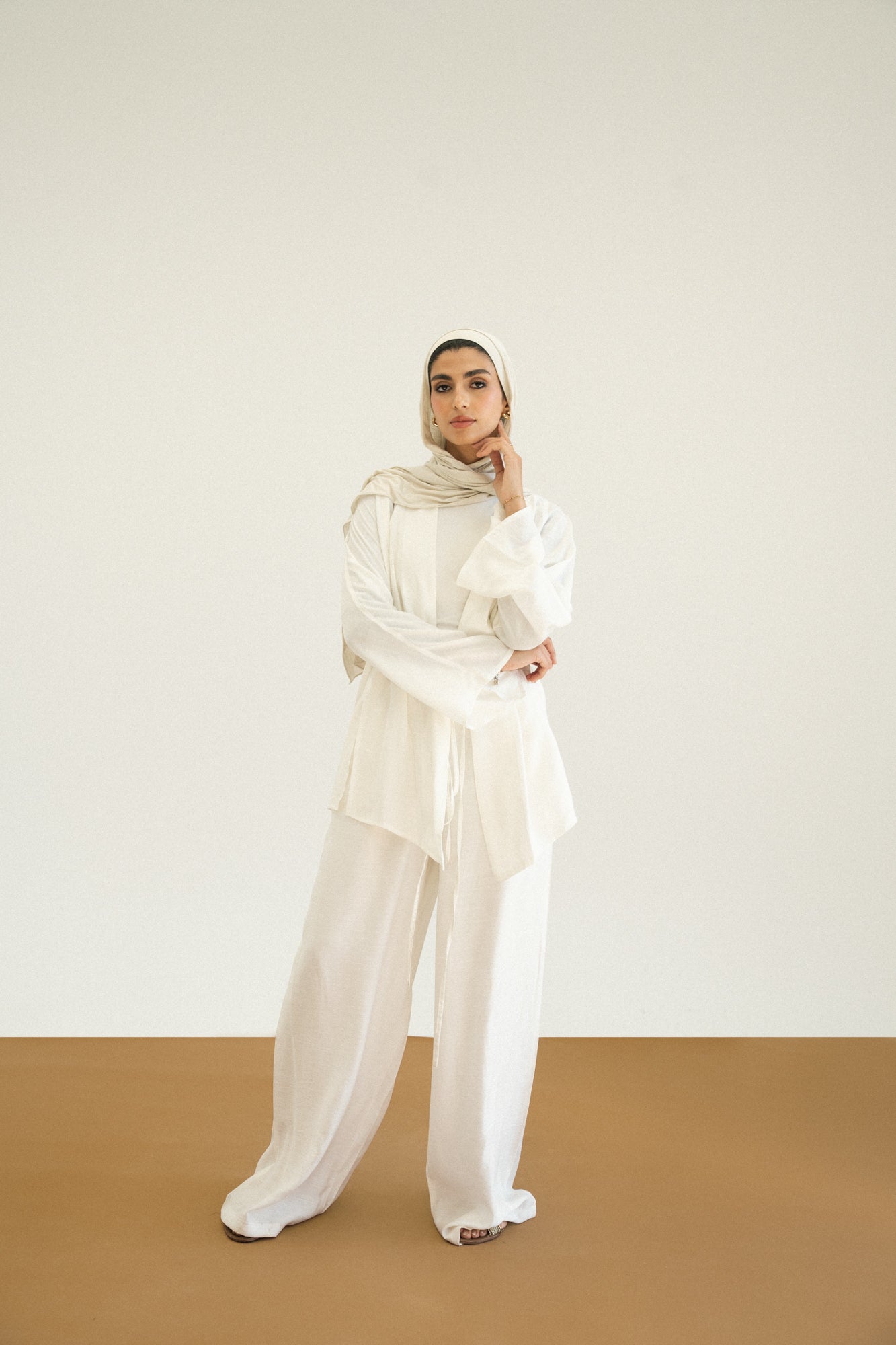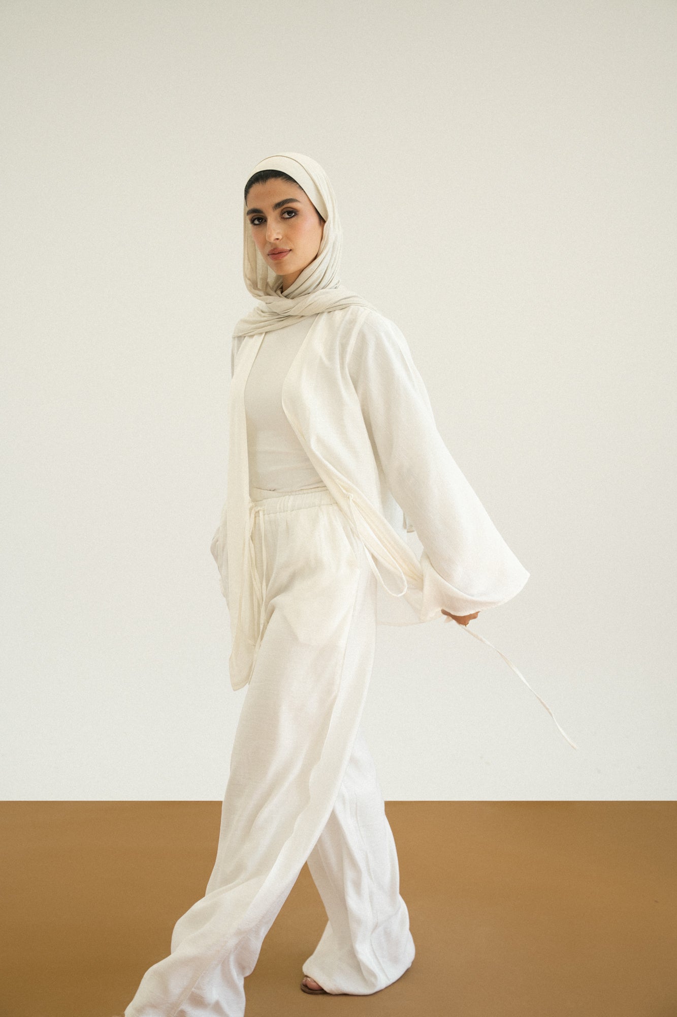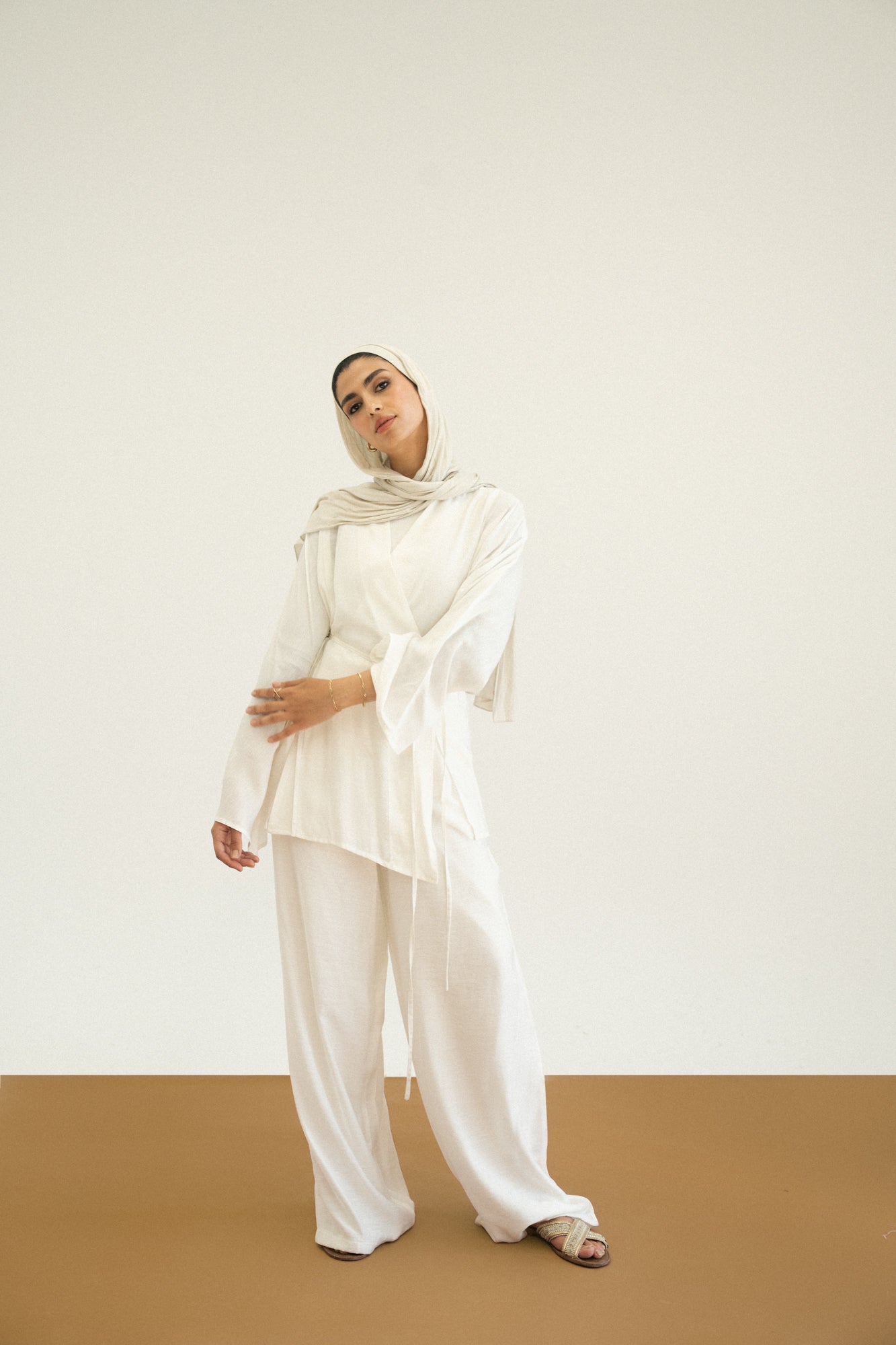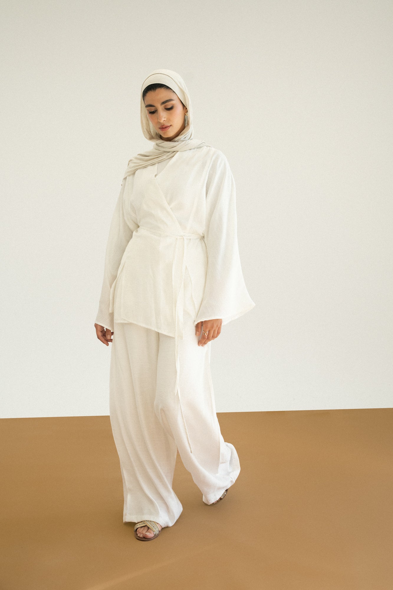 Includes wide-leg pants with a string-tied, elastic waist and a matching kimono featuring wide sleeves and adjustable front ties—ideal for relaxed days with a refined edge.