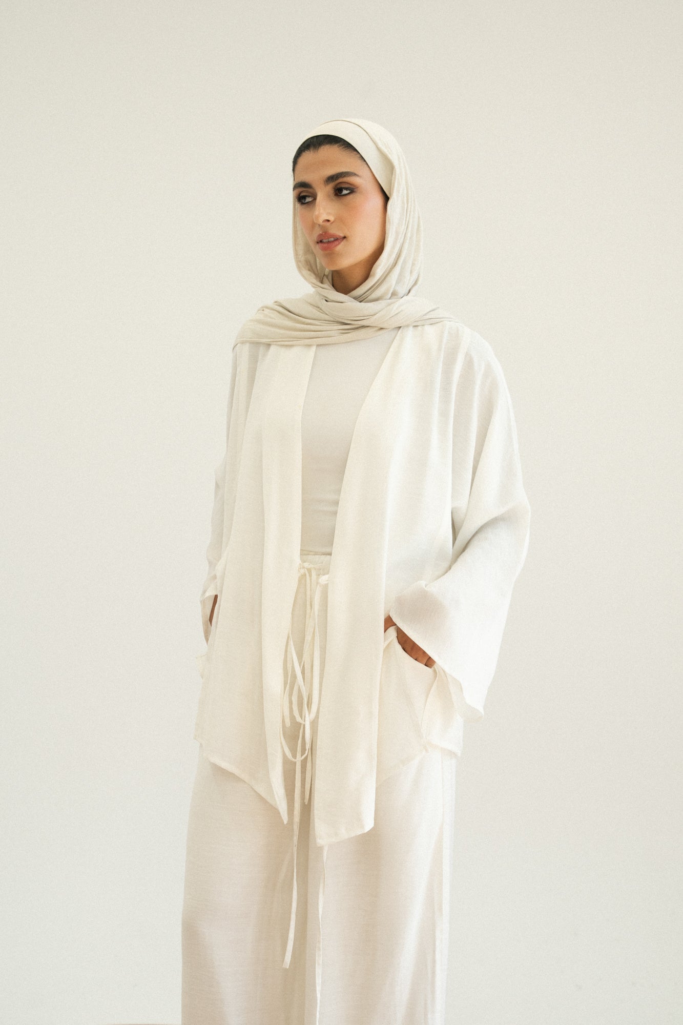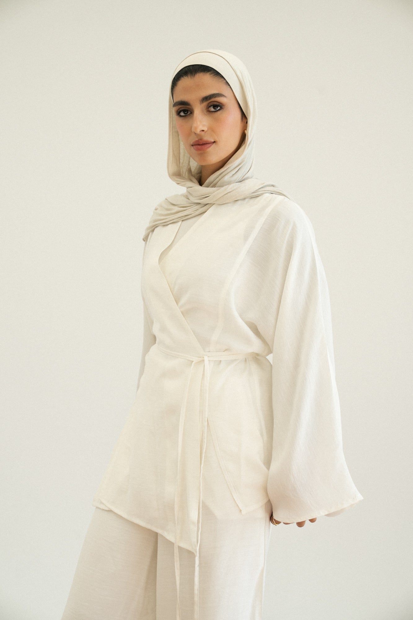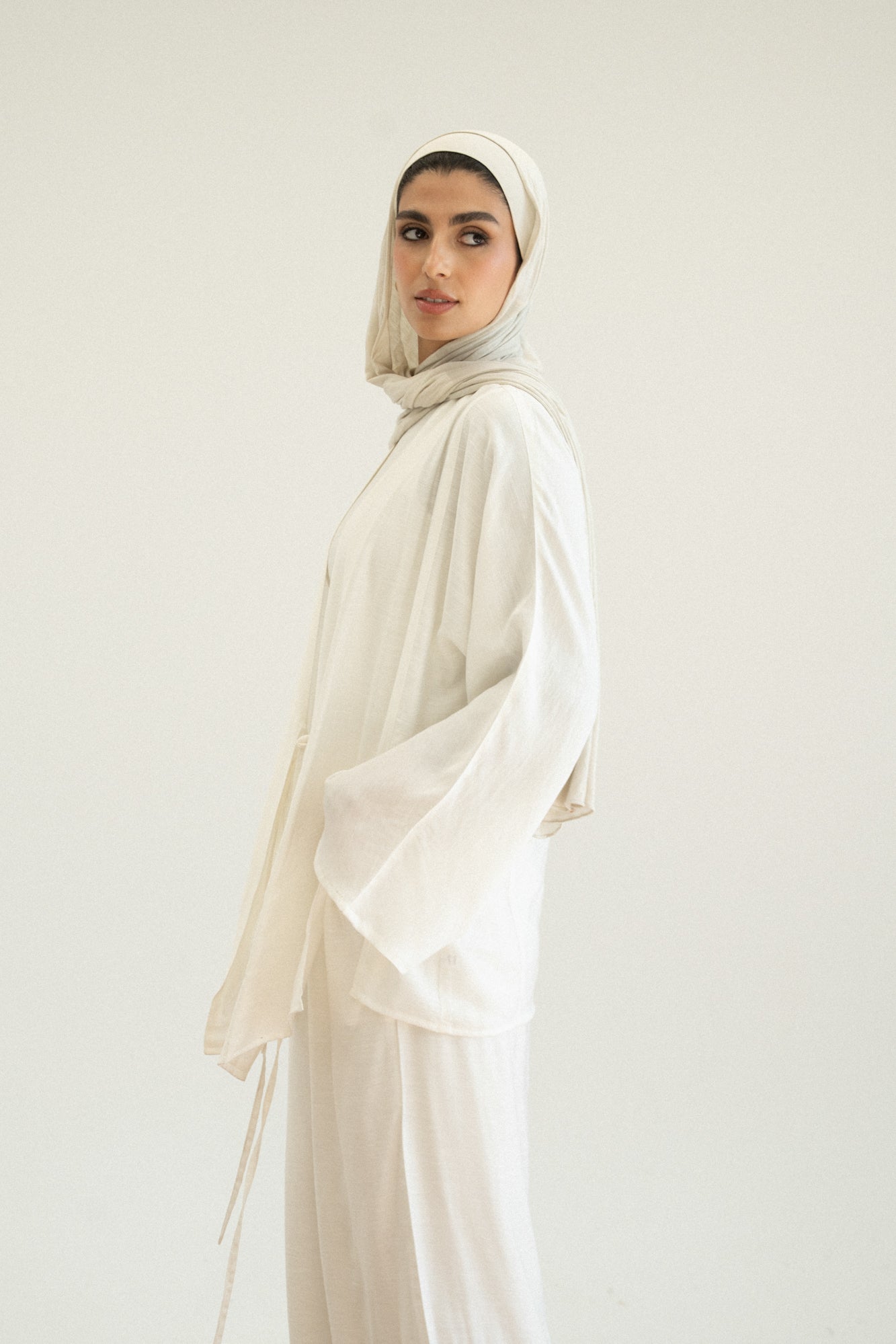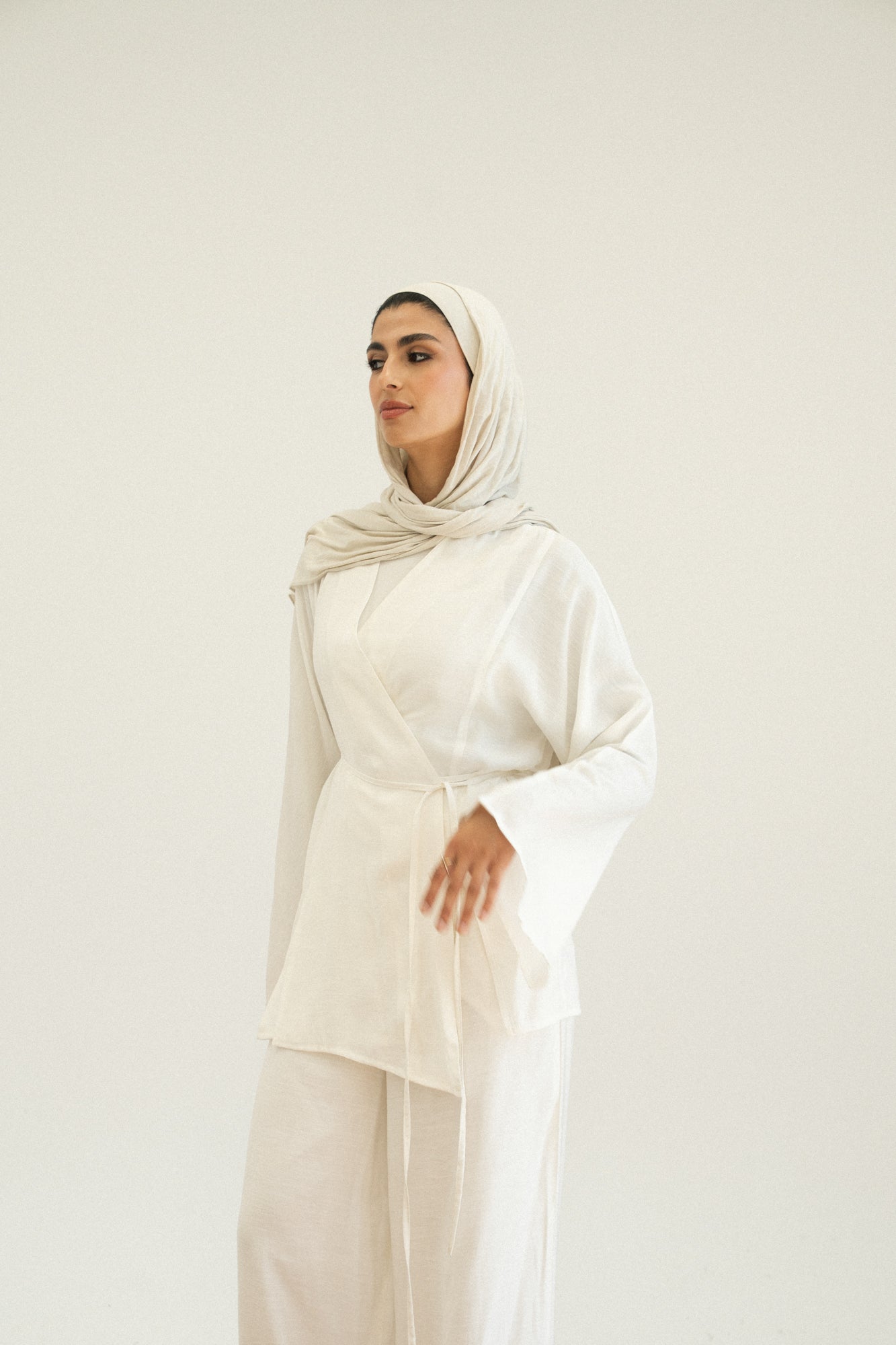 Includes wide-leg pants with a string-tied, elastic waist and a matching kimono featuring wide sleeves and adjustable front ties—ideal for relaxed days with a refined edge.