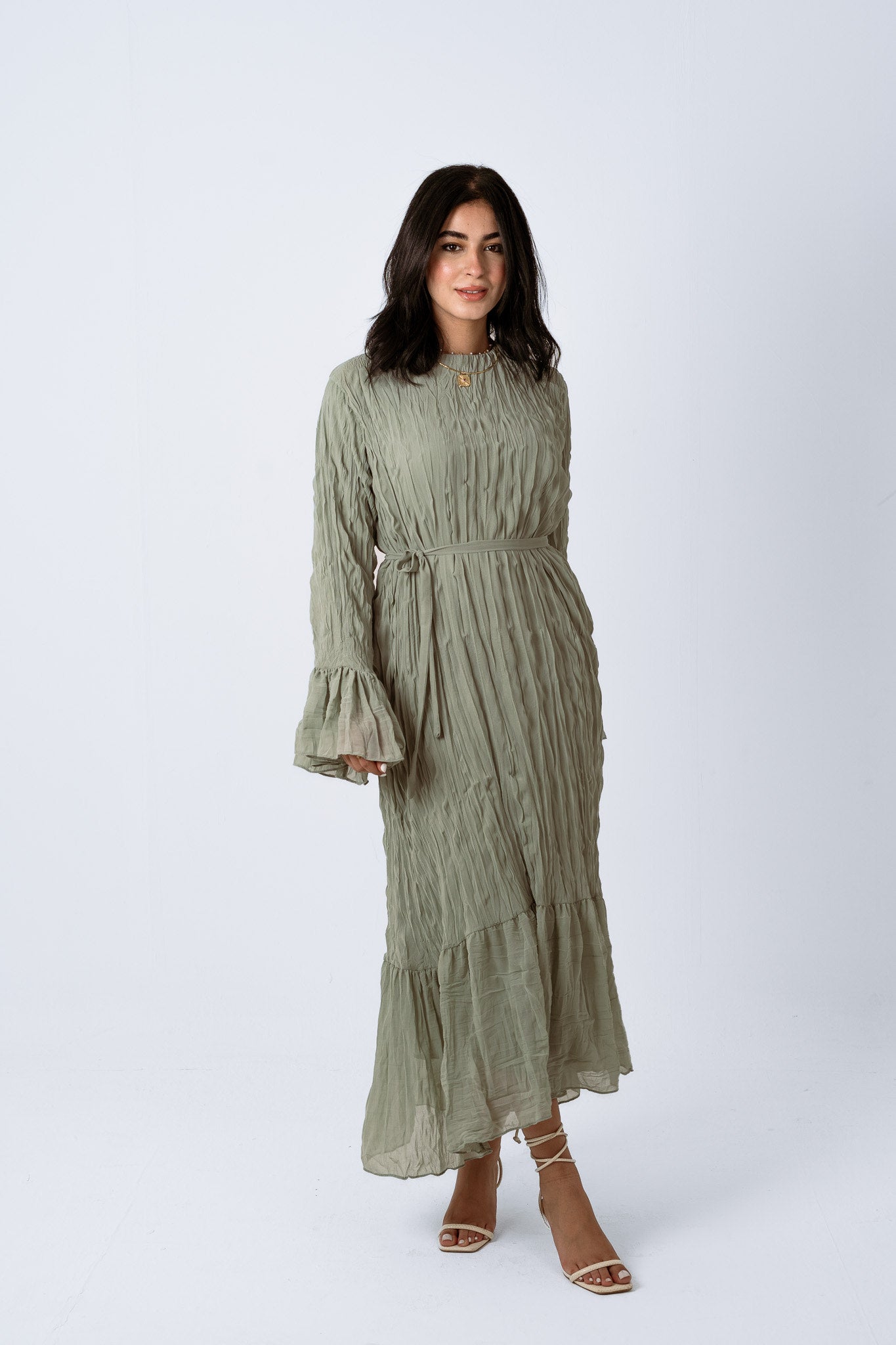 - Long sleeve pleated maxi dress in a lightweight chiffon.
