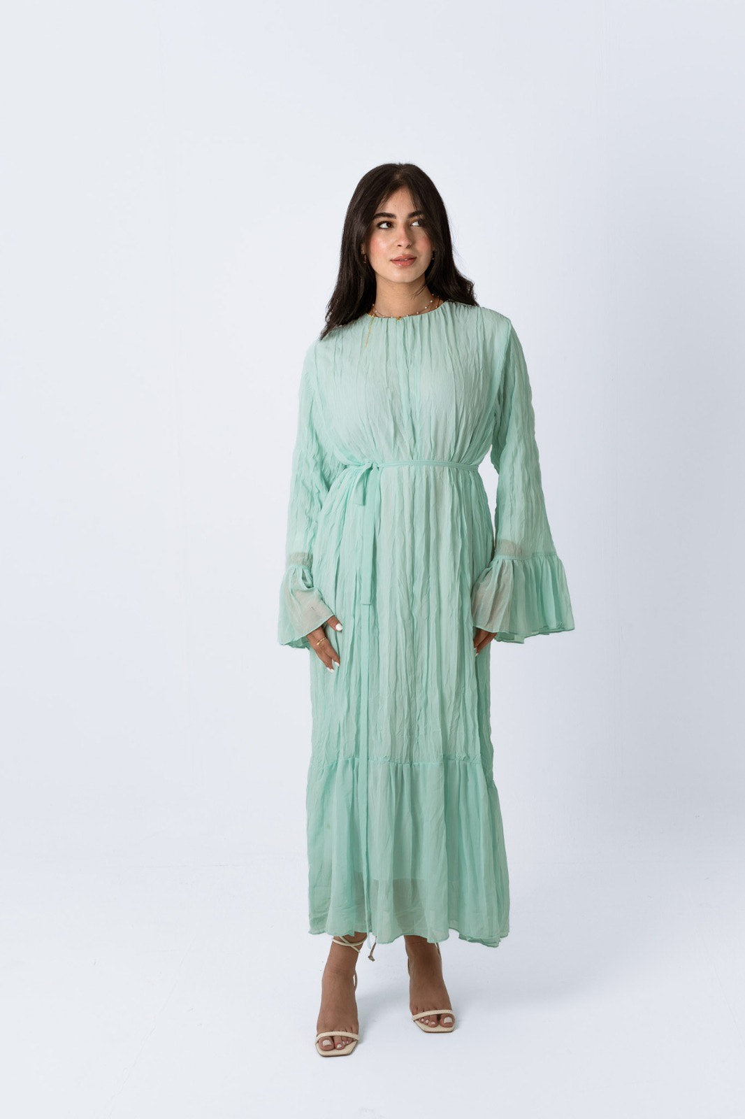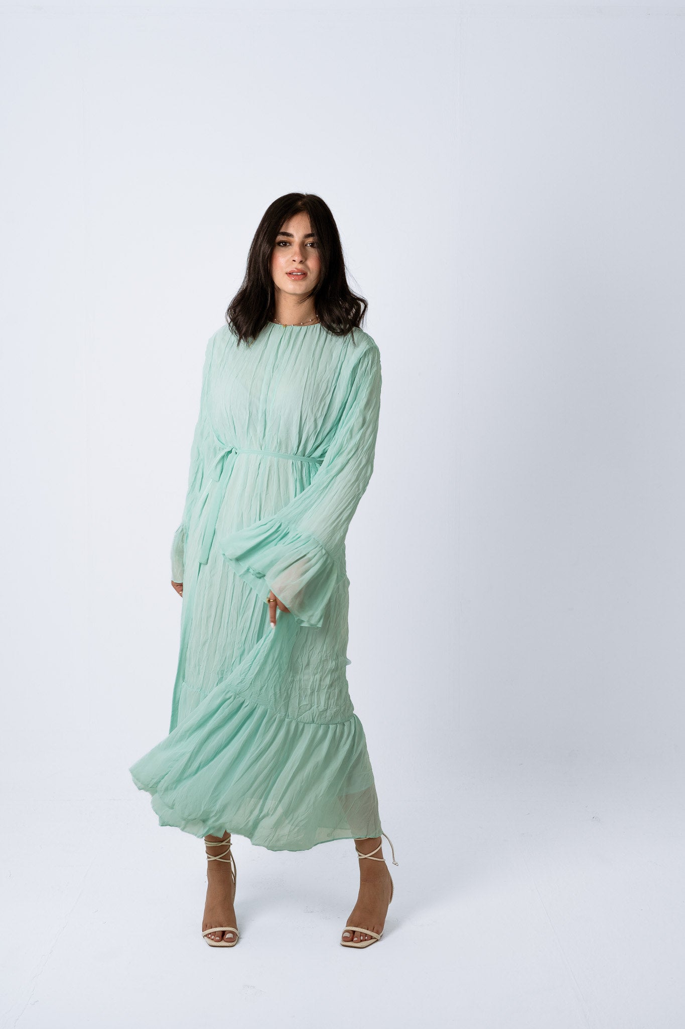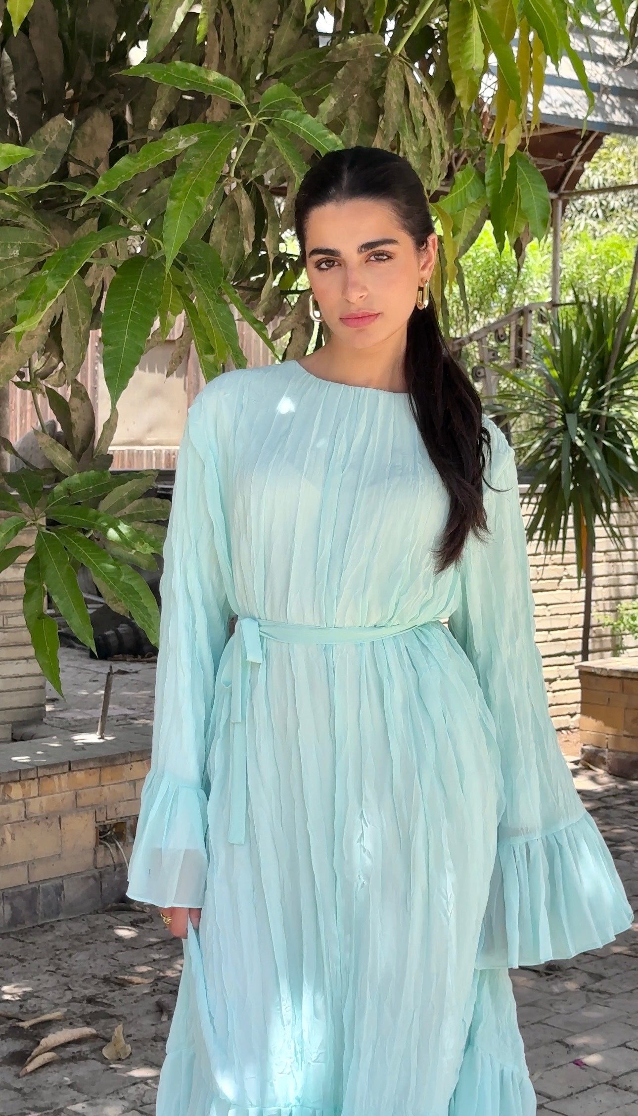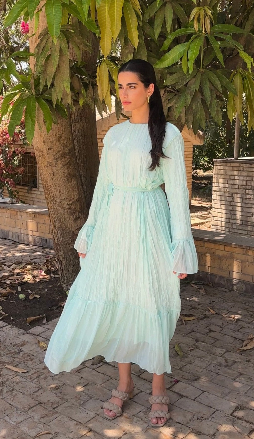 - Long sleeve pleated maxi dress in a lightweight chiffon.