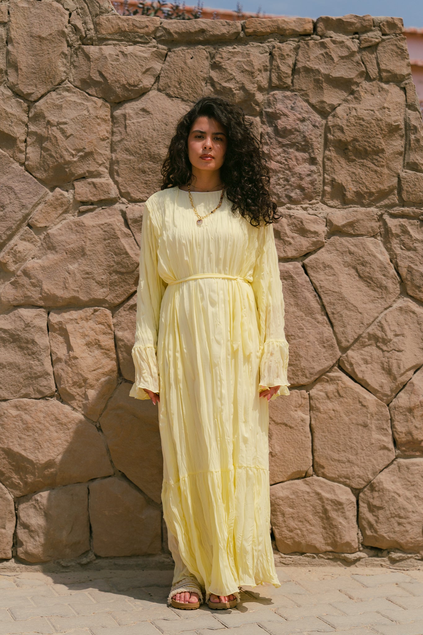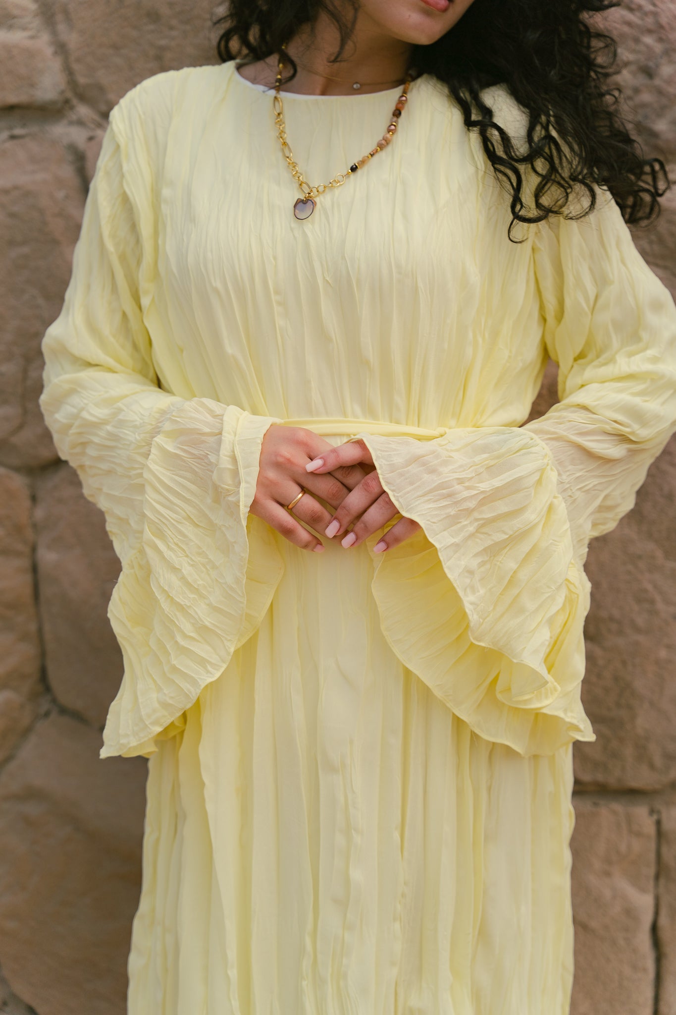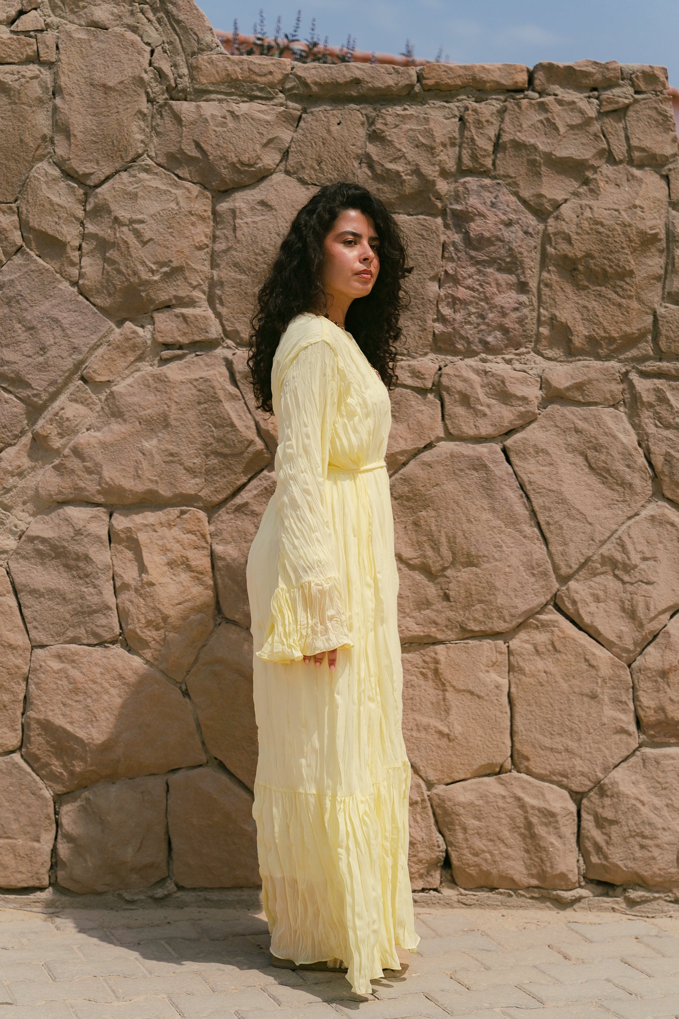 - Long sleeve pleated maxi dress in a lightweight chiffon.