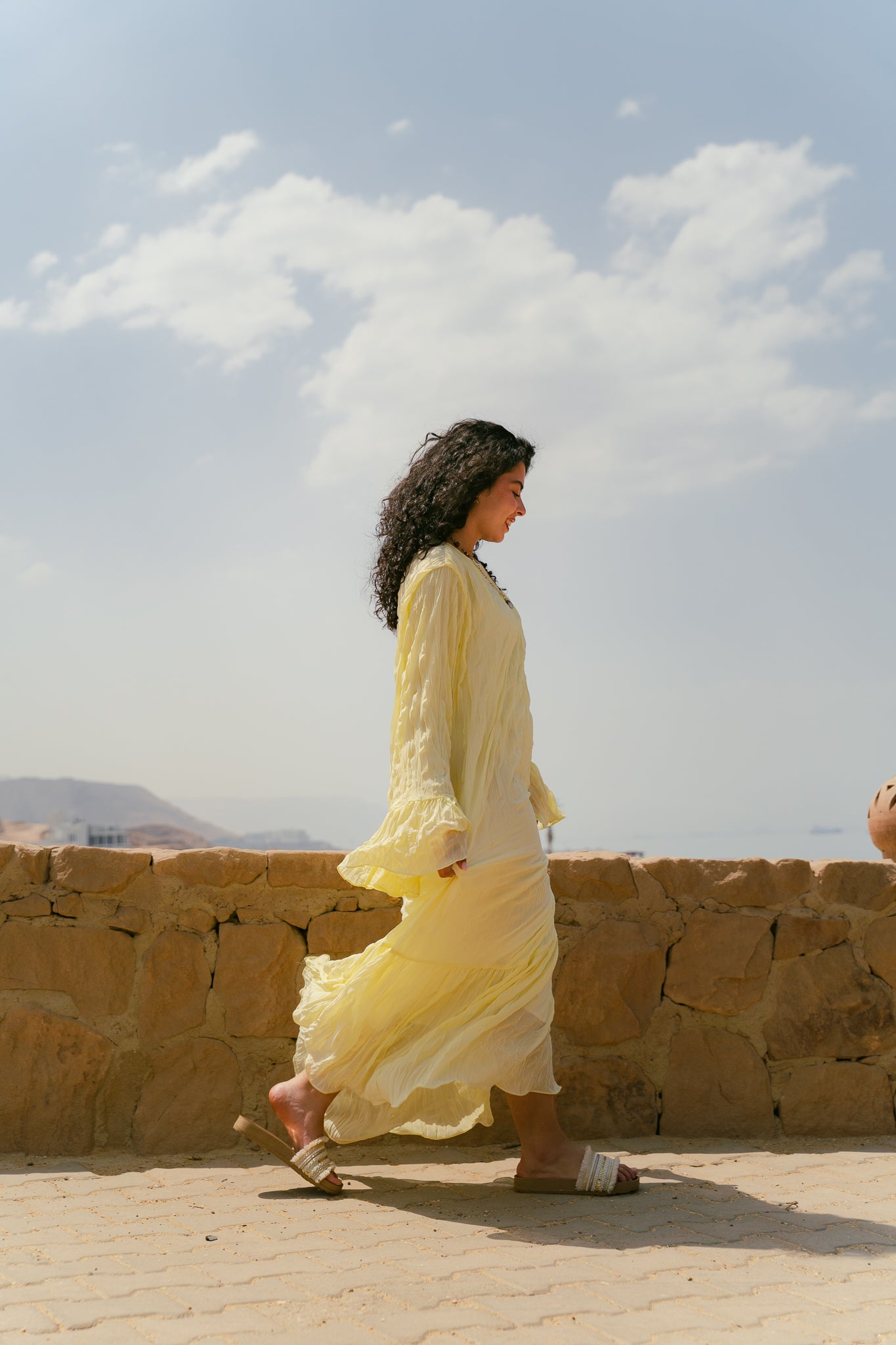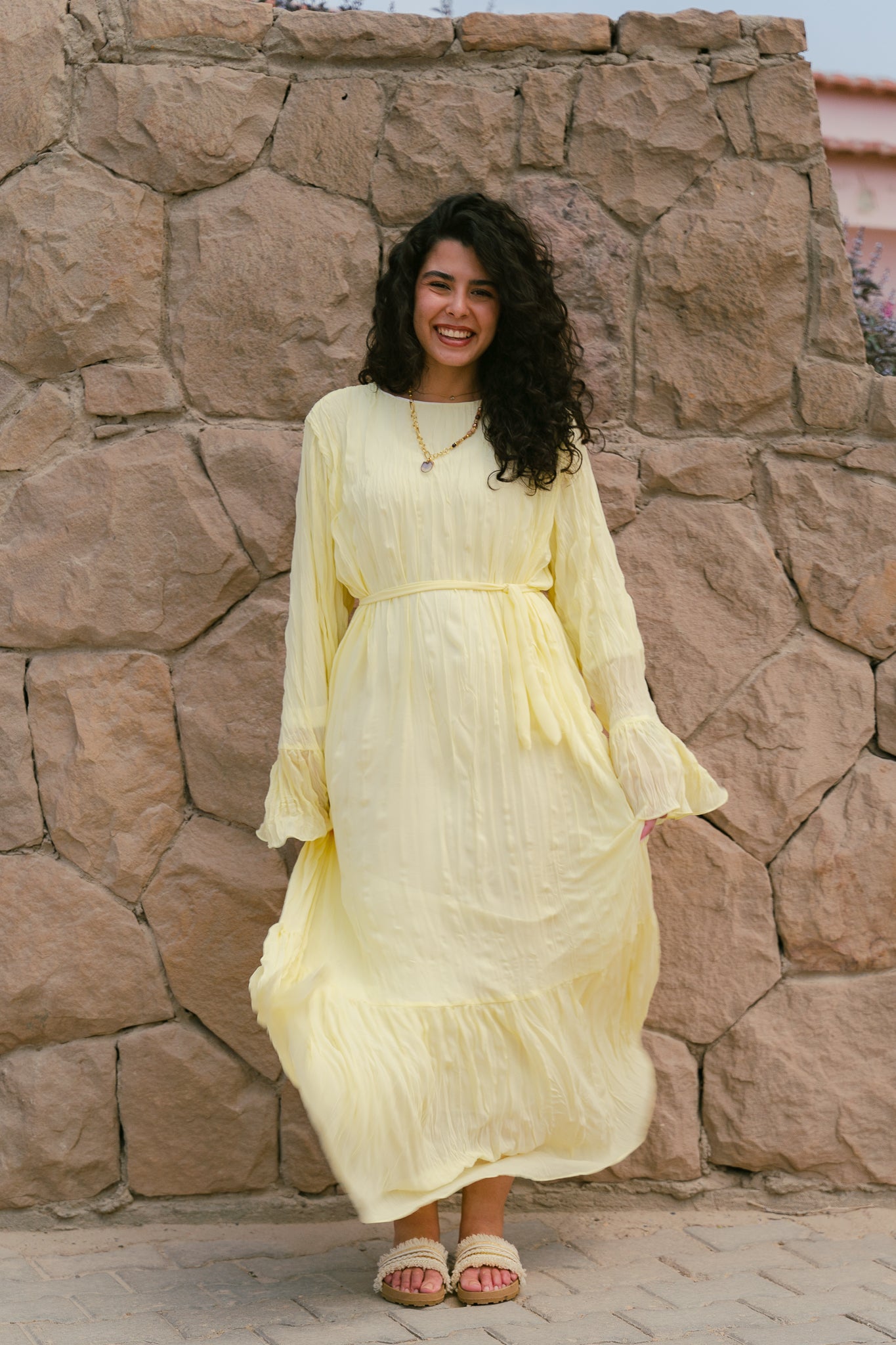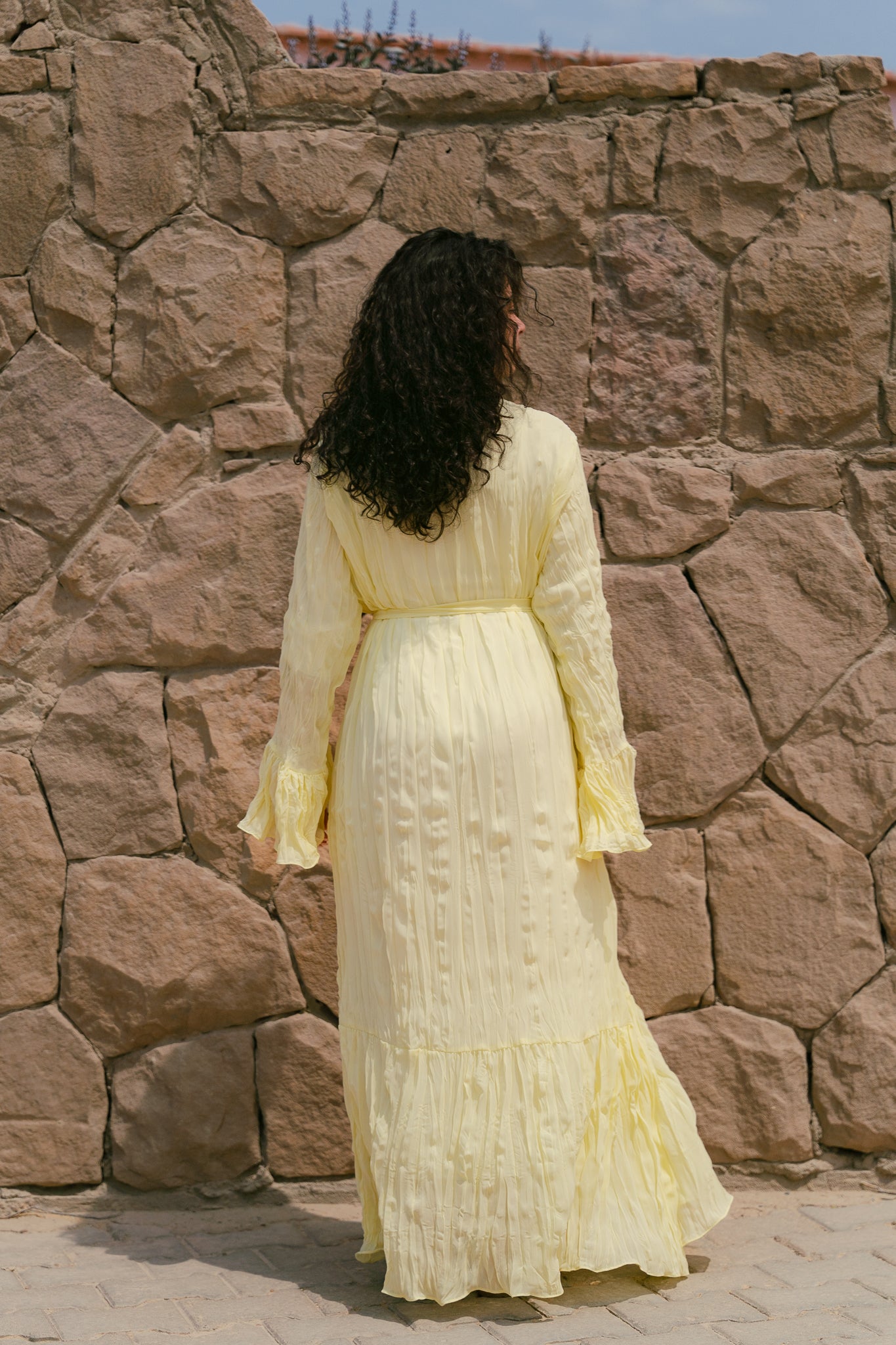- Long sleeve pleated maxi dress in a lightweight chiffon.