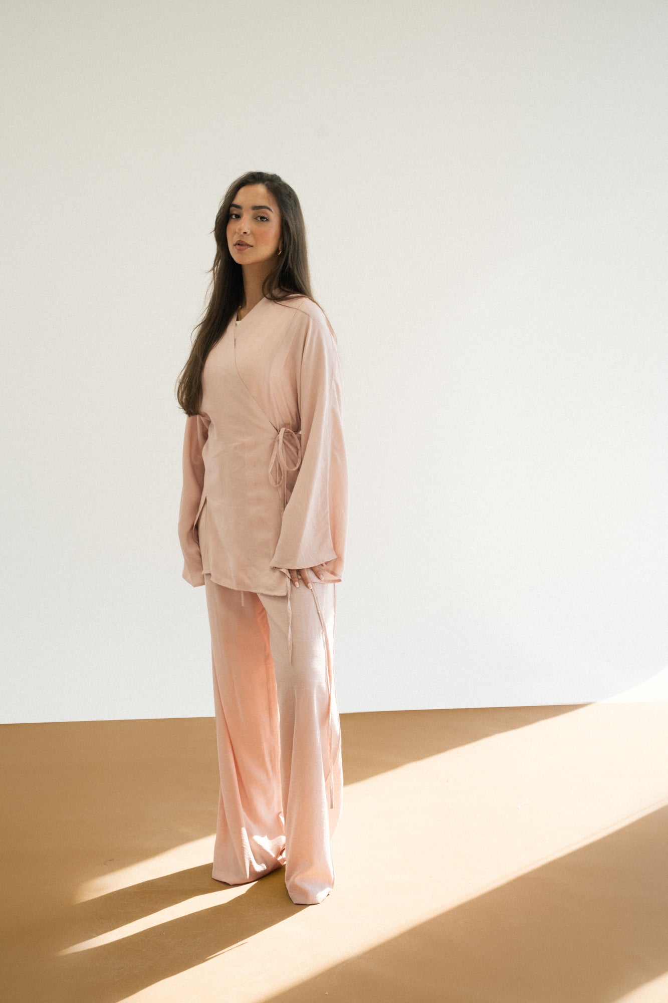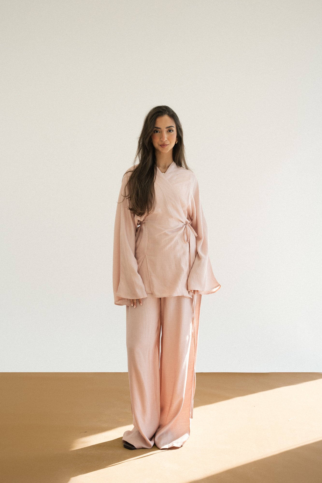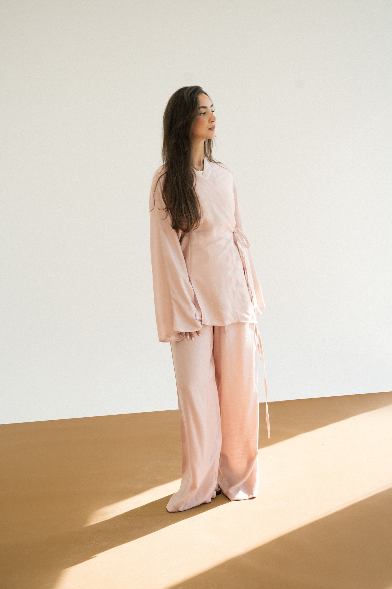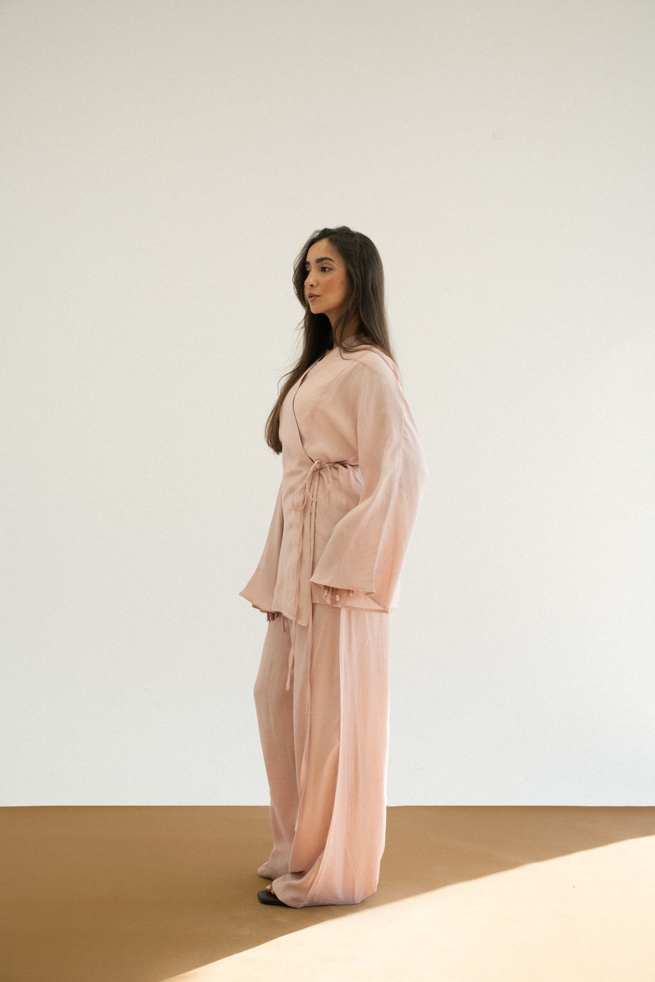 Includes wide-leg pants with a string-tied, elastic waist and a matching kimono featuring wide sleeves and adjustable front ties—ideal for relaxed days with a refined edge.
